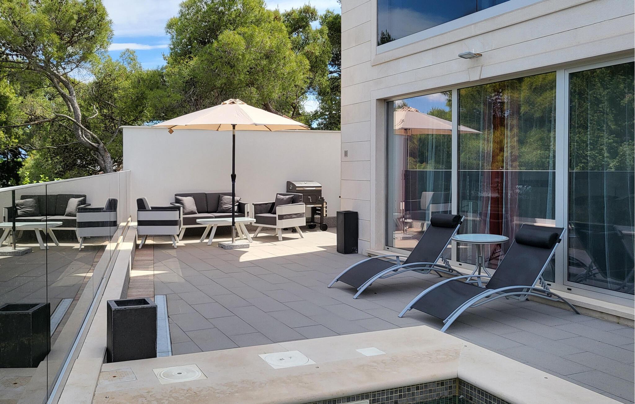 Lassen Sie den Alltag hinter sich, während Sie die frische Brise auf Ihrer großzügigen Sonnenterrasse genießen. Erfrischen Sie sich im privaten Pool, dessen Beleuchtung für stimmungsvolle Abende sorgt. Bereiten Sie leckere Grillgerichte in der modernen Outdoor-Küche zu.