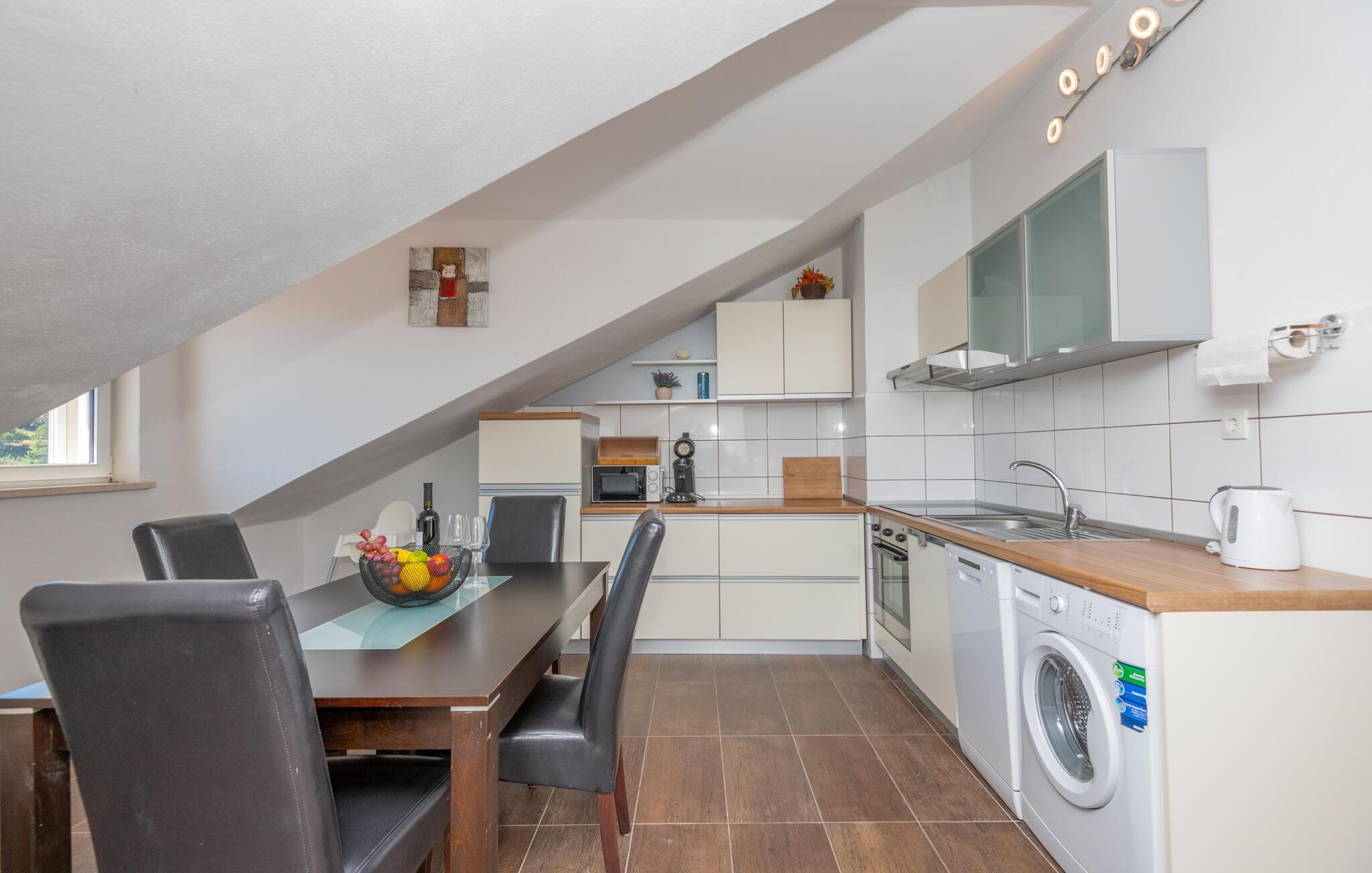 Willkommen in dieser schönen Dachgeschosswohnung, die mit einem großartigen Auge für dekorative Details eingerichtet ist. Entspannen Sie sich in der hellen Wohnung, legen Ihre Beine auf dem Sofa hoch oder kochen in der ansprechenden Küche. Ein schöner Balkon lädt zu ruhigen und erholsamen Abenden mit einem Glas Wein ein, während Sie auch die Nachmittage exklusiv am Pool und dem Wohnbereich dem Pool mit grill nutzen können.