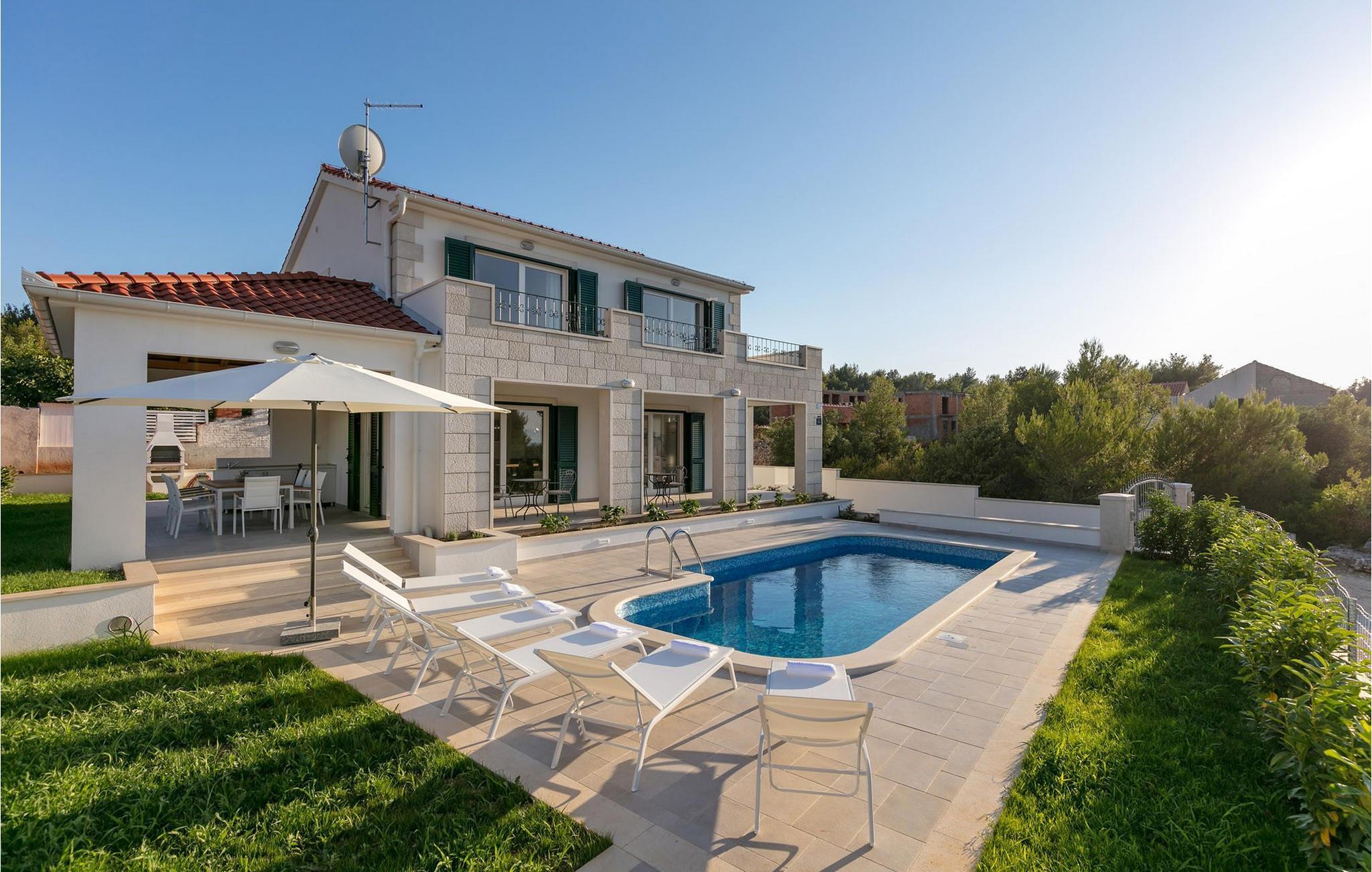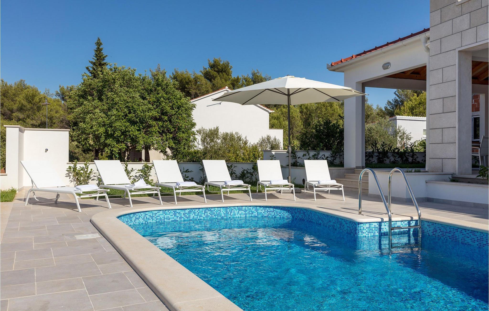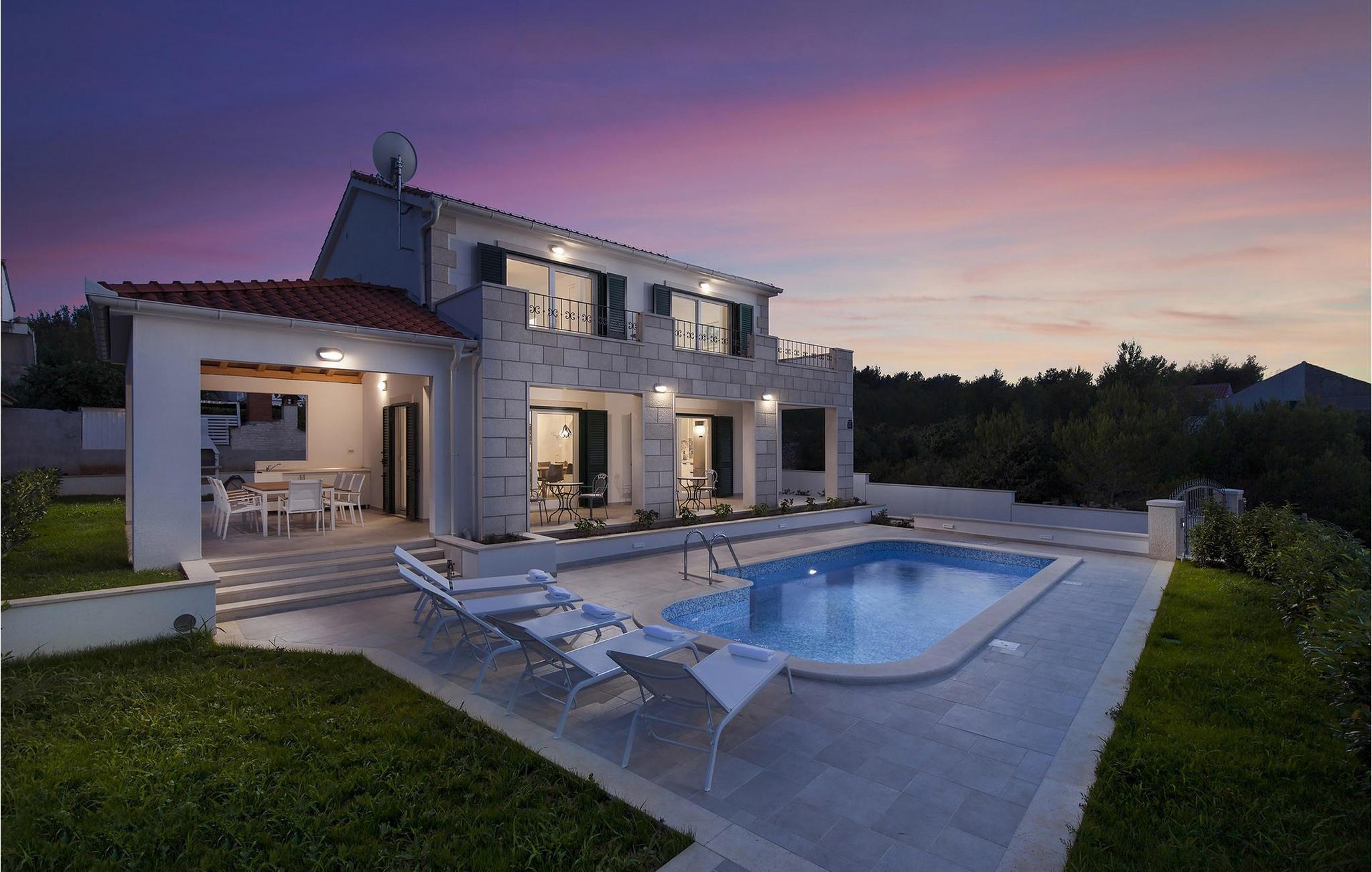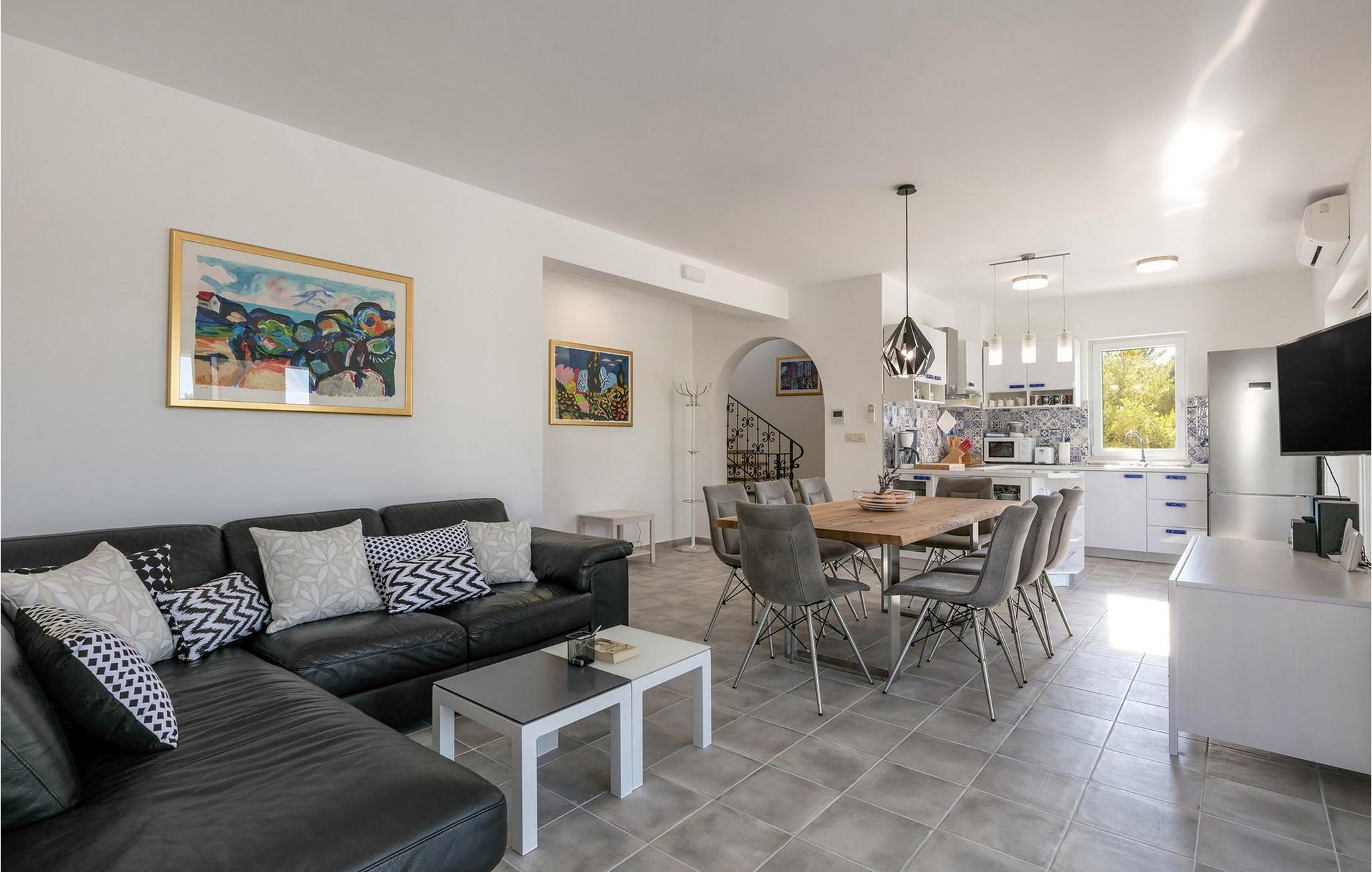Die bezaubernde Villa Makarac begrüßt Sie nur wenige Schritte vom Ufer der ruhigen, gleichnamigen Bucht entfernt und bietet Ihnen in idyllischer Lage Urlaub für Körper, Geist und Seele. Fühlen Sie sich im komfortablen, luftigen Interieur wie zu Hause, zaubern Sie kulinarische Highlights in der sonnendurchfluteten Küche und genießen Sie harmonische Mahlzeiten am stilvollen Esstisch. Während sich Ihre Kinder im Spielzimmer, an der Tischtennisplatte oder auf dem Trampolin austoben, können Sie anregende Gespräche bei einem Glas Wein führen.