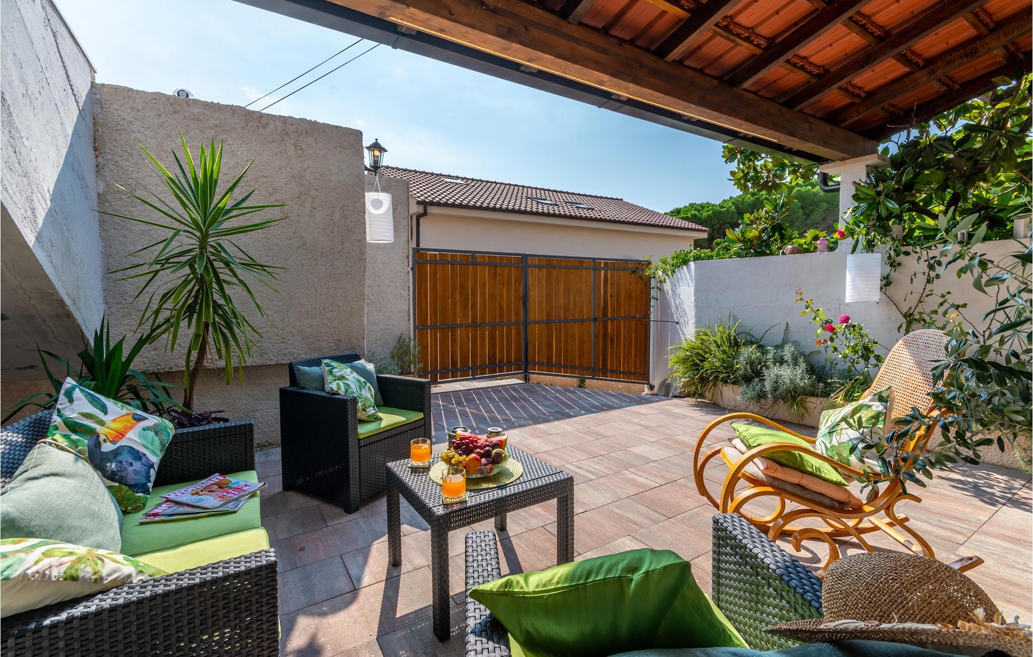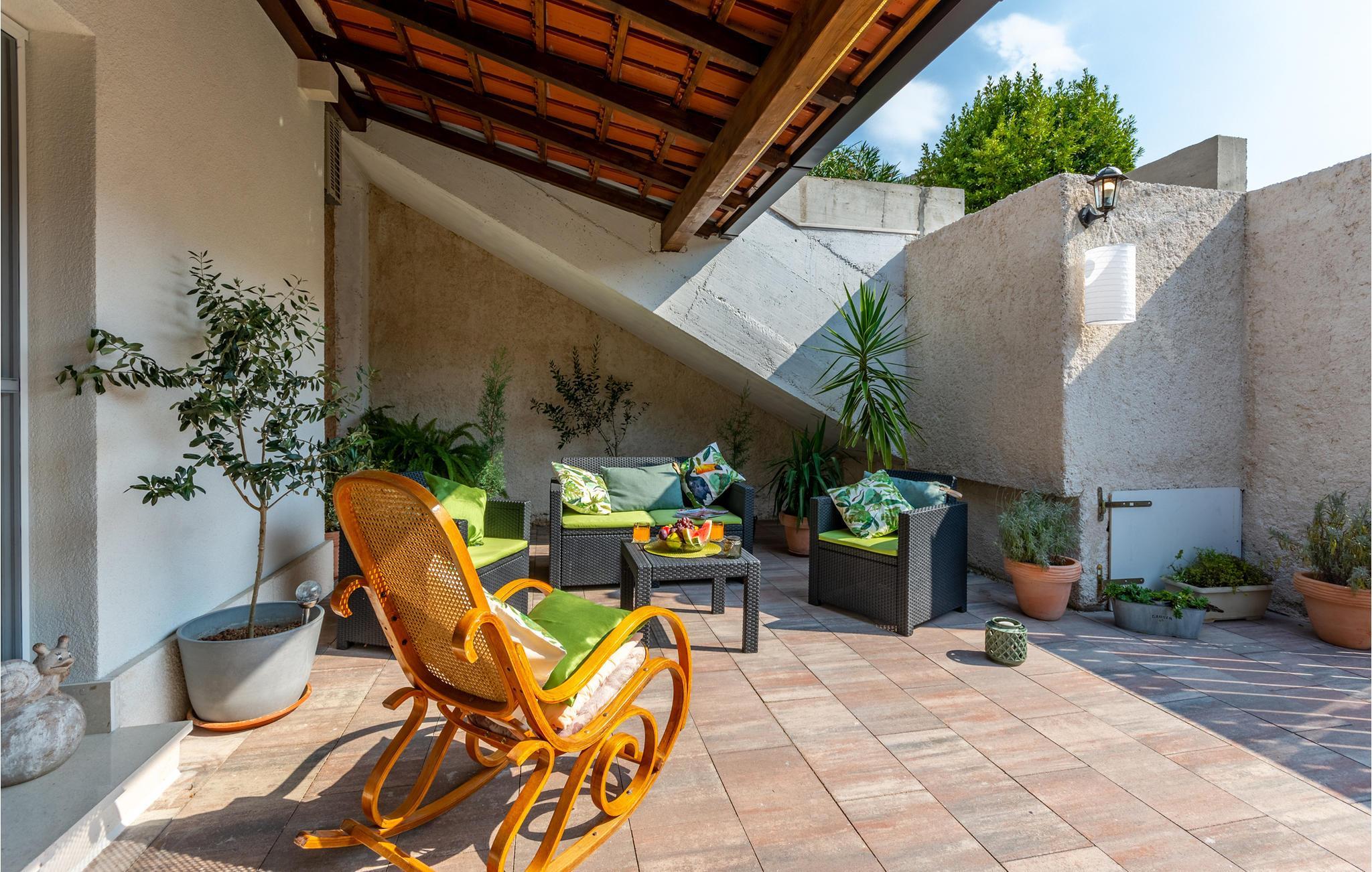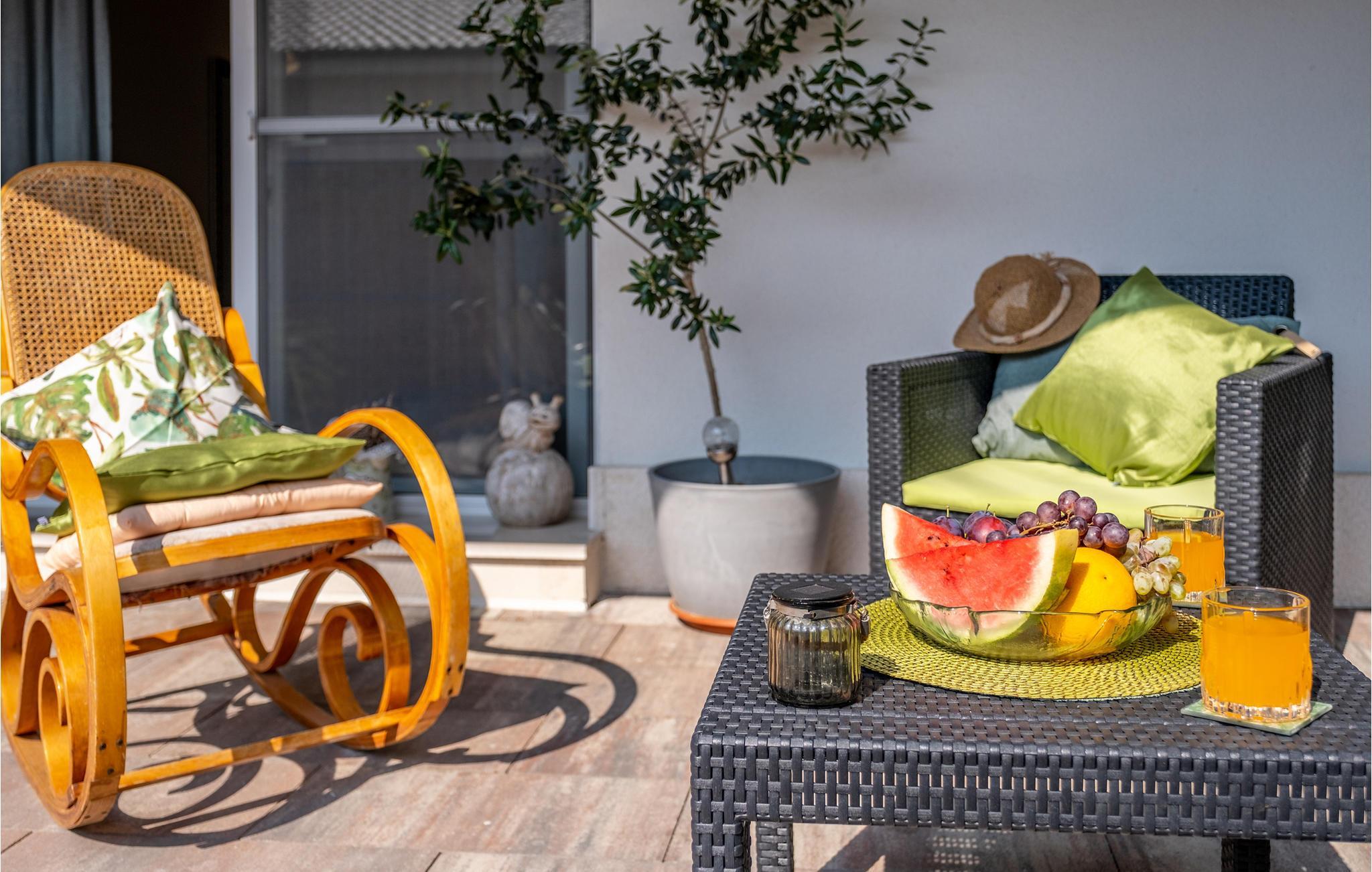 Vom Wohnbereich haben Sie Zugang zu einer offenen Terrasse, auf der Sie die Sonne genießen können. Auf dem Grundstück steht Ihnen ein Gemeinschaftsgrill zur Verfügung.