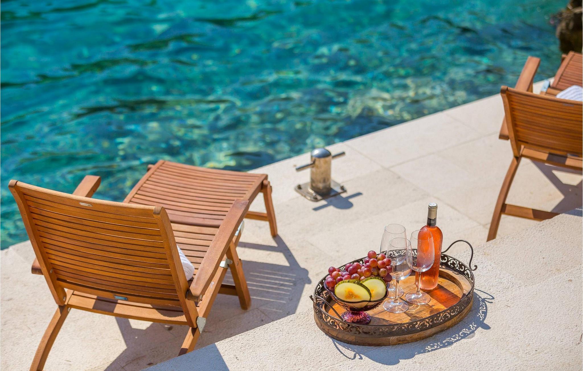 Auf der Terrasse genießen Sie entspannte Stunden im Whirlpool oder lassen den Blick über das glitzernde Meer schweifen. Wenige Treppenstufen trennen Sie von der Badeplattform und den Wellen des Meeres.