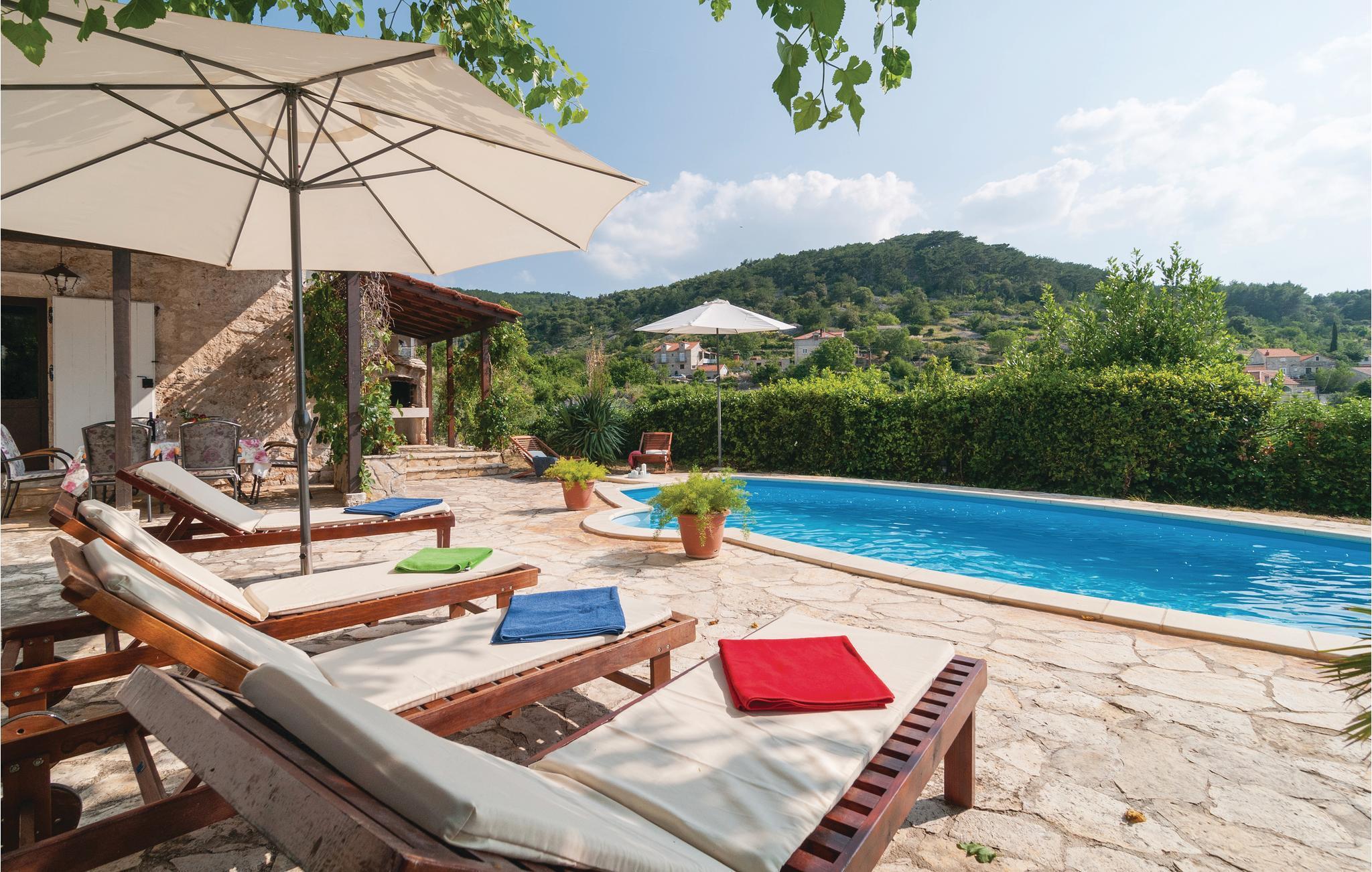 Dieses märchenhafte Ferienhaus befindet sich in einer ruhigen Lage inmitten des Ortes Nerezisce. Das Steinhaus wurde hochwertig renoviert und der ursprüngliche Charakter wurde bewahrt. Im Erdgeschoss befindet sich ein geschmackvoll eingerichteter Wohnraum mit Kamin. Die große und modern eingerichtete Küche ist getrennt vom Wohnteil. Vor dem Ferienhaus gibt es eine überdachte Terrasse, welche sich direkt neben dem Pool befindet. Schlafzimmer und Bad befinden sich im Obergeschoss. Das Ferienhaus liegt auf einem Grund mit einer privaten Kapelle. Die kleine St.-Joseph-Kirche gehört zur Familie des Hausbesitzers und kann besichtigt werden. Das Ferienhaus ist sehr gut für einen gemütlichen Familienurlaub geeignet. Nerezisce befindet sich im Innener der Insel Brac, die durch eine Kirche mit einem Pinienbaum auf dem Dach bekannt ist. Im größten Ort der Insel, Supetar, der 6 km entfernt liegt, bieten sich viele Freizeitmöglichkeiten. Aktivurlauber finden verschiedene sportliche Möglichkeiten im Ort Bol, der auch für seinen phantastischen Strand, Zlatni Rat, bekannt ist.