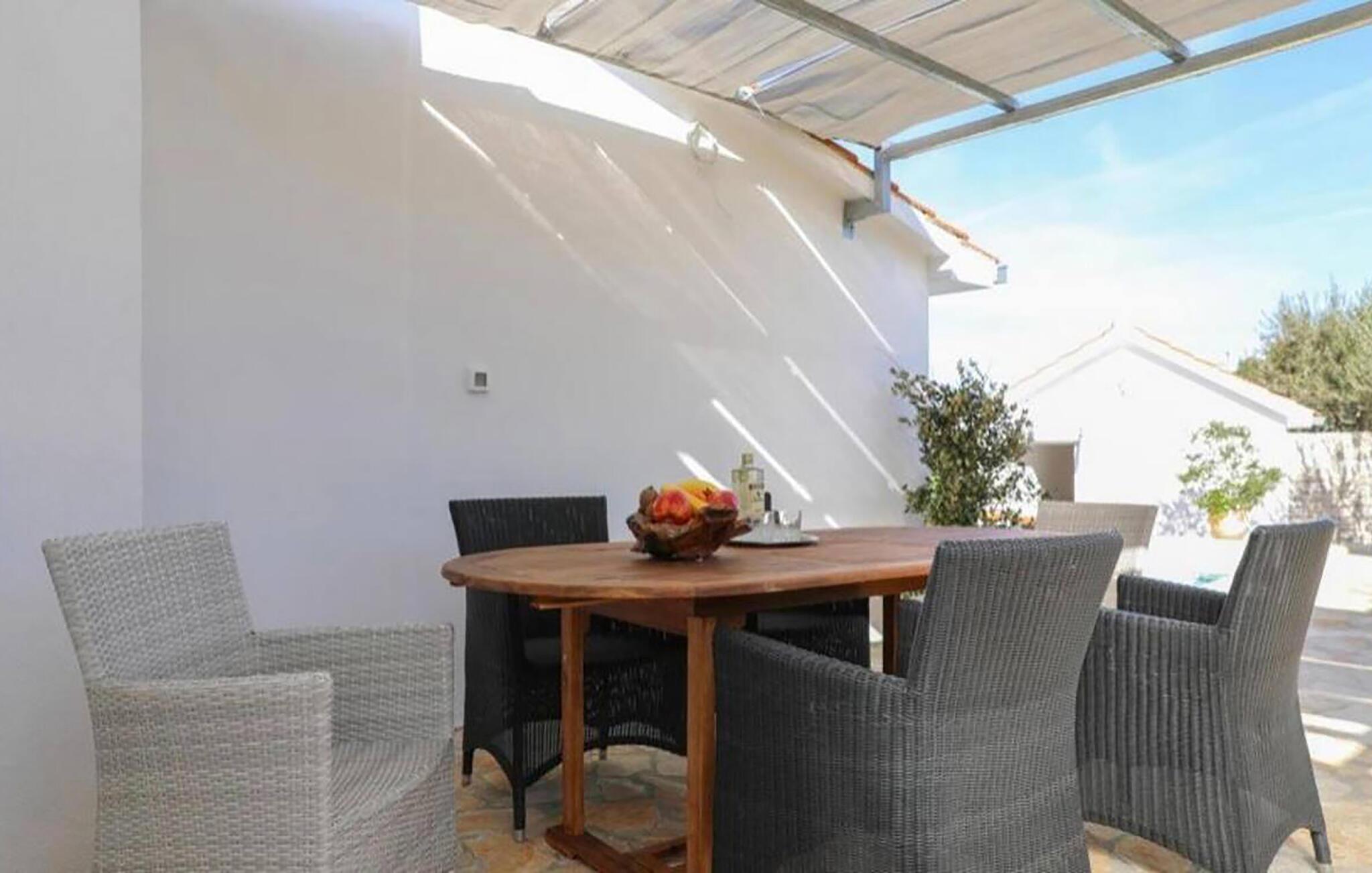 Beginnen Sie Ihren Tag mit einem erfrischenden Bad im privaten Pool, umgeben von einer sonnigen Terrasse mit bequemen Liegen. Nehmen Sie Ihr Frühstück im schattigen Essbereich im Freien ein, der sich ideal für gesellige Momente mit Familie oder Freunden eignet. Die mediterrane Umgebung mit Olivenbäumen und Steinmauern schafft eine authentische und idyllische Atmosphäre.