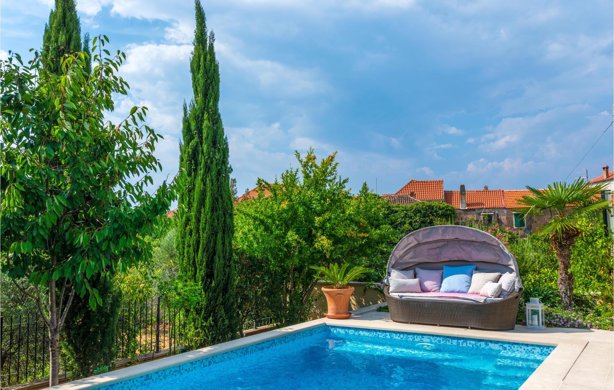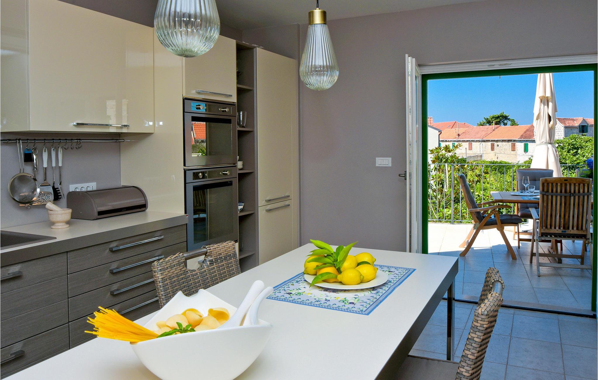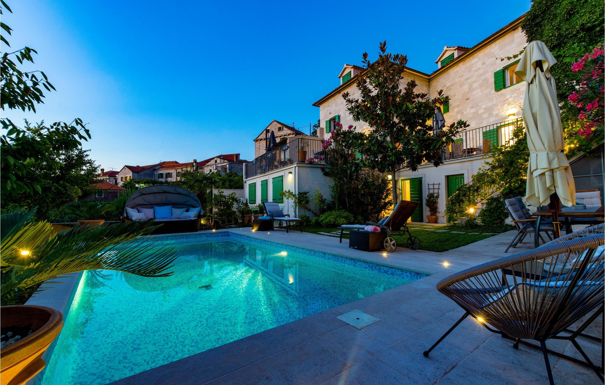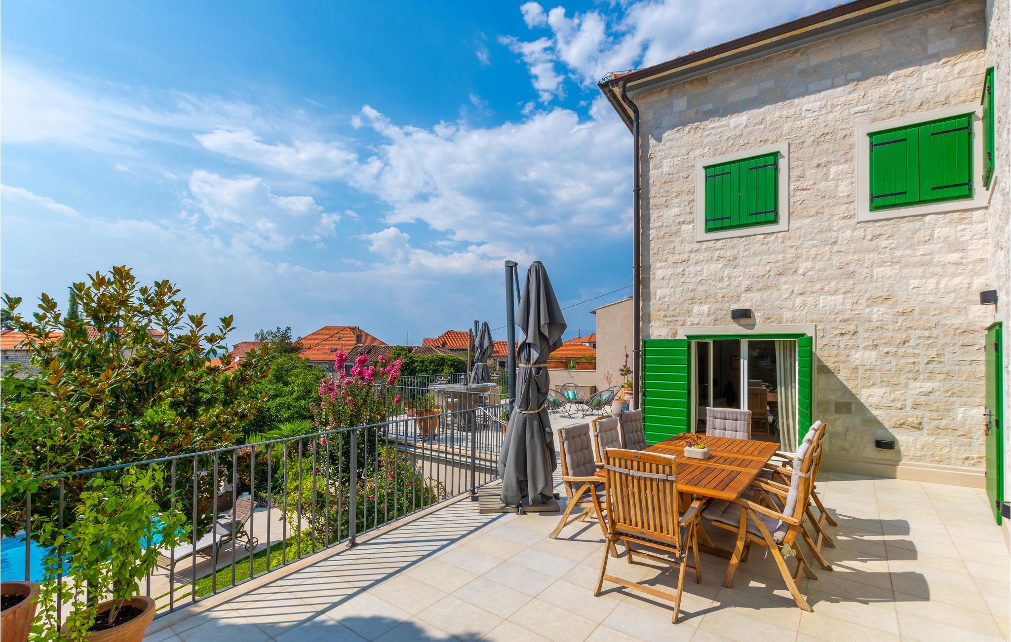 Prächtiges Ferienhaus mit Pool, vier Schlafzimmern und vier Bädern. Es ist eine ausgezeichnete Wahl für einen unvergesslichen Urlaub für Familien mit Kindern oder Gruppen von Freuden. Es liegt auf der Insel Brac, im Ort Postira und bietet außergewöhnlichen Komfort mit schöner Einrichtung im Innen und Außenbereich. Das Anwesen liegt nahe am Meer und Stadtzentrum, so dass Geschäfte, Restaurants, Märkte, Apotheke, Klink und Kinderspielplatz in Reichweite sind. Im fast 100 m² großen Erdgeschoss befindet sich eine Küche mit Essbereich, die mit dem großen Wohnzimmer verbunden ist. Von dort aus gelangen Sie auf die geräumige Terrasse, die mit angenehmen Gartenmöbeln ausgestattet ist und von der sich ein Blick auf den Pool und hübsch angelegten Garten bietet. Im ersten Stock befinden sich die Schlafzimmer, wobei die Schlafzimmer Nr. 1 und Nr. 4 ein eigenes Bad haben. Im Garten mit mediterranen Pflanzen und viel Grün gibt es auch einen Grill, auf dem Sie köstliche Mahlzeiten zubereiten und die frische Luft in geselliger Runde genießen können. Im Untergeschoss des Hauses, das durch Außentreppen zugänglich ist, steht Ihnen eine authentische dalmatinische Konoba mit Kamin und voll ausgestatteter Küche zur Verfügung. Empfehlenswert ist ein Besuch der berühmten Sandstrandbucht Lovrecina, die ca. 2 km entfernt liegt, sowie ein Besuch des berühmtesten Strandes Dalmatines, der Zlatni Rat in Bol.
