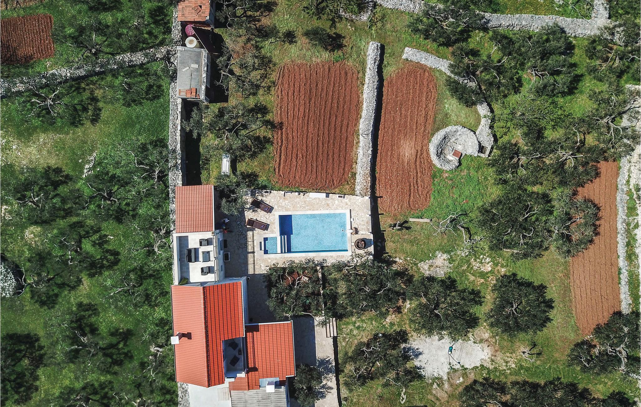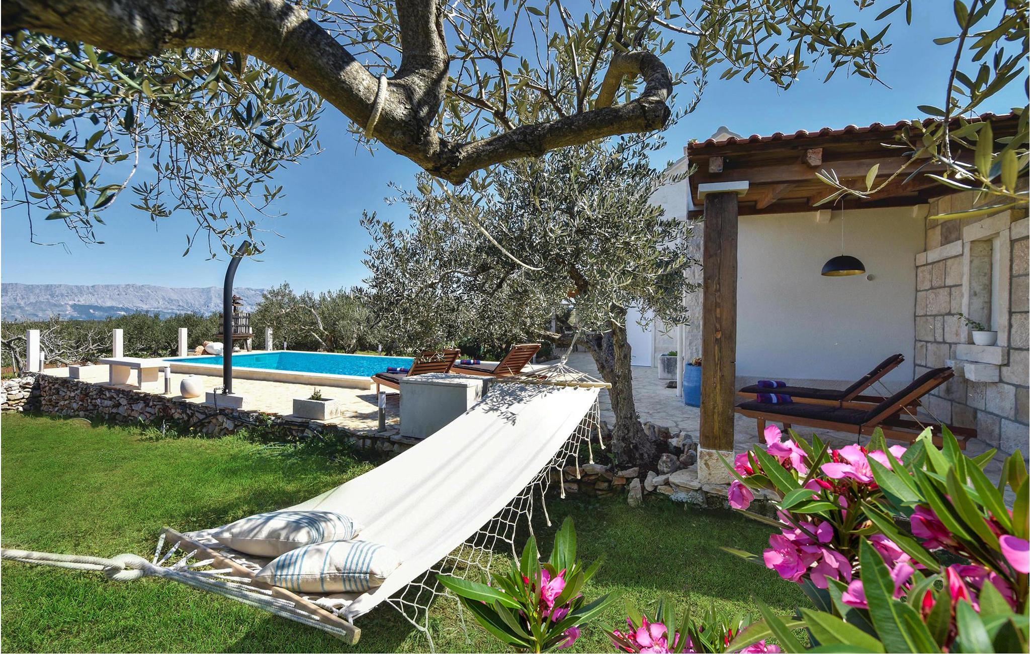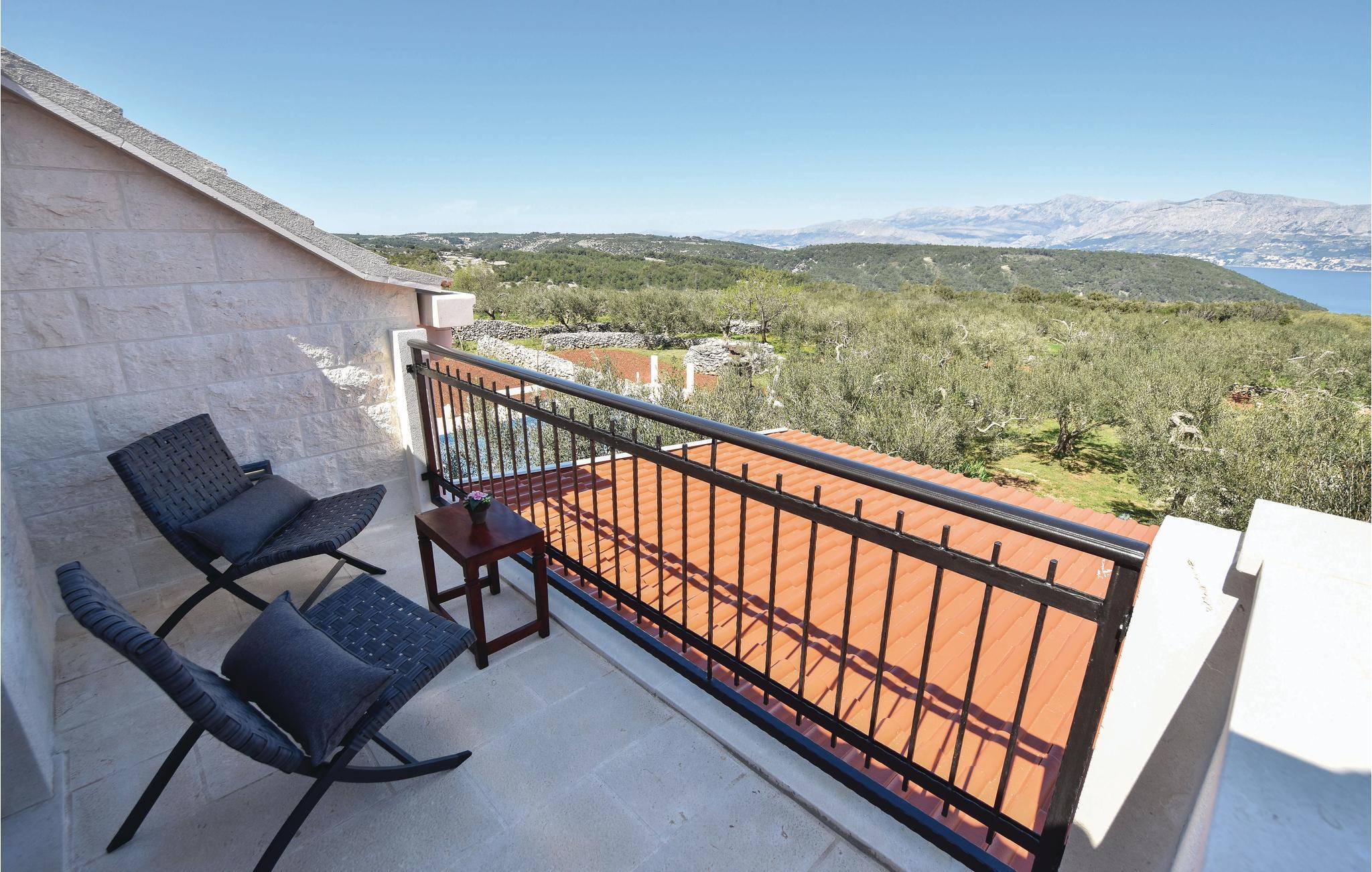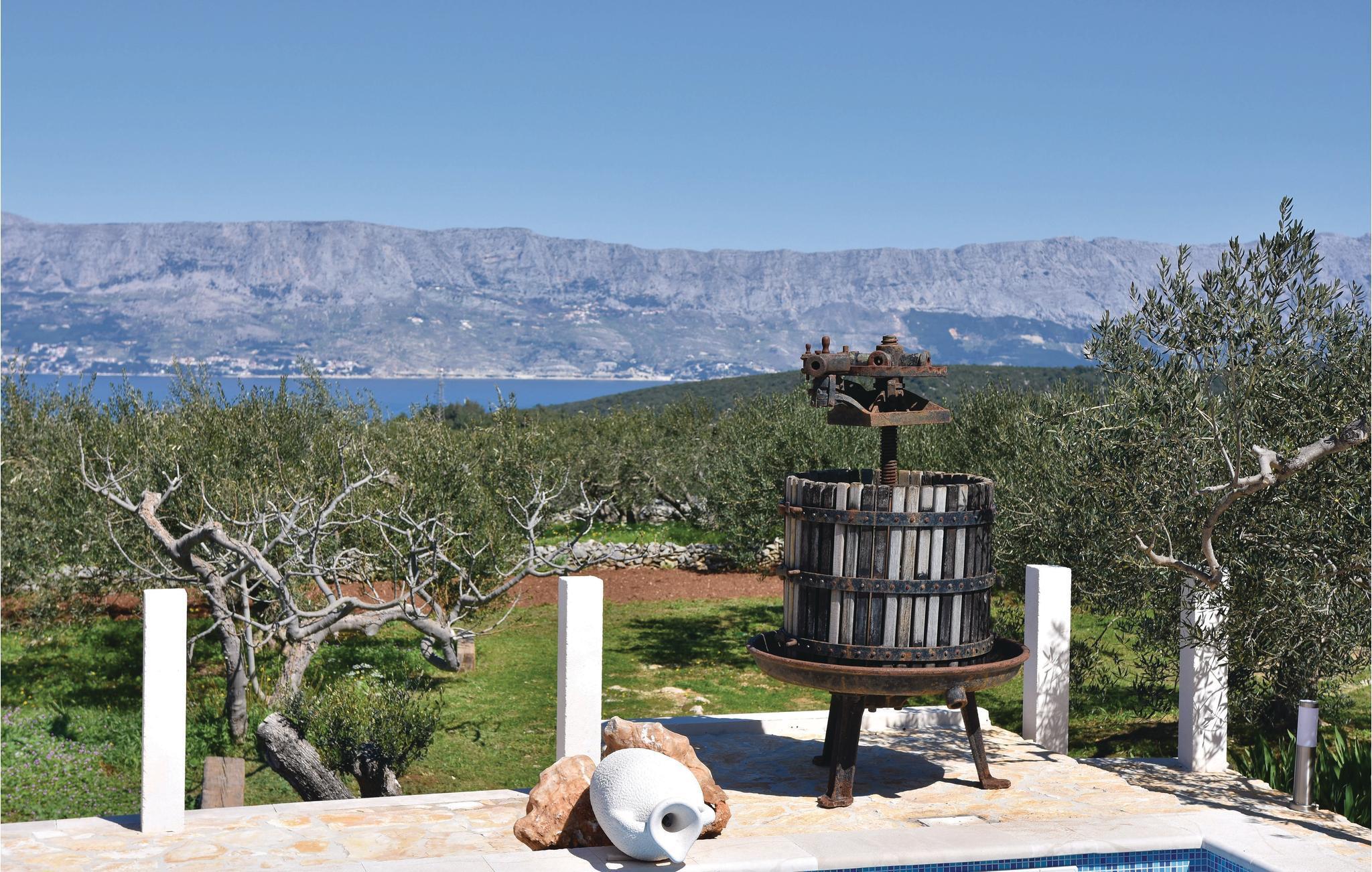 Auf der Insel Brac, oberhalb des malerischen Ortes Pucišca, befindet sich dieses neuwertige Ferienhaus mit Pool. Es liegt auf einem weitläufigen Anwesen von ca. 10.000 m², von dem sich eine wunderbare Aussicht auf das Meer und die Berge bietet. Die Insel ist weithin bekannt für ihren hochwertigen Kalkstein, der schon seit der Antike abgebaut wird. Das umzäunte und gepflegte Grundstück liegt in ruhiger Umgebung, fernab vom Lärm der Stadt und es ist von Olivenhainen umgeben. Behaglicher Komfort wird im Inneren geboten. Im Erdgeschoss sind eine Küche mit Essbereich, ein Badezimmer, sowie ein Wohnzimmer mit Ausgang zur überdachten Terrasse mit Kamin vorhanden. Im ersten Stock sind zwei Schlafzimmer (Dachschräge auf ca. 160 cm). Das Schlafzimmer Nr. 3 verfügt über ein eigenes Badezimmer und liegt im Erdgeschoss mit separatem Eingang. Der erfrischende Pool, Sonnenbereich und die Außendusche eignen sich zum Wohlfühlen und Entspannen, während Badminton und zwei Fahrräder für zusätzlichen Spaß im Urlaub sorgen. Zufahrt auf den letzten 500 m ein Schotterweg.