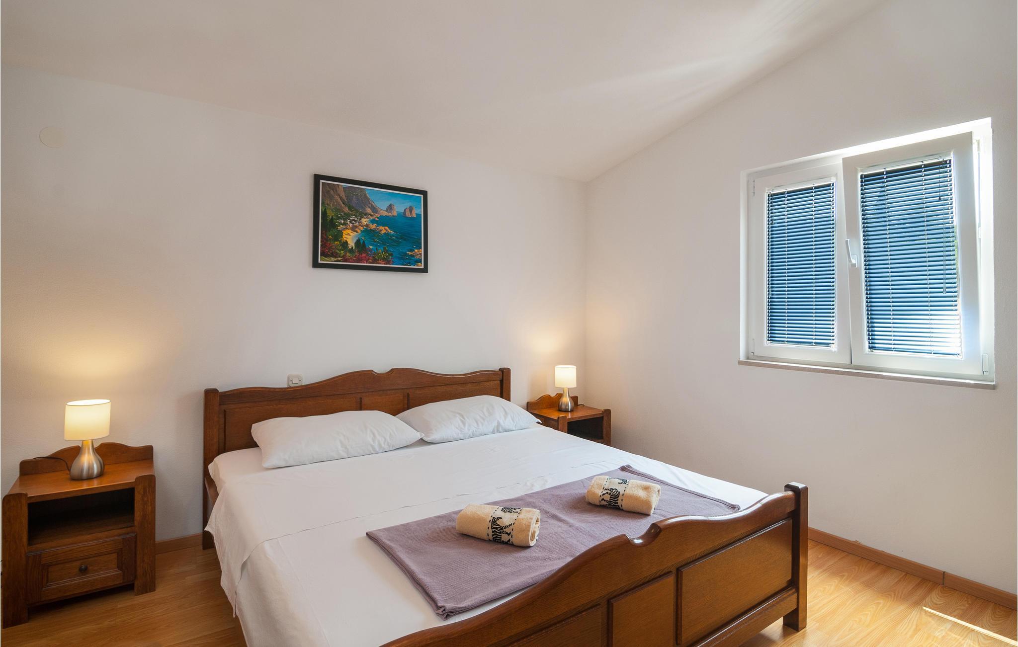 Die Wohnung begrüßt ihre Gäste im 2. Stock eines Hauses und bietet mit einem Doppelbett im Schlafzimmer sowie 2 weiteren Schlafplätzen im Wohnzimmer Platz für4 Personen. Die Einrichtung ist funktional, Sie finden hier alles, was Sie für den Urlaub brauchen. Eine Klimaanlage sorgt für angenehme Temperaturen in den Sommermonaten.