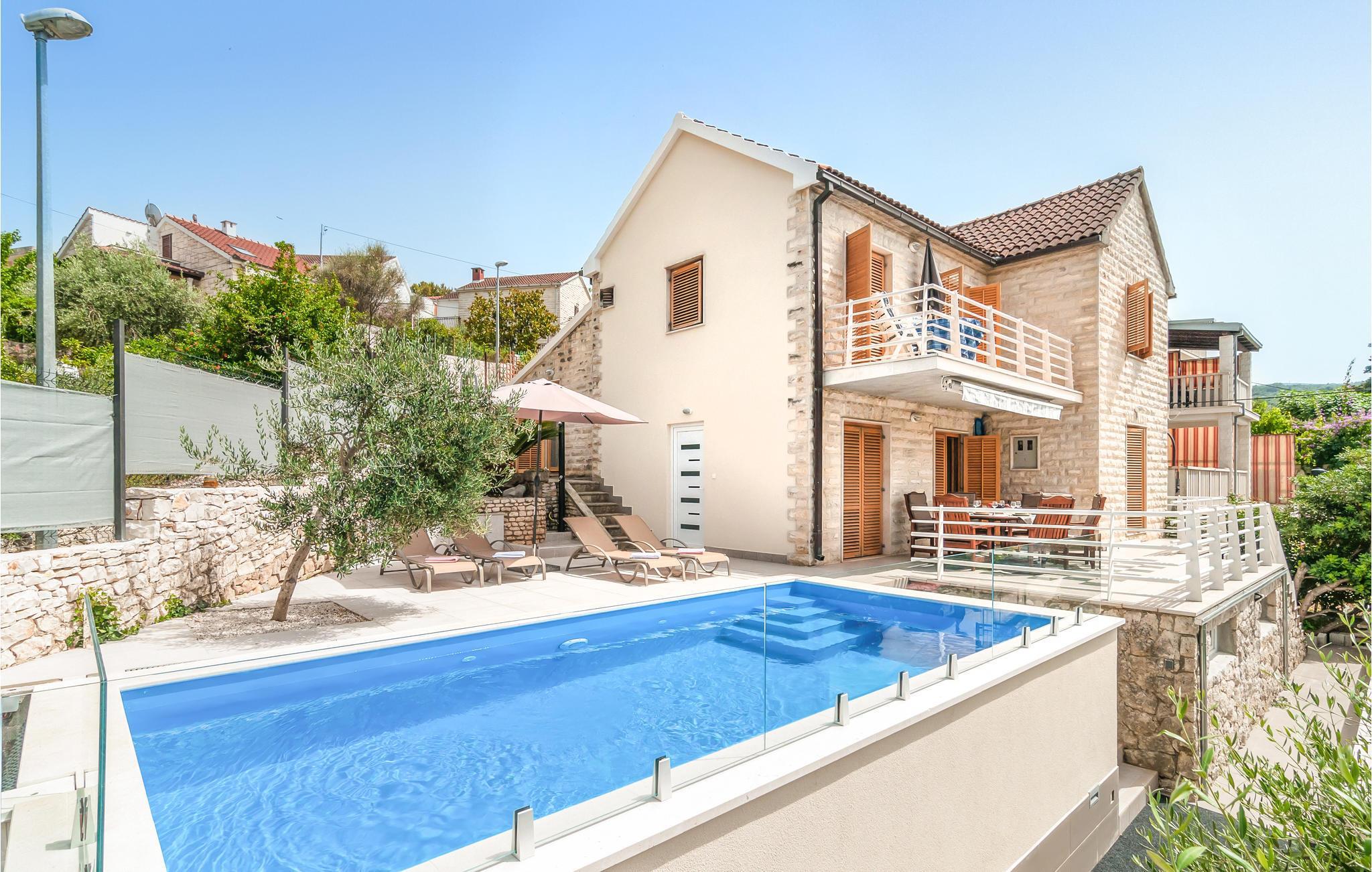 Genießen Sie einen tollen Meerblick von der Terrasse dieses Ferienhauses mit Pool.
