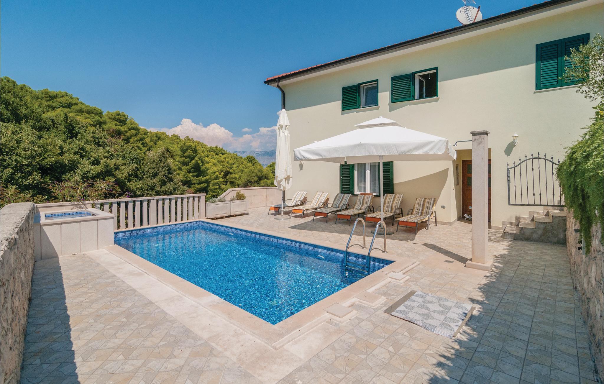 Verbringen Sie Ihren Urlaub in mediterraner Atmosphäre auf der Insel Brac, umgeben von unberührter Natur und Olivenbäumen in einem wunderschönen Steinhaus im Dorf Splitska. Das Haus erstreckt sich über fünf Schlafzimmer und fünf Badezimmer, einem Wohnzimmer mit Küche sowohl im Erdgeschoss wie auch im ersten Stock. Aus dem Wohnzimmer und der Küche gibt es einen Ausgang zur Terrasse, die zum Entspannen einlädt. Auf der Terrasse mit Grill im Freien können Sie in Gesellschaft Ihrer Liebsten köstliche Mahlzeiten zubereiten. Der Pool neben dem Haus ist vor neugierigen Blicken geschützt. Wir empfehlen Ihnen auf jeden Fall, die Sandbucht Lovrecina in einer Entfernung von ca. 5 km von der Unterkunft zu besuchen und die nahen Fels- und Kiesstrände zu genießen. Zum Haus führt eine 100 m nicht asphaltierte Straße.