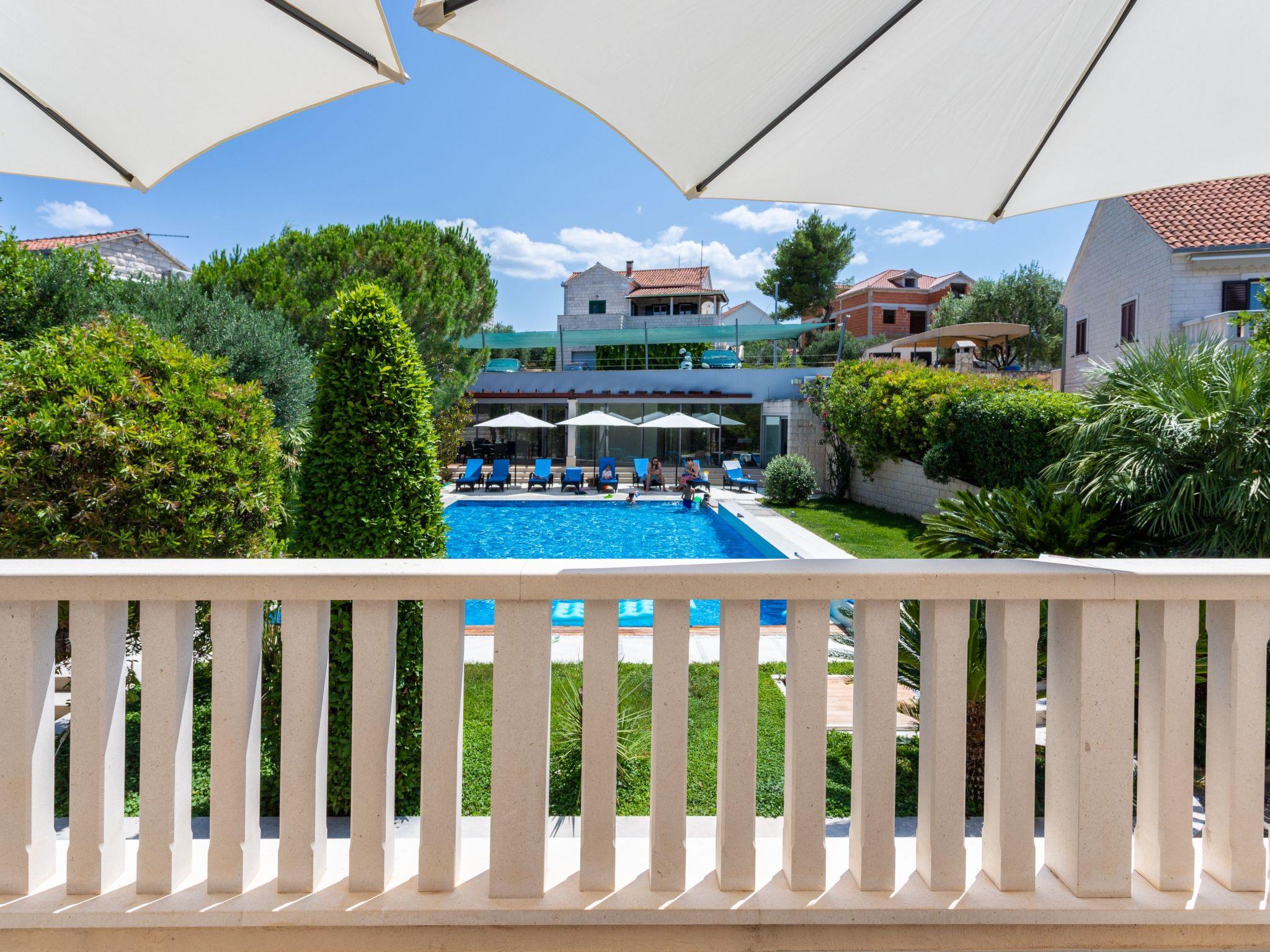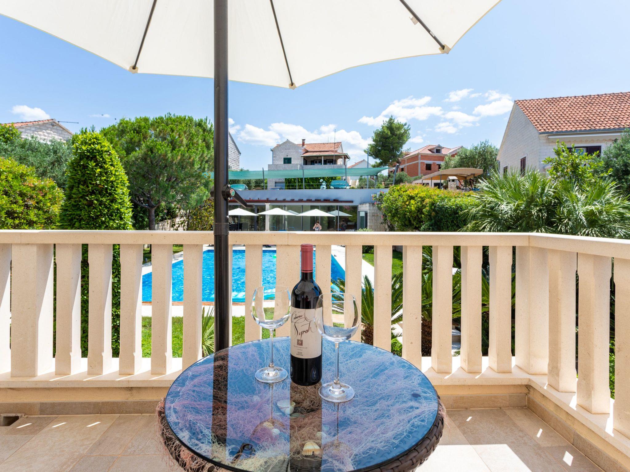 Vom Wohnbereich geht es direkt auf Ihren privaten Sonnenbalkon. Hier können Sie an dem Tisch mit Stühlen beim ausgedehnten Urlaubsfrühstück den Blick über den grünen Garten und den Pool genießen.