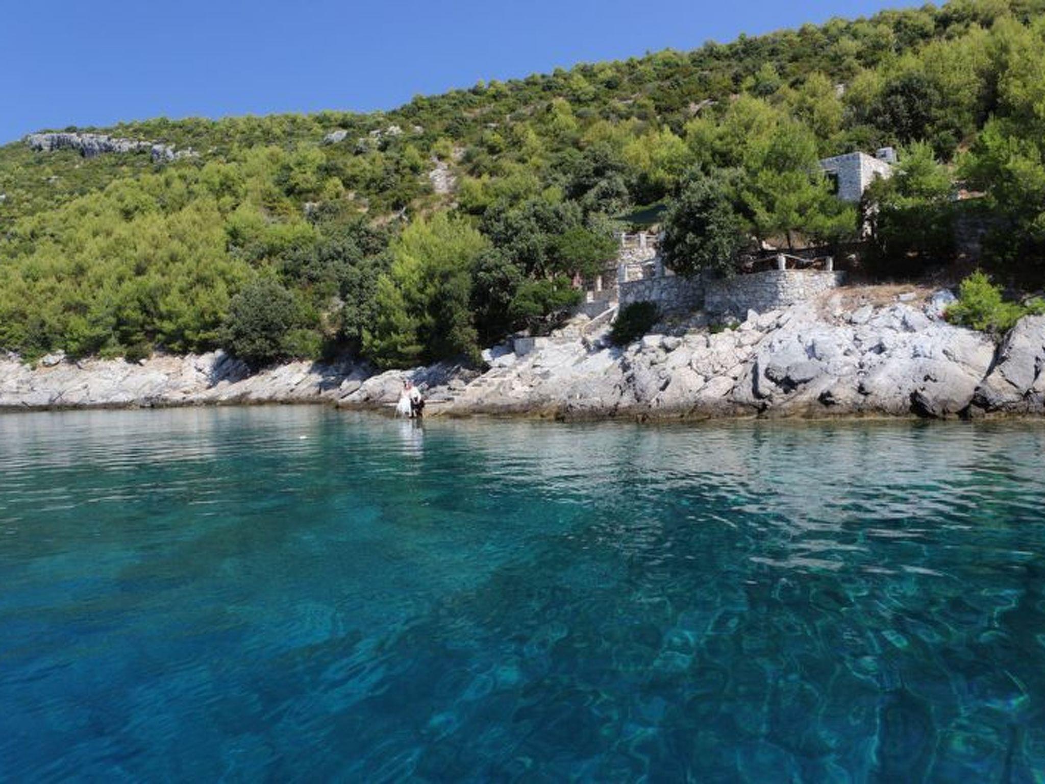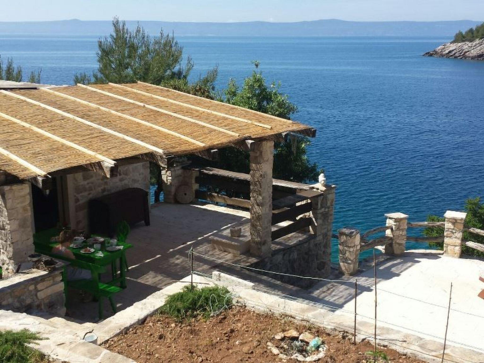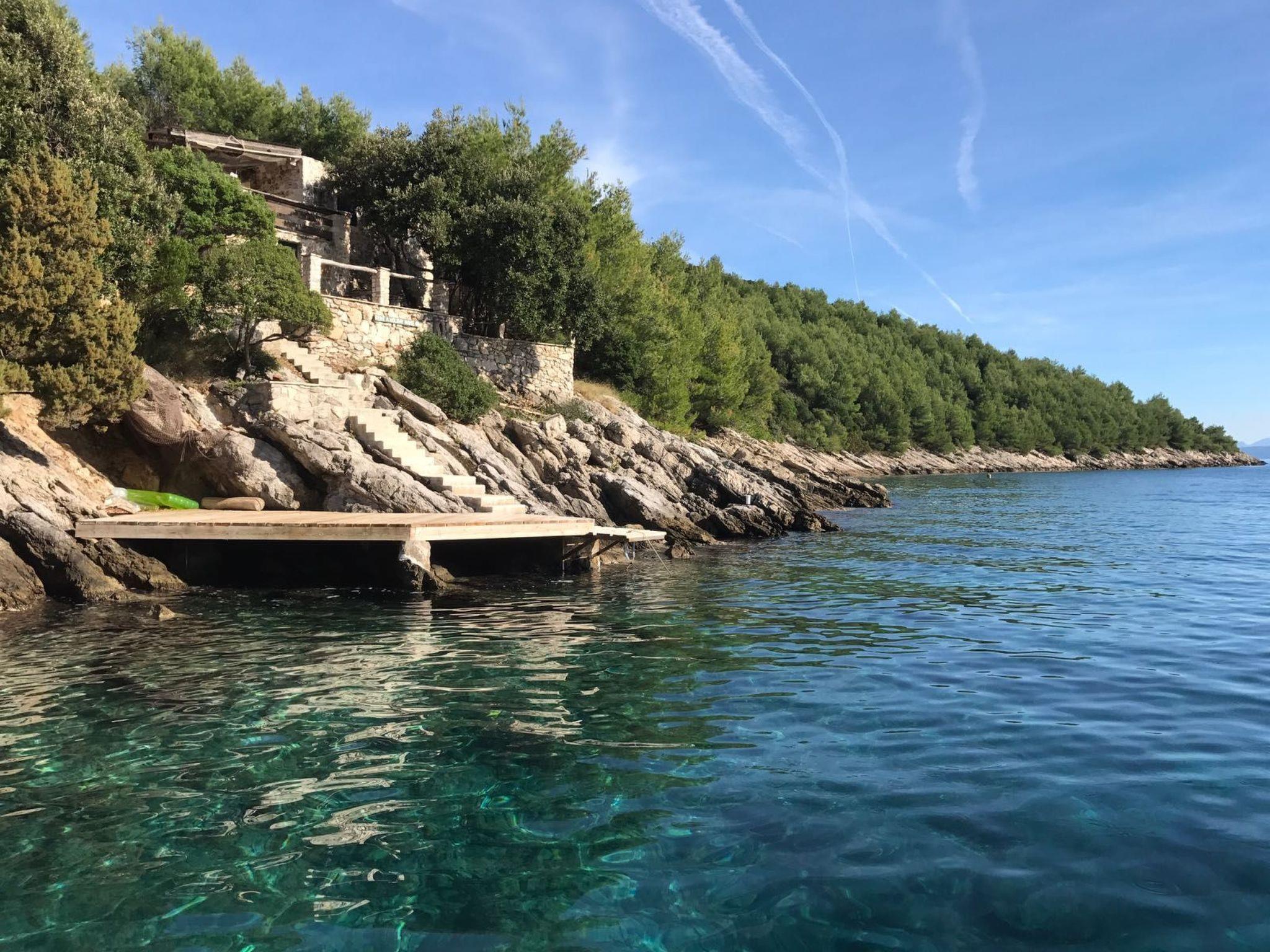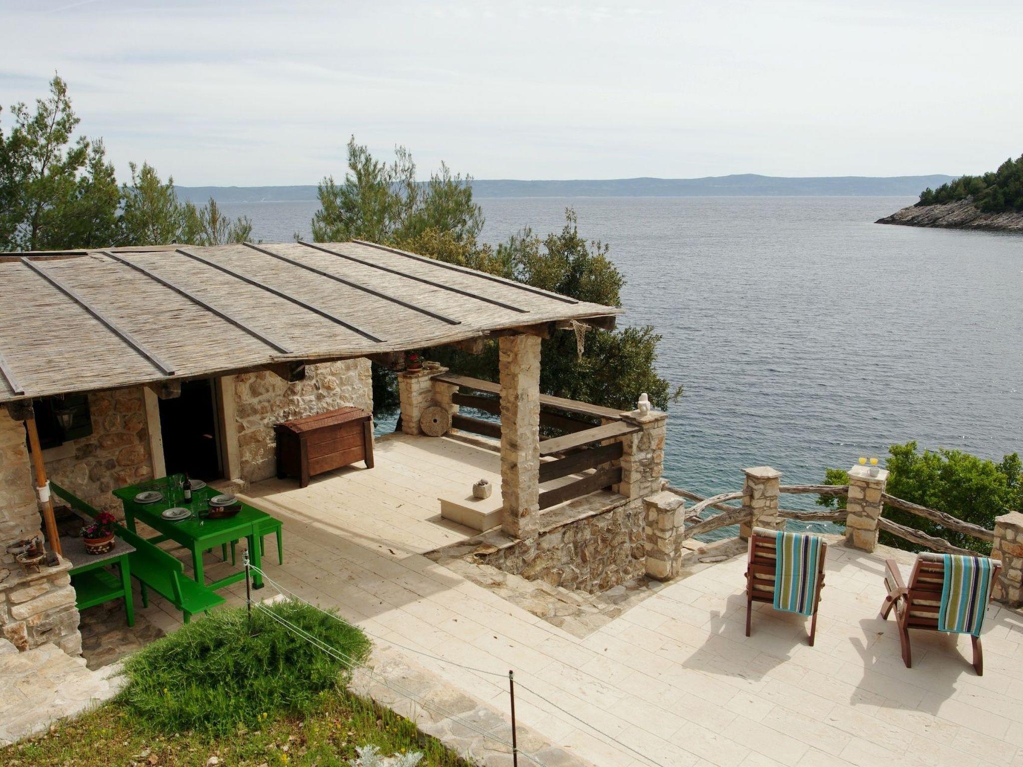 Dieses freistehende Einfamilienhaus aus Naturstein liegt in Alleinlage auf der Insel Brac in einer Bucht in zehn Metern Entfernung vom Meer mit eigener Mole und Badeholzsteg. Es ist nur mit dem Boot erreichbar. Mit dem Schnellboot bringen die Vermieter die Gäste bei der Anreise in zehn Minuten zur Unterkunft und holen sie am Abreisetag wieder ab.