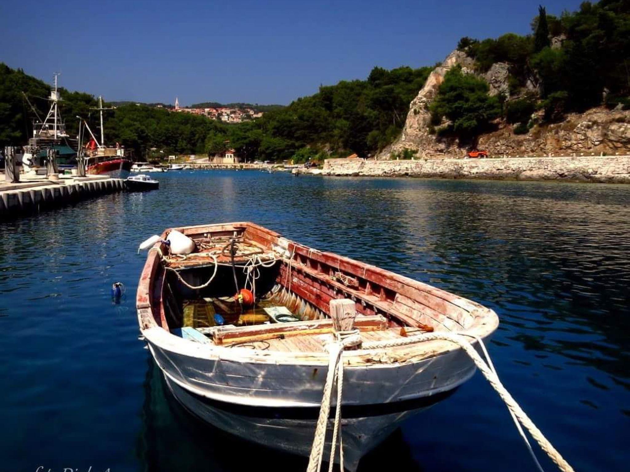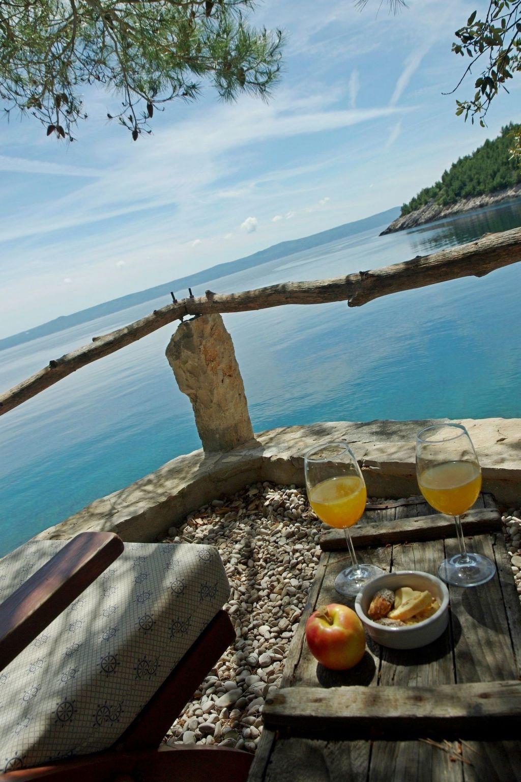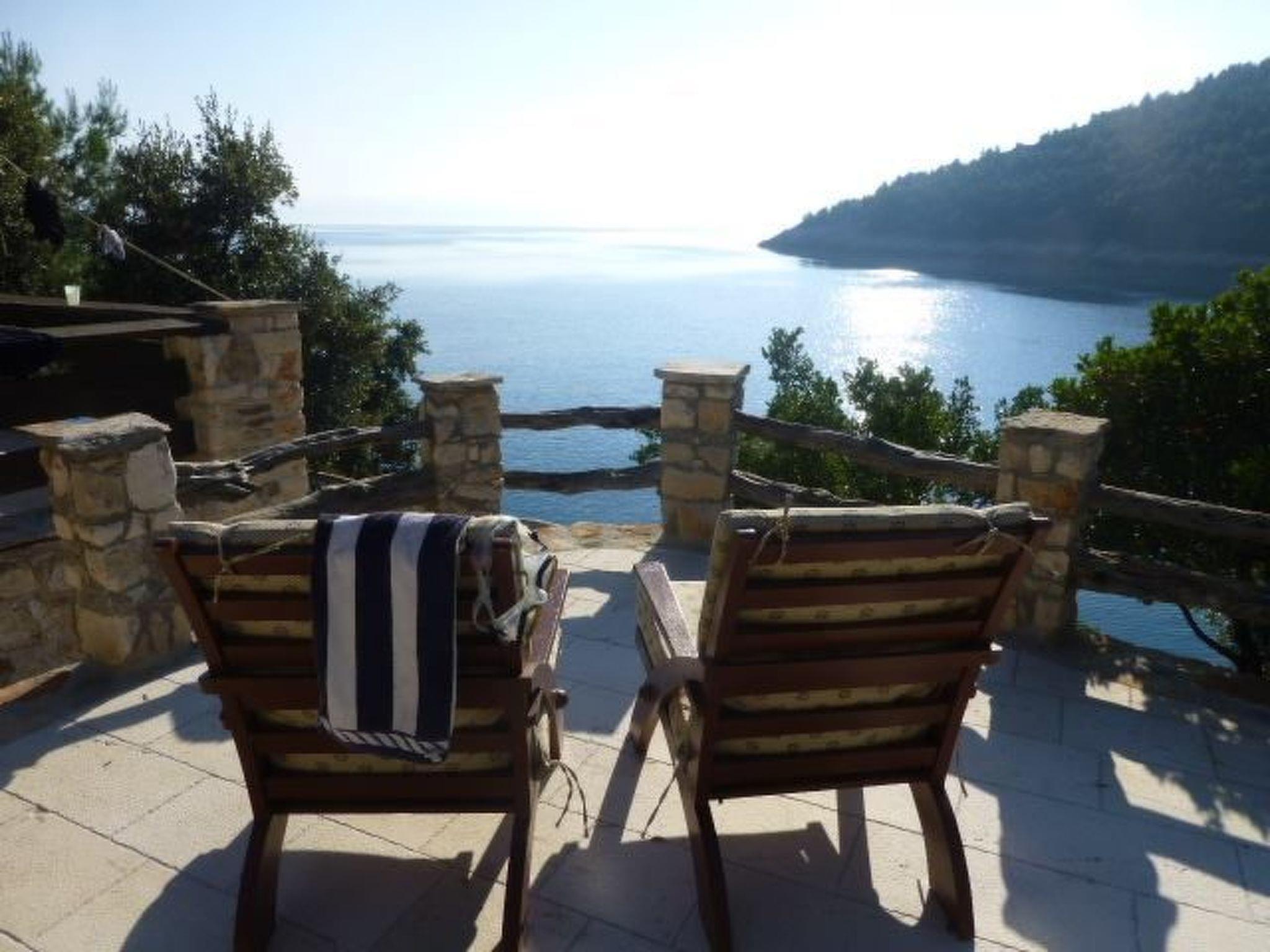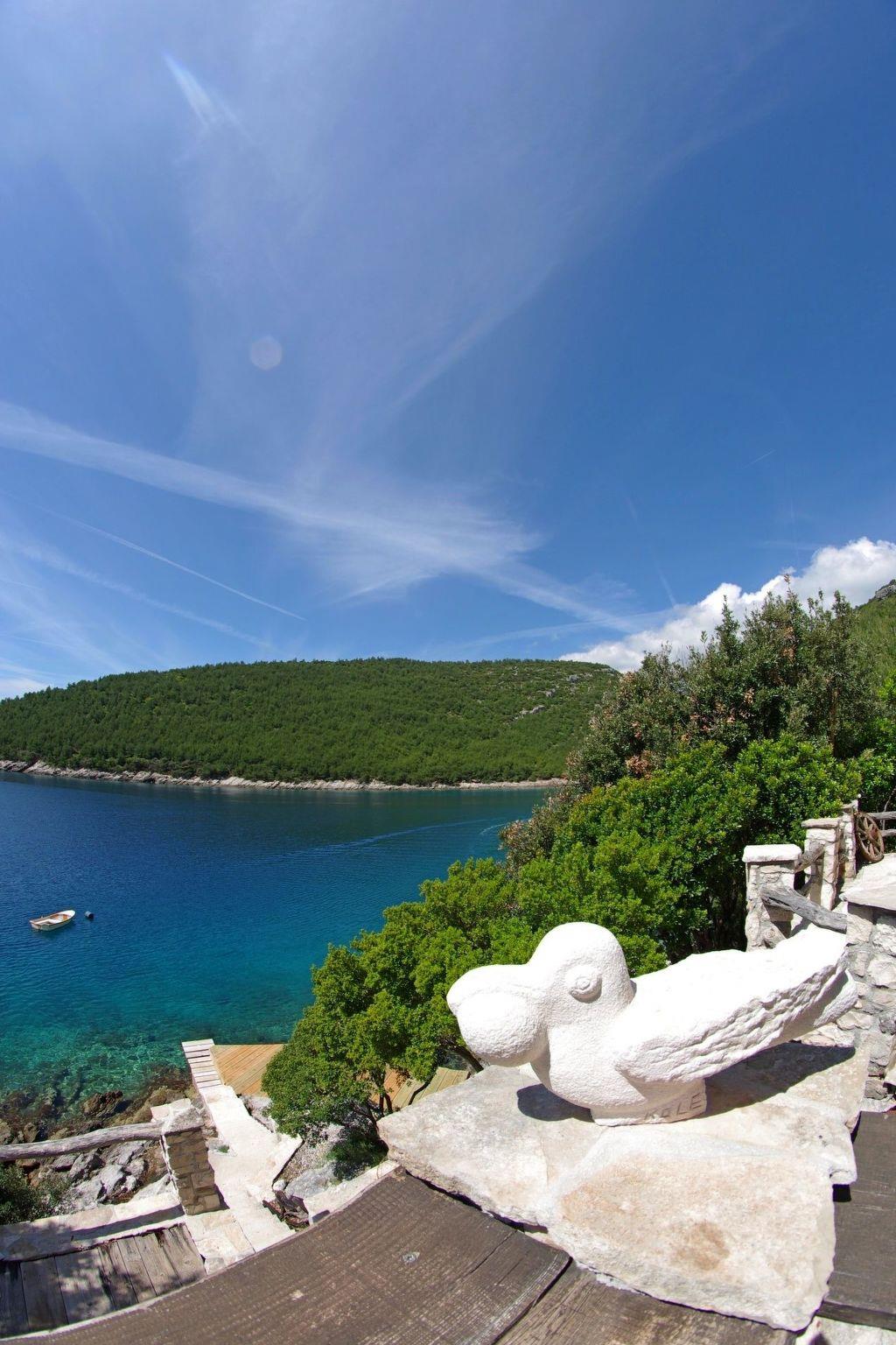 Dieses freistehende Einfamilienhaus aus Naturstein liegt in Alleinlage auf der Insel Brac in einer Bucht in zehn Metern Entfernung vom Meer mit eigener Mole und Badeholzsteg. Es ist nur mit dem Boot erreichbar. Mit dem Schnellboot bringen die Vermieter die Gäste bei der Anreise in zehn Minuten zur Unterkunft und holen sie am Abreisetag wieder ab.
