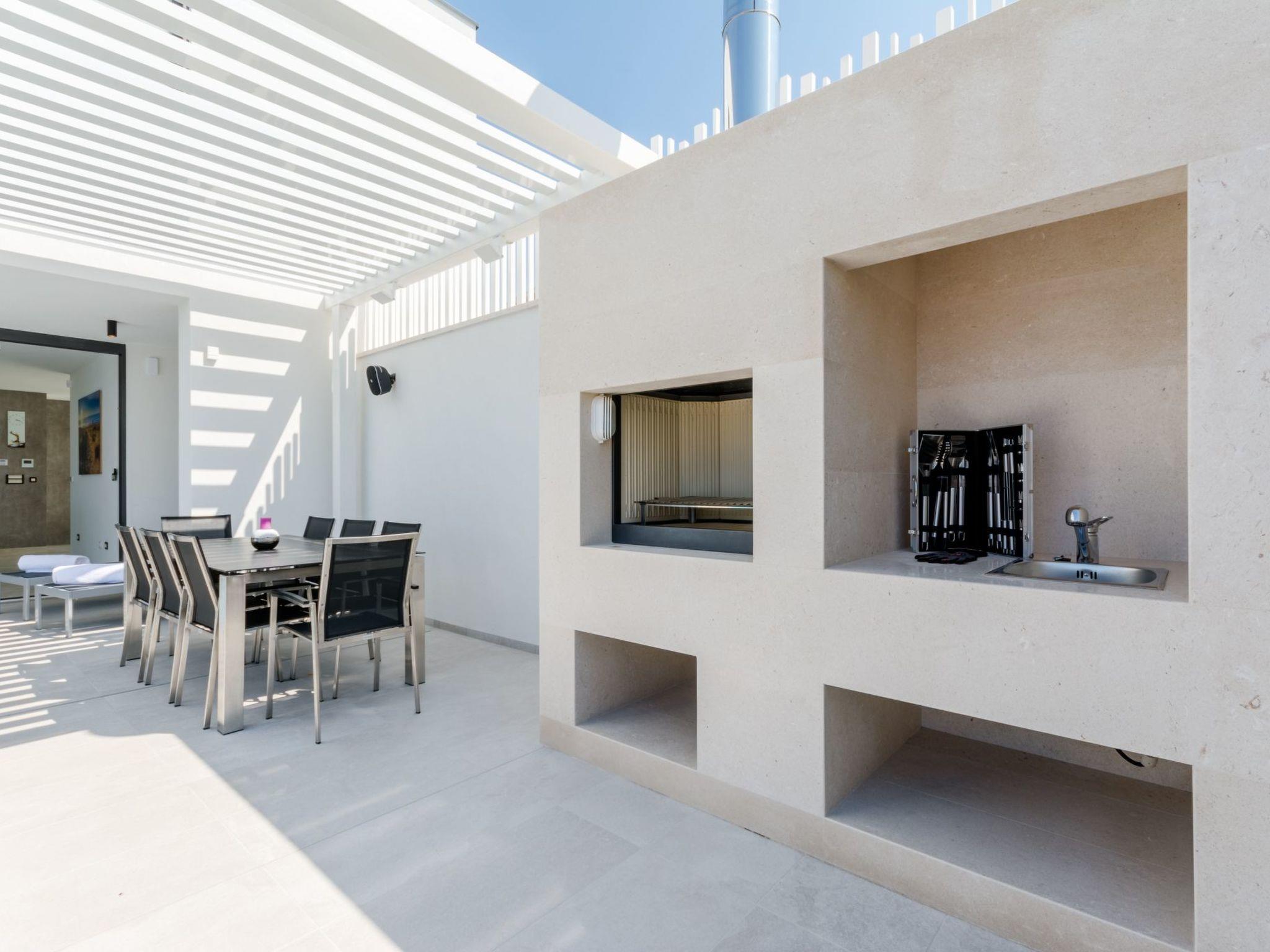 Die Terrasse ist mit Gartenmöbeln, einem Sonnenschirm und acht Gartenliegen ausgestattet. Das Anwesen ist eingezäunt und daher ideal für Kinder- und Familienurlaub geeignet.