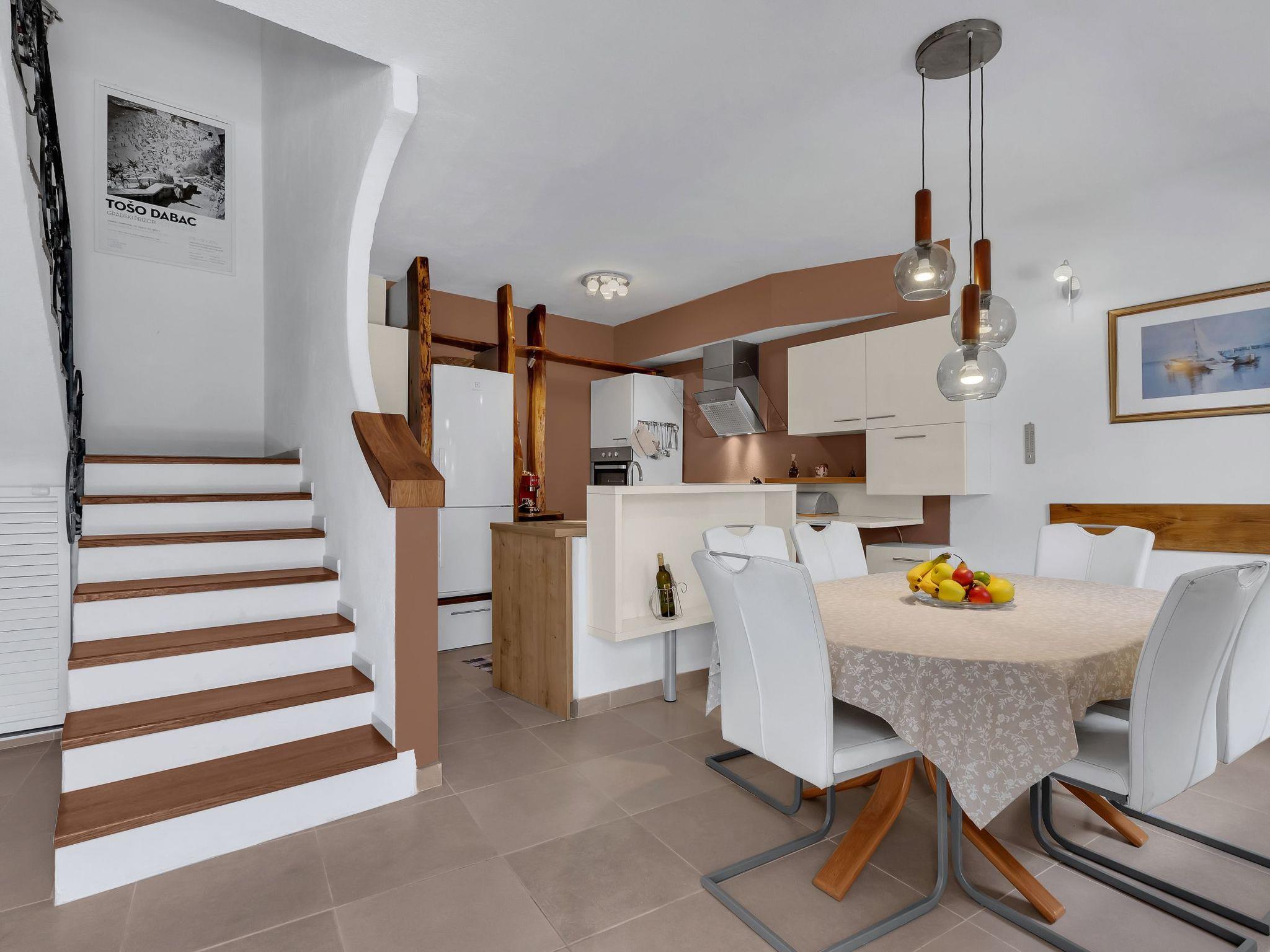 Im Inneren des Hauses offenbart sich ein gemütlicher, offen gestalteter Wohnbereich, der mit zwei ansprechenden Sitzmöbeln, einem Esstisch für 6 Personen und einer voll ausgestatteten Küche im charmanten Landhausstil mit weißen Fronten punktet. Die Küche bietet von Ofen, Spülmaschine über Kaffeemaschine bis hin zum Toaster alles, was das Herz für einen individuell gestalteten Aufenthalt begehrt. Nicht zu vergessen, das hübsche Essgeschirr lädt ein, die frischen Zutaten vom lokalen Fischmarkt in Sutivan zu einem köstlichen Mahl zu verarbeiten.