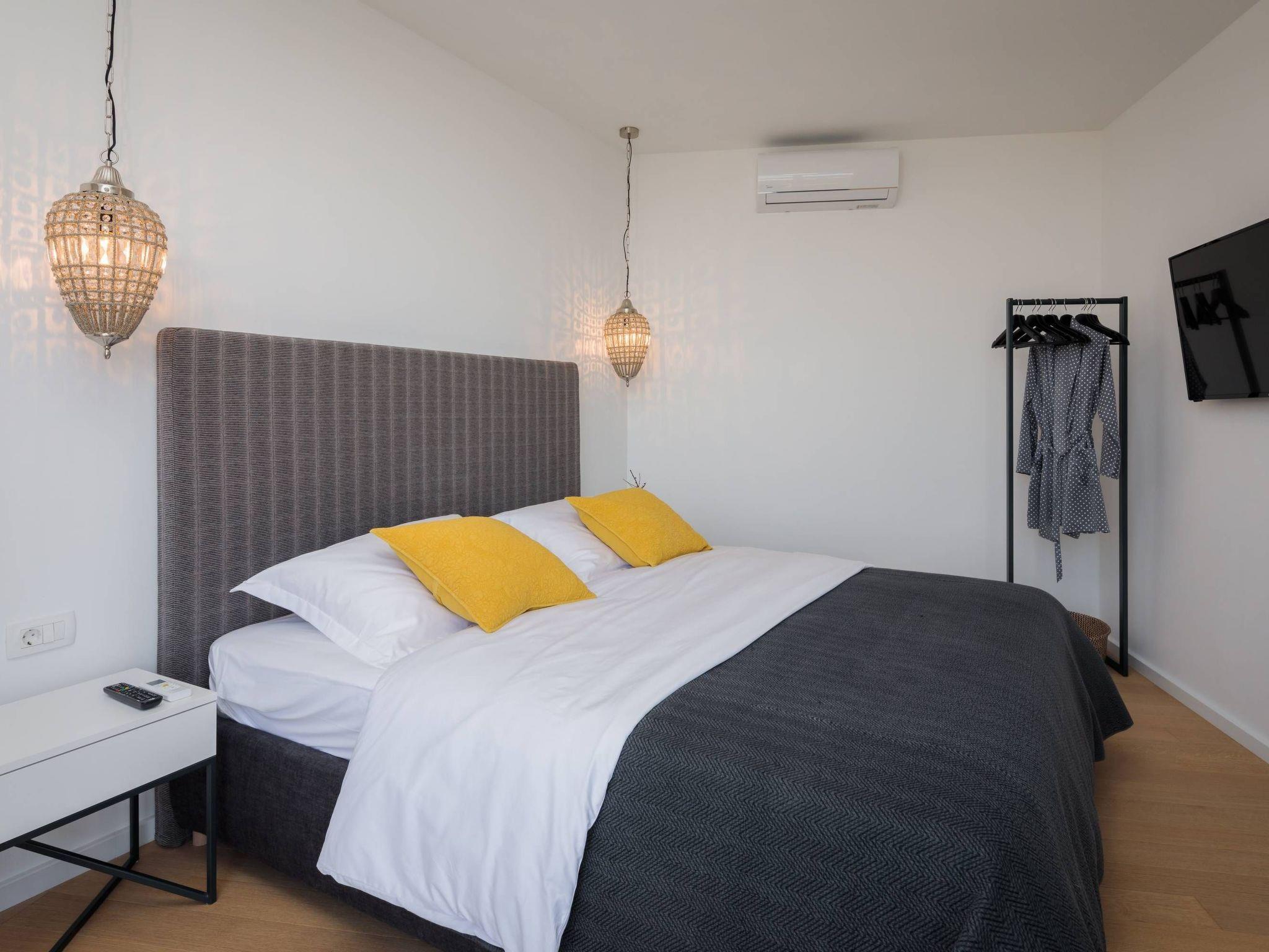 Hauptschlafzimmer: Das Highlight der Villa, dieser geräumige Rückzugsort bietet ein Kingsize-Bett, eine private Terrasse und einen atemberaubenden Blick auf die Adria.