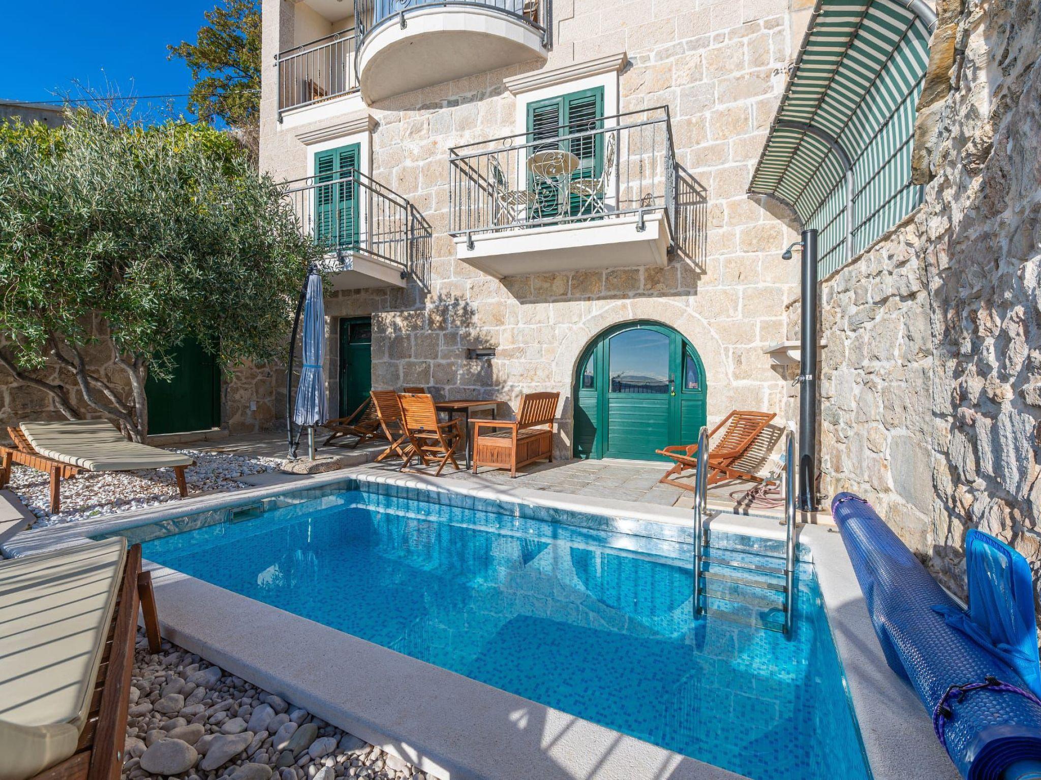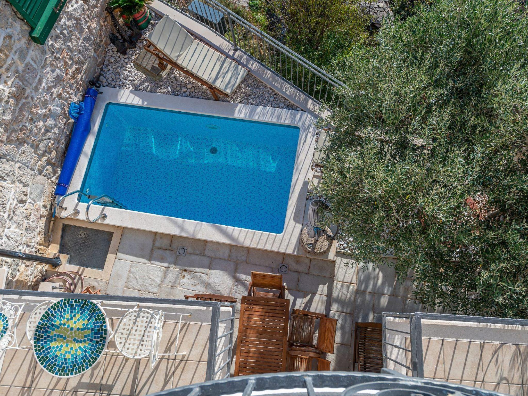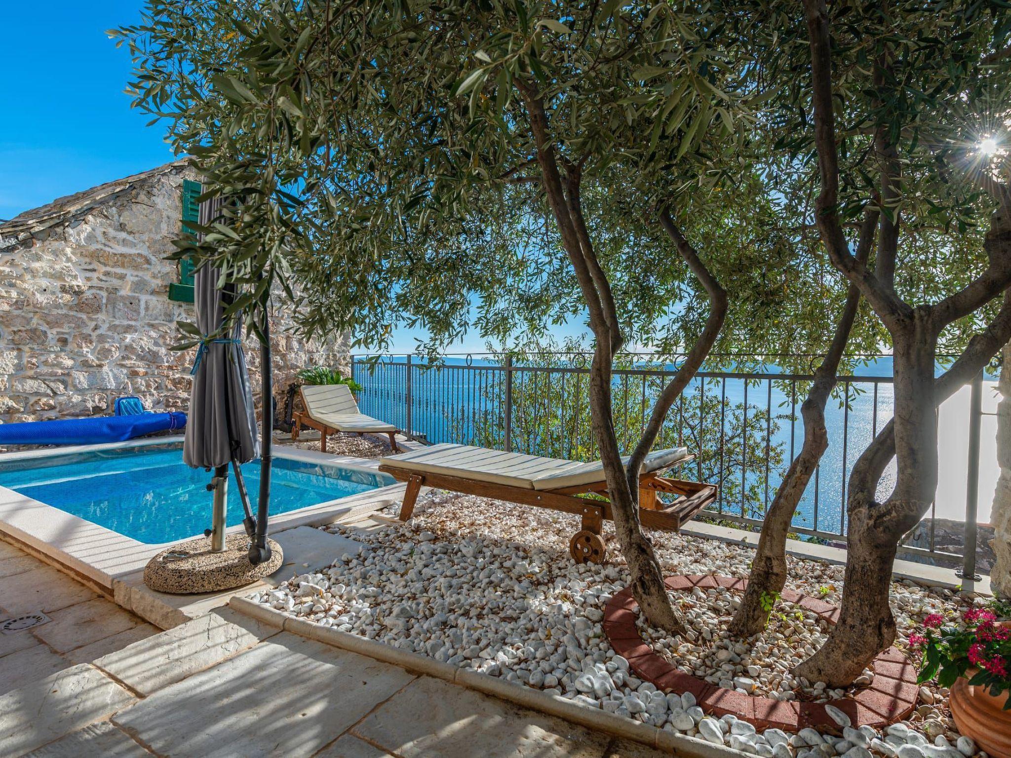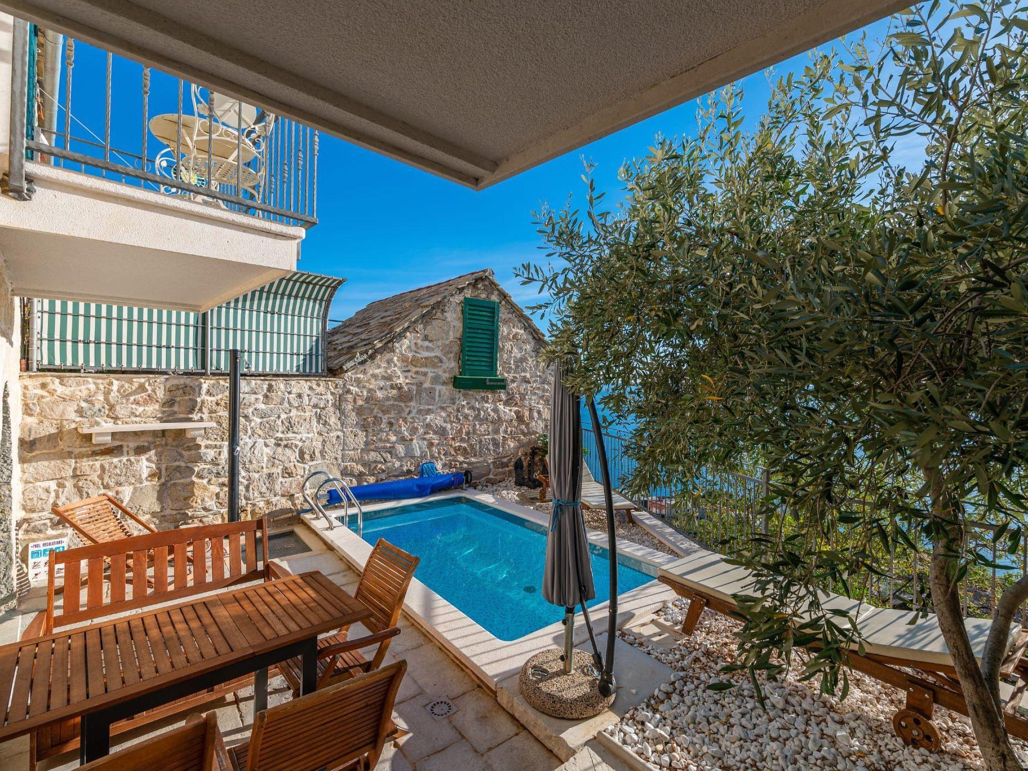 Der Außenbereich dieses freistehenden Steinhauses zeichnet sich durch seinen zur alleinigen Nutzung bestimmten Pool aus, der umgeben von einer Terrasse und einem Garten, wunderbare Momente der Entspannung und Privatsphäre bietet. Genießen Sie die Ruhe und erfrischen Sie sich nach Herzenslust im kühlen Nass. Der Balkon erweitert den Lebensraum ins Freie und bietet sich an, die Umgebung in Augenschein zu nehmen.