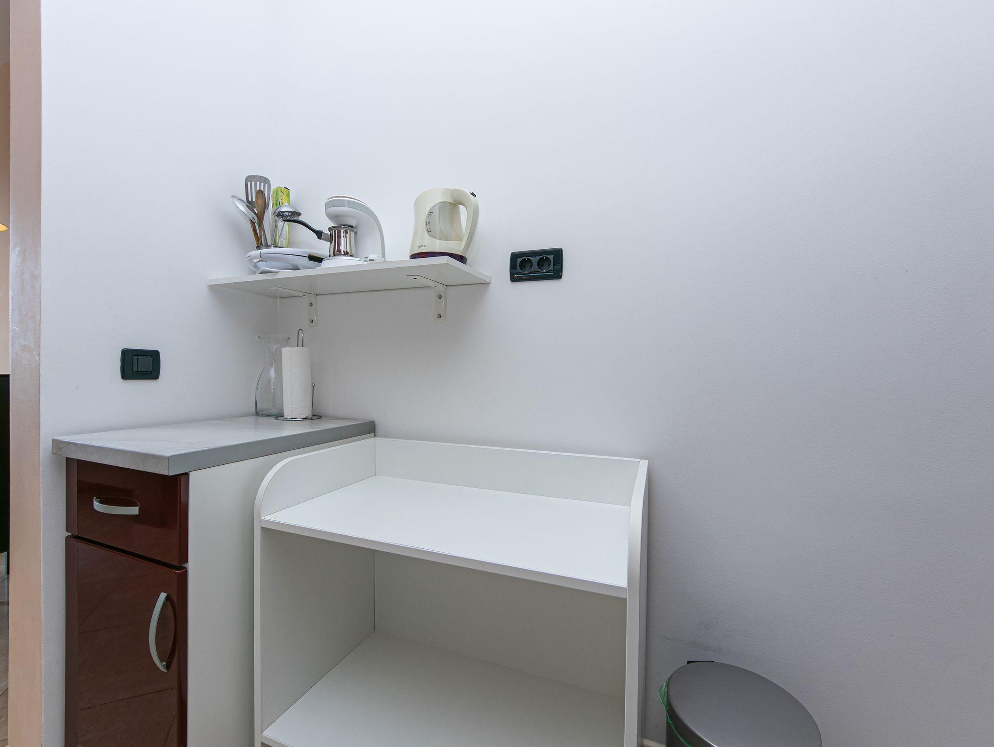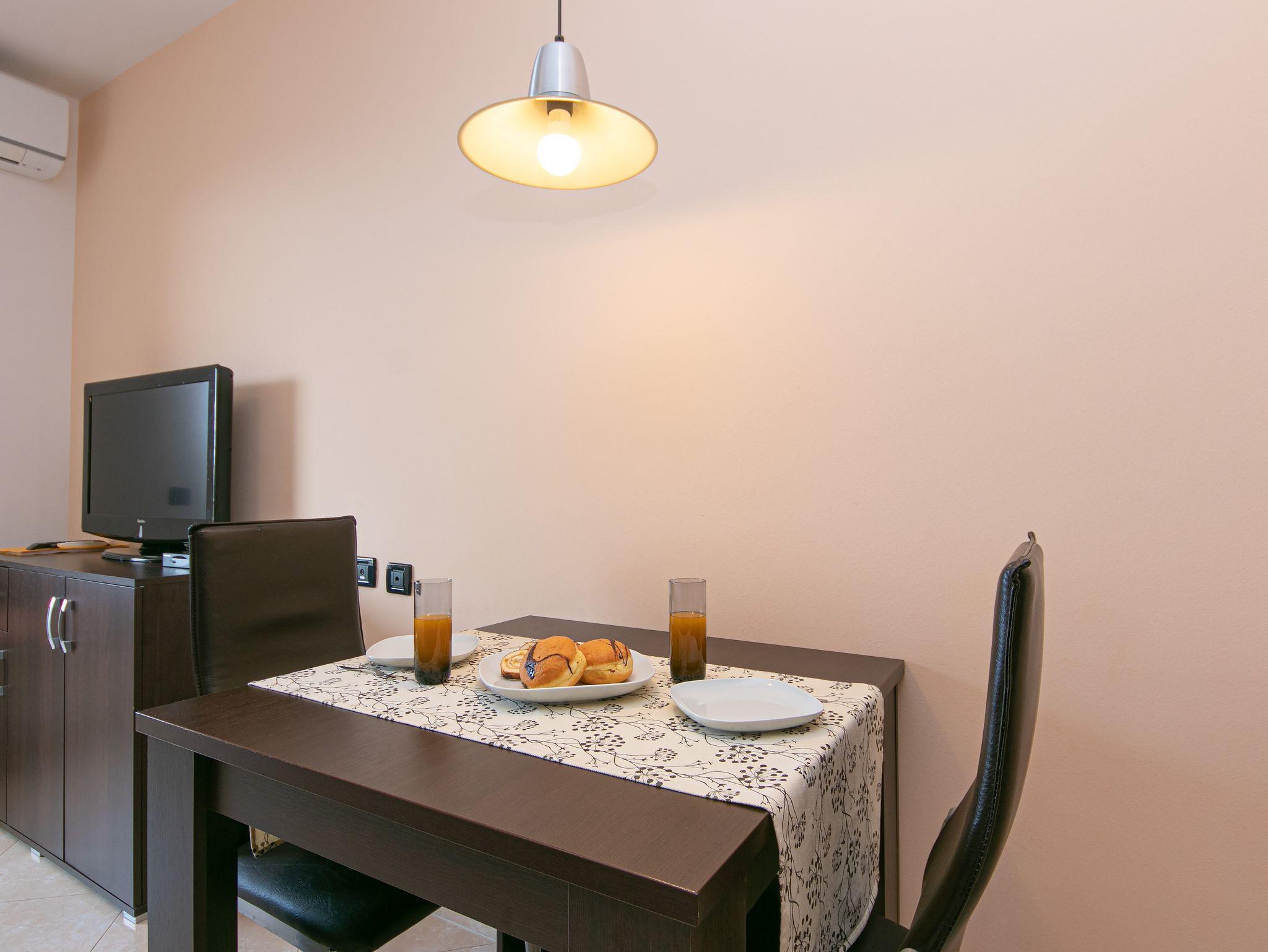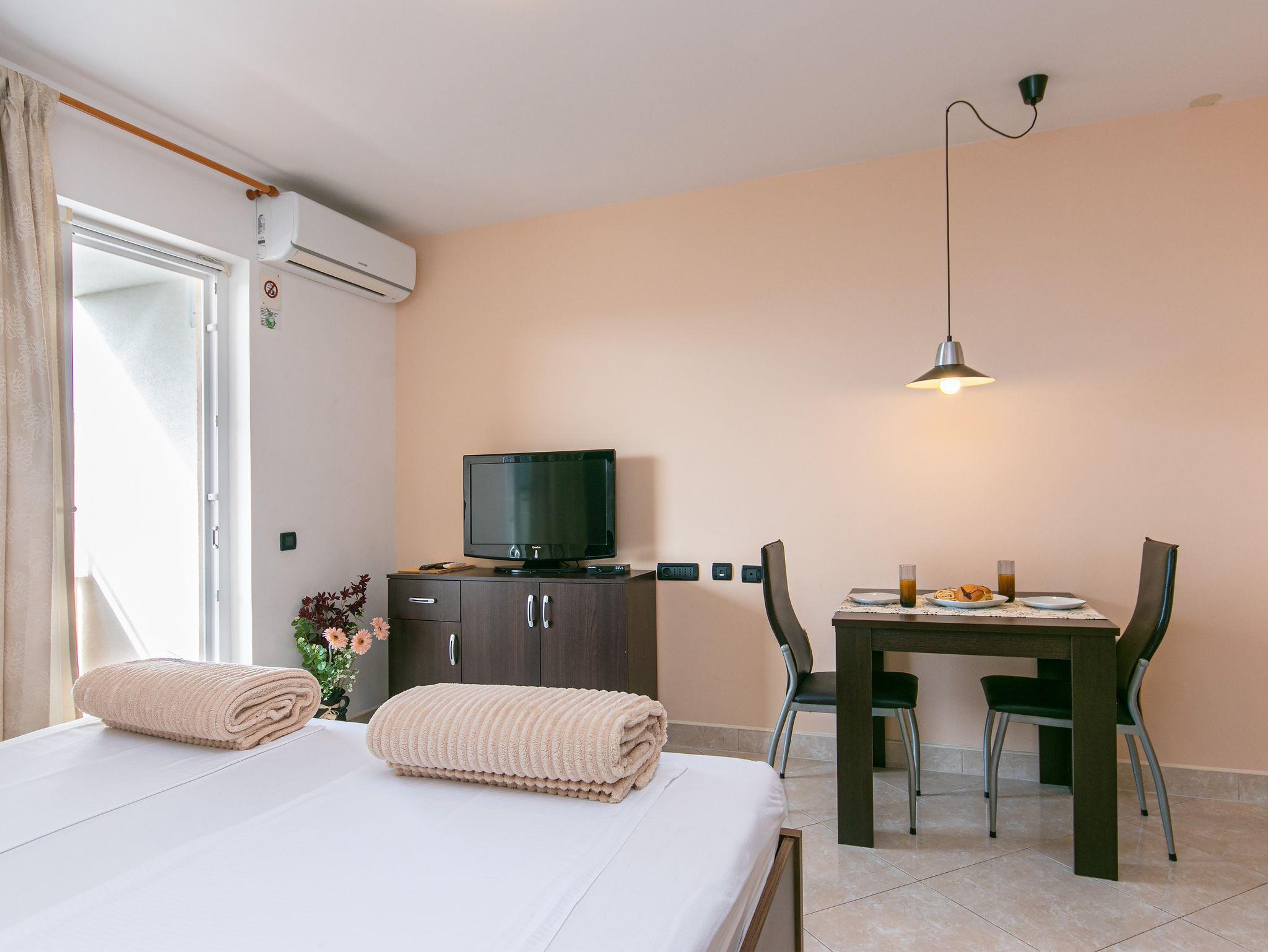 Studio bietet Platz für 2 Gäste. Die Betten sind in Schlafzimmern, die es 1 gibt, innerhalb einer Gesamtfläche von 24m2, angeordnet. Die Gäste haben eine eigene Terrasse zur Verfügung, auf der sie in warmen Sommernächten genießen können. Das Studio-Apartment bietet Meerblick. Es ist erlaubt, Speisen auf dem Gemeinschafts-Grill vorzubereiten. Während ihres Aufenthalts können Gäste das gemeinsam zur Nutzung stehende Schwimmbad benutzen. In der Unterkunftseinheit besteht die Möglichkeit des Mitbringens von Haustieren gegen Aufpreis. IM PREIS INBEGRIFFEN: Kurtaxe, Endreinigung, Klimatisierung, Pool, Parkplatz, Internet, Wäschewaschen, Kinderbett, Bügeleisen, Bügelbrett, Föhn. UNVERBINDLICHE ZUSÄTZLICHE KOSTEN: Haustiere (10,00 € pro Nacht). Die Verfügbarkeit zusätzlicher Dienstleistungen in Ihrem reservierten Termin und die Preise derselben (falls nicht aufgeführt) müssen im Voraus überprüft werden. Zusätzliche Dienstleistungen die in der Zahlungsaufforderung nicht aufgeführt sind werden direkt beim Vermieter bezahlt, angenommen der Gast nutzt auch diese. Ermäßigung auf den Grundpreis: Gratistag 14=13 (bei einem Aufenthalt von 14 Tagen oder mehr erhalten Sie einen Gratistag für den Aufenthalt bis 31.12.26).