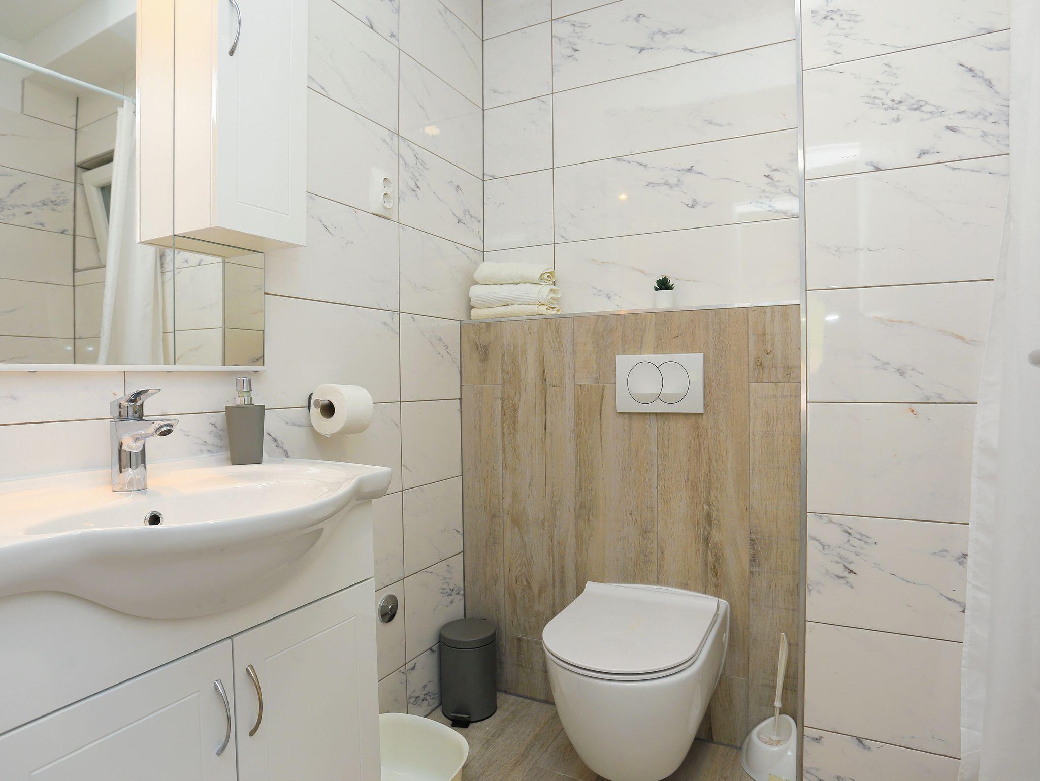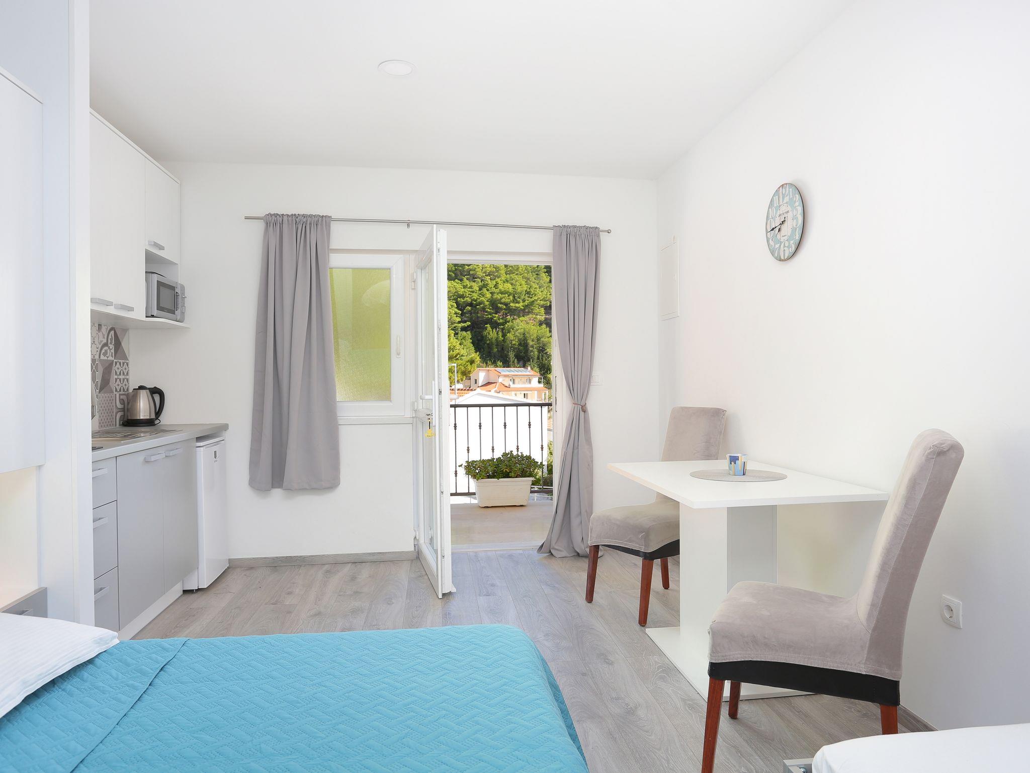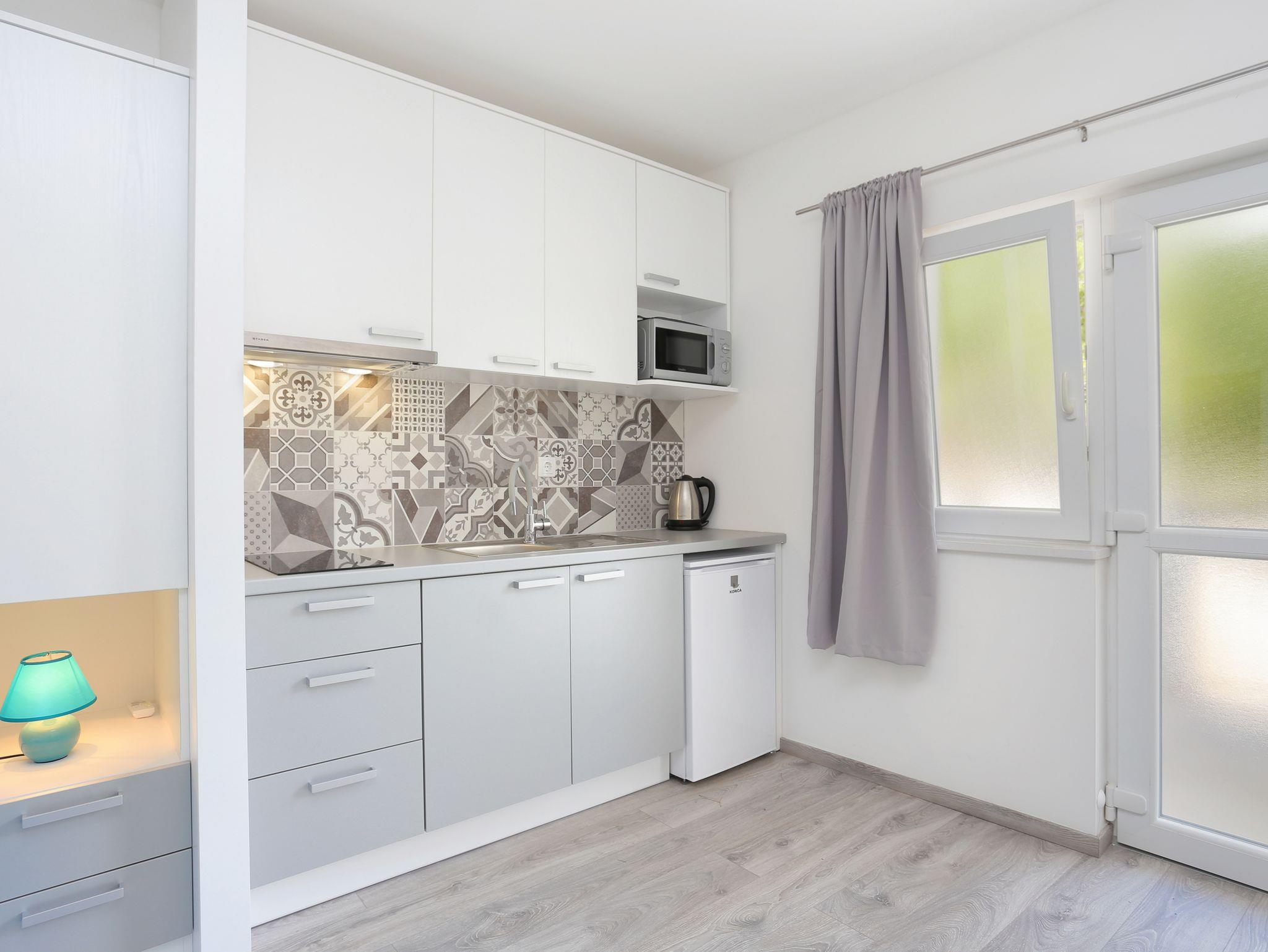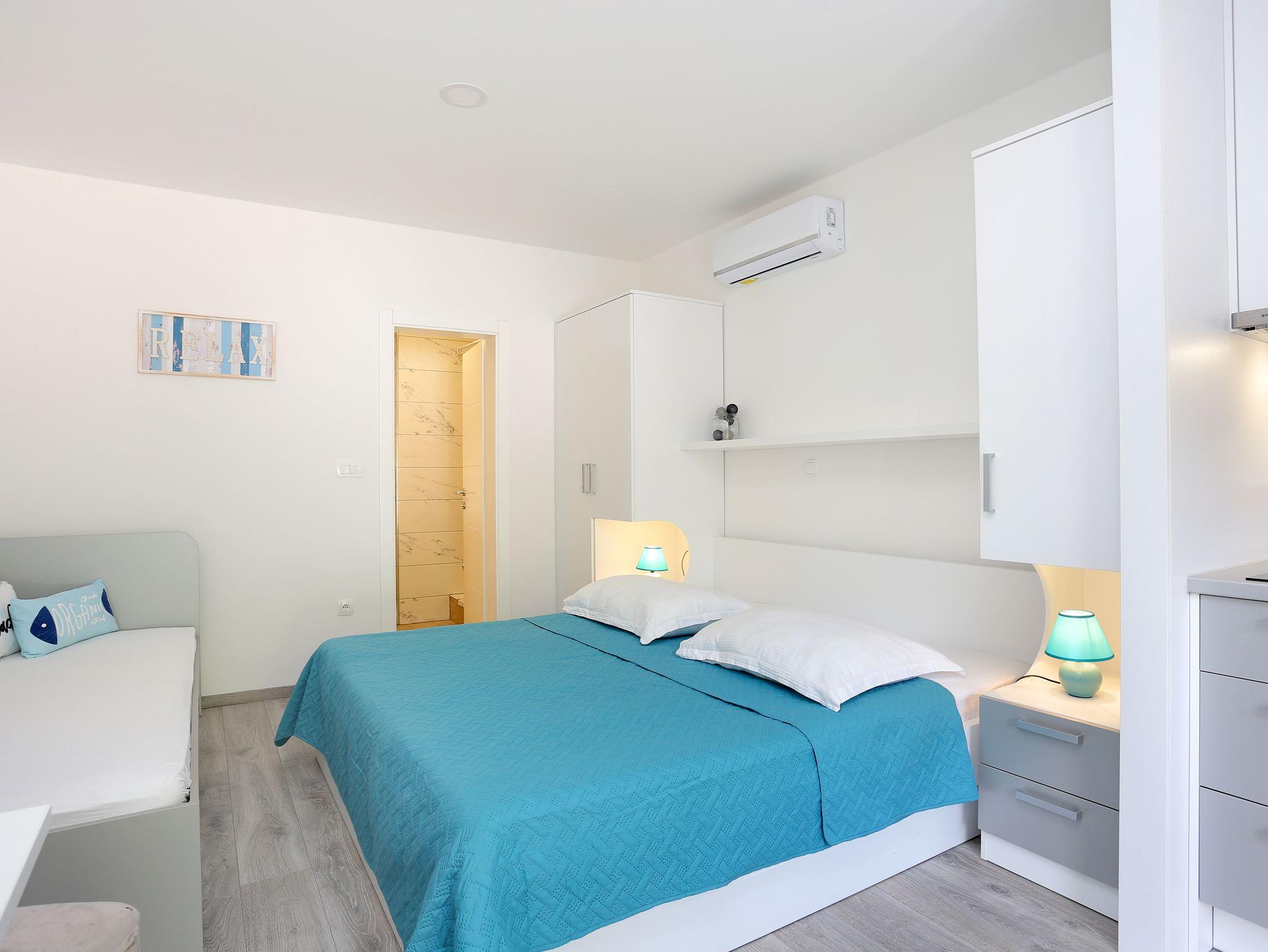 Studio bietet Platz für 2 Gäste. Die Betten sind in Schlafzimmern, die es 1 gibt, innerhalb einer Gesamtfläche von 23m2, angeordnet. Die Gäste haben eine eigene Terrasse zur Verfügung, auf der sie in warmen Sommernächten genießen können. Das Studio-Apartment bietet Meerblick. Es ist erlaubt, Speisen auf dem Gemeinschafts-Grill vorzubereiten. IM PREIS INBEGRIFFEN: Kurtaxe, Endreinigung, Klimatisierung, Parkplatz, Internet, Kinderbett, Bügeleisen, Bügelbrett, tragbarer Grill, 1 Bett für Kinder (im Preis enthalten). VERBINDLICHE ZUSÄTZLICHE KOSTEN: Aufzahlung für Kurzaufenthalte (prozentualer Zuschlag pro Nächtigungsanzahl: 30% - 1, 20% - 2, 10% - 3). UNVERBINDLICHE ZUSÄTZLICHE KOSTEN: Wäschewaschen (5,00 € Waschen). Die Verfügbarkeit zusätzlicher Dienstleistungen in Ihrem reservierten Termin und die Preise derselben (falls nicht aufgeführt) müssen im Voraus überprüft werden. Zusätzliche Dienstleistungen die in der Zahlungsaufforderung nicht aufgeführt sind werden direkt beim Vermieter bezahlt, angenommen der Gast nutzt auch diese.