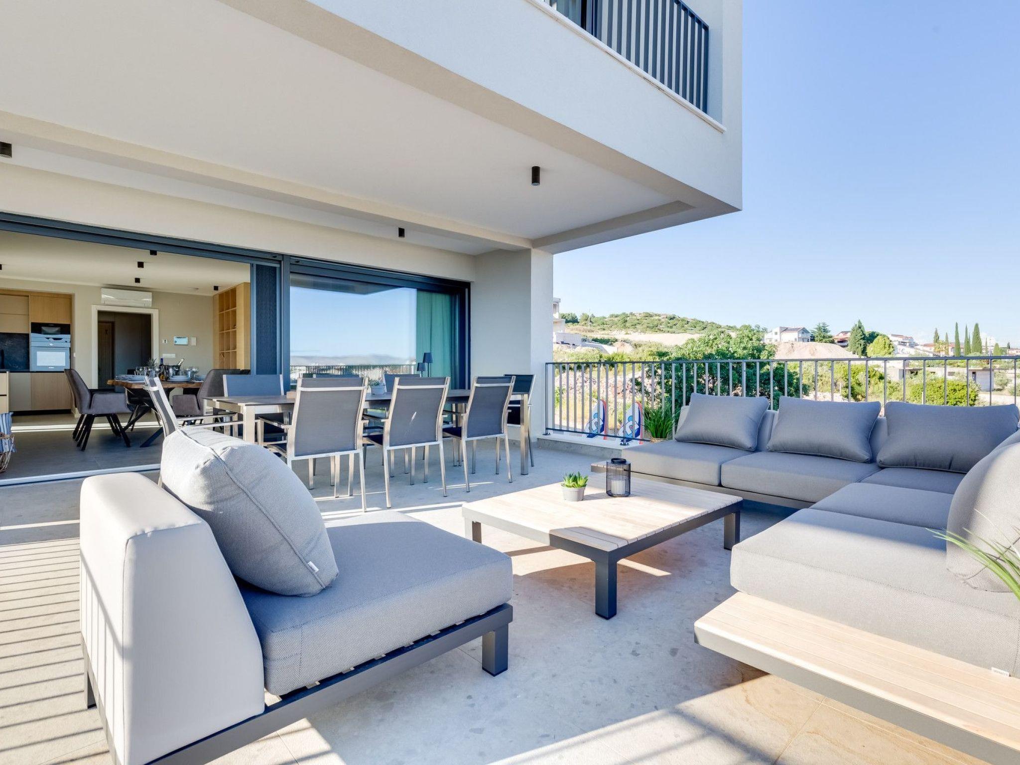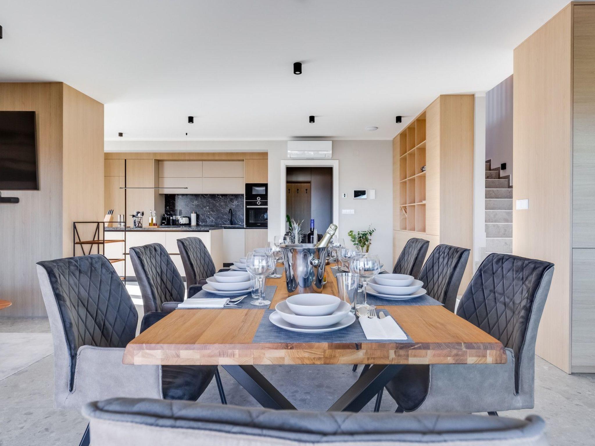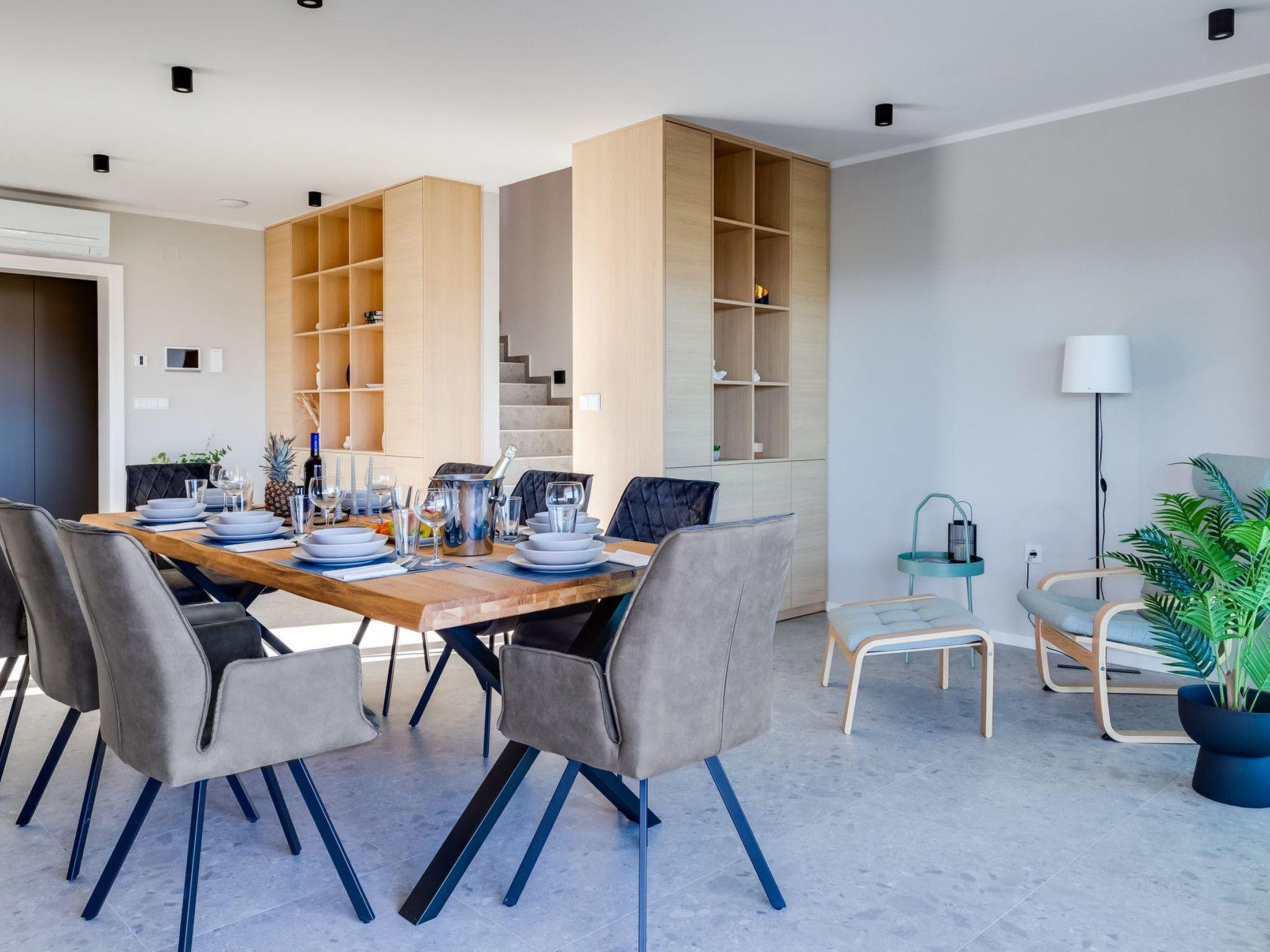 Im ersten Stock der Villa gibt es ein Wohnzimmer, ein Esszimmer und eine weitere Küche, die genügend Platz für Gruppen und geselliges Beisammensein bieten. Auf der Terrasse gibt es einen weiteren Tisch, an dem Sie unter dem Sternenhimmel zu Abend essen können, sowie einen Lounge-Bereich, in dem Sie sich zu jeder Tageszeit entspannen können.