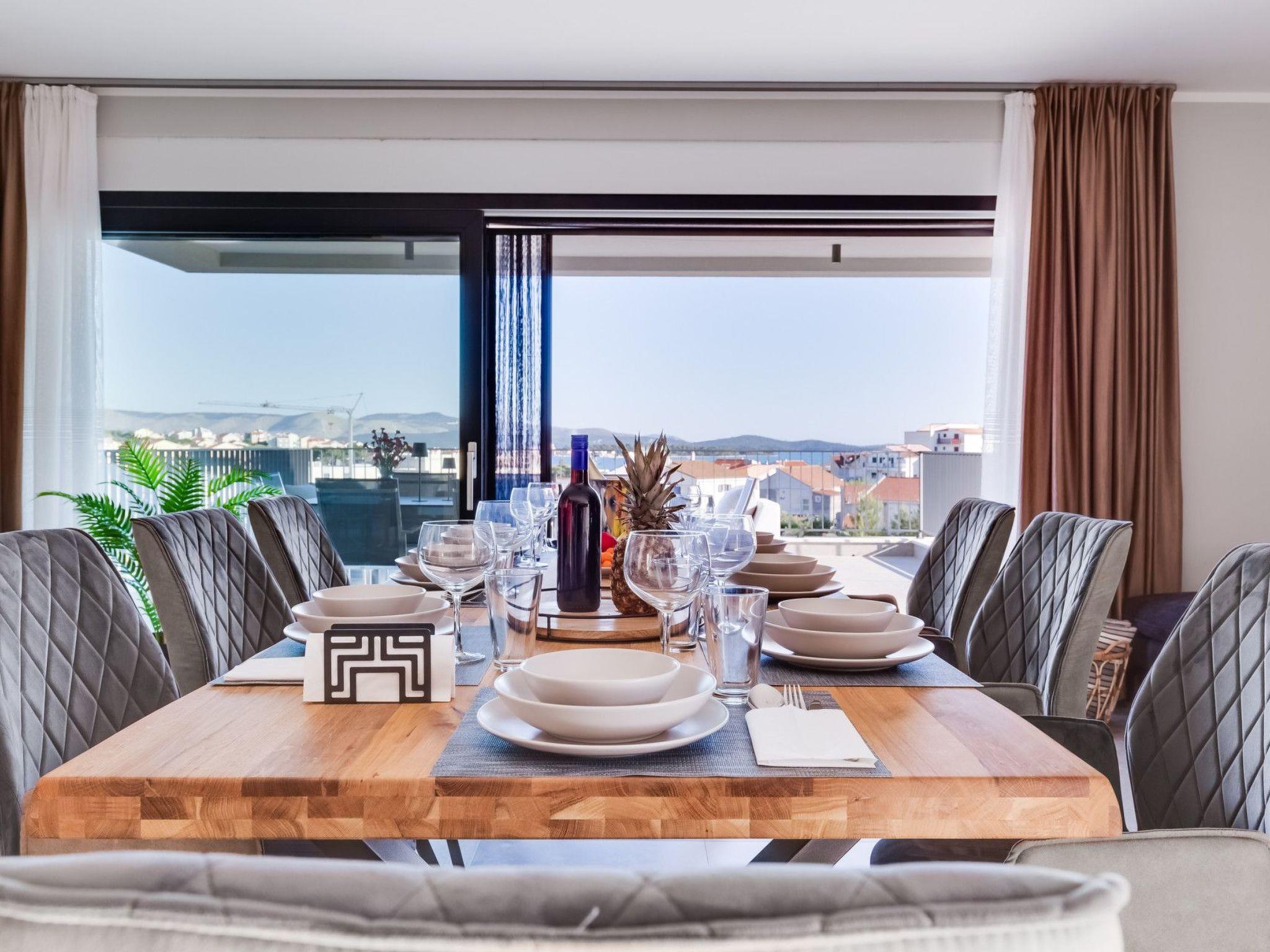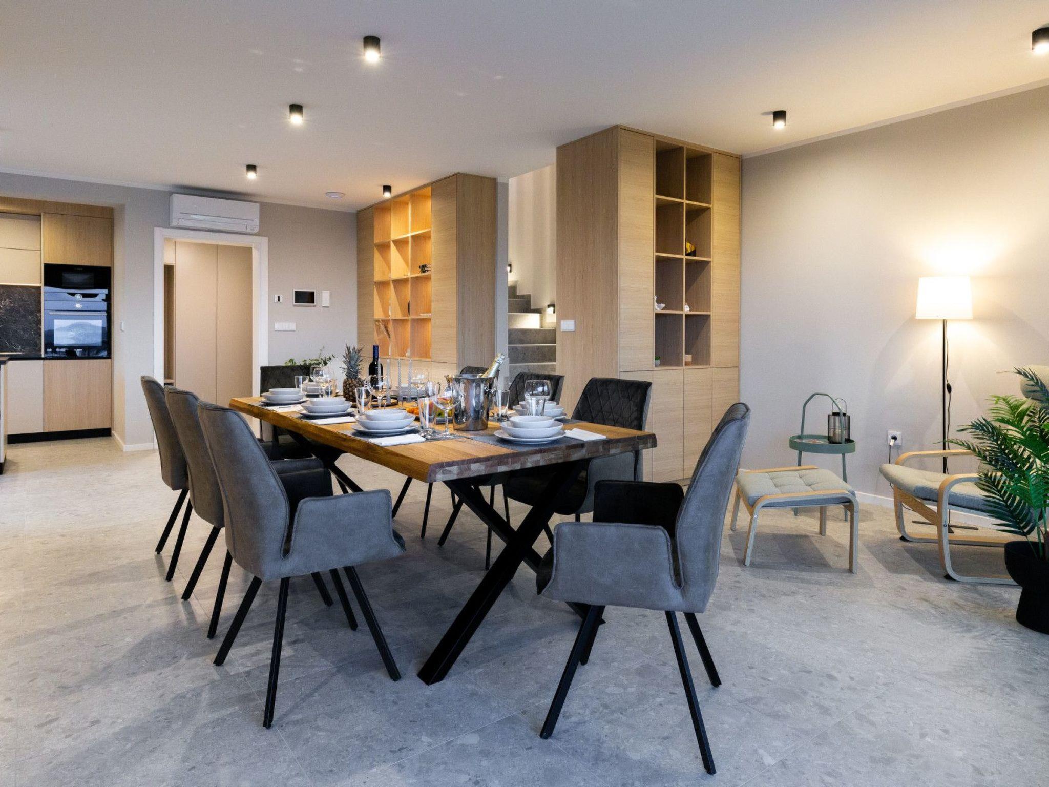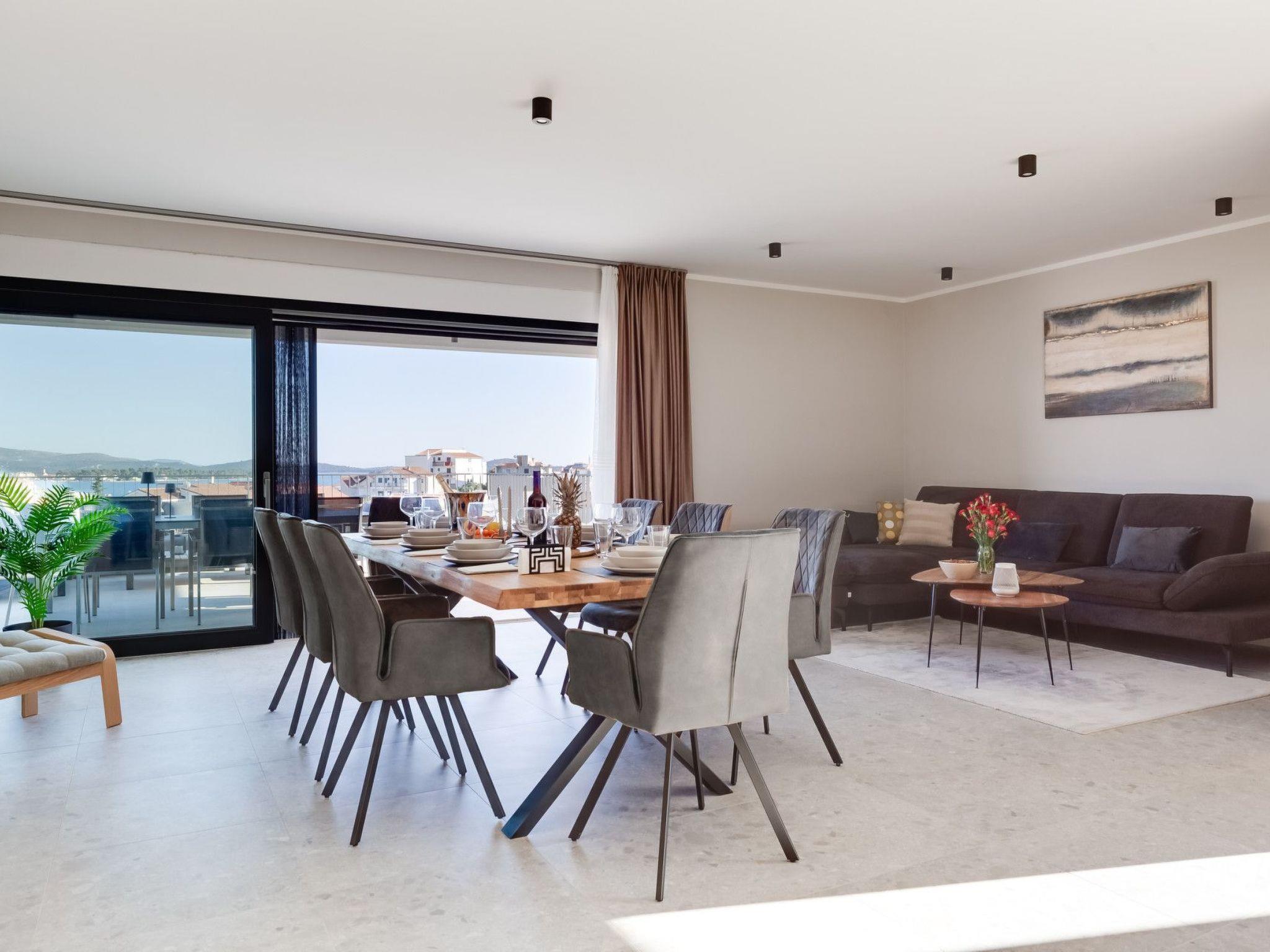 Im ersten Stock der Villa gibt es ein Wohnzimmer, ein Esszimmer und eine weitere Küche, die genügend Platz für Gruppen und geselliges Beisammensein bieten. Auf der Terrasse gibt es einen weiteren Tisch, an dem Sie unter dem Sternenhimmel zu Abend essen können, sowie einen Lounge-Bereich, in dem Sie sich zu jeder Tageszeit entspannen können.