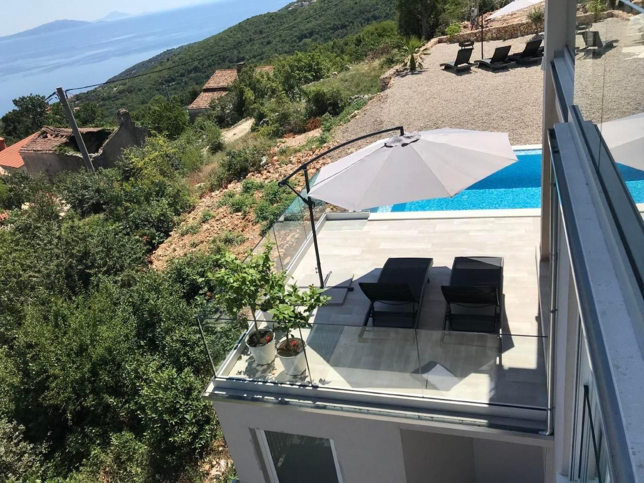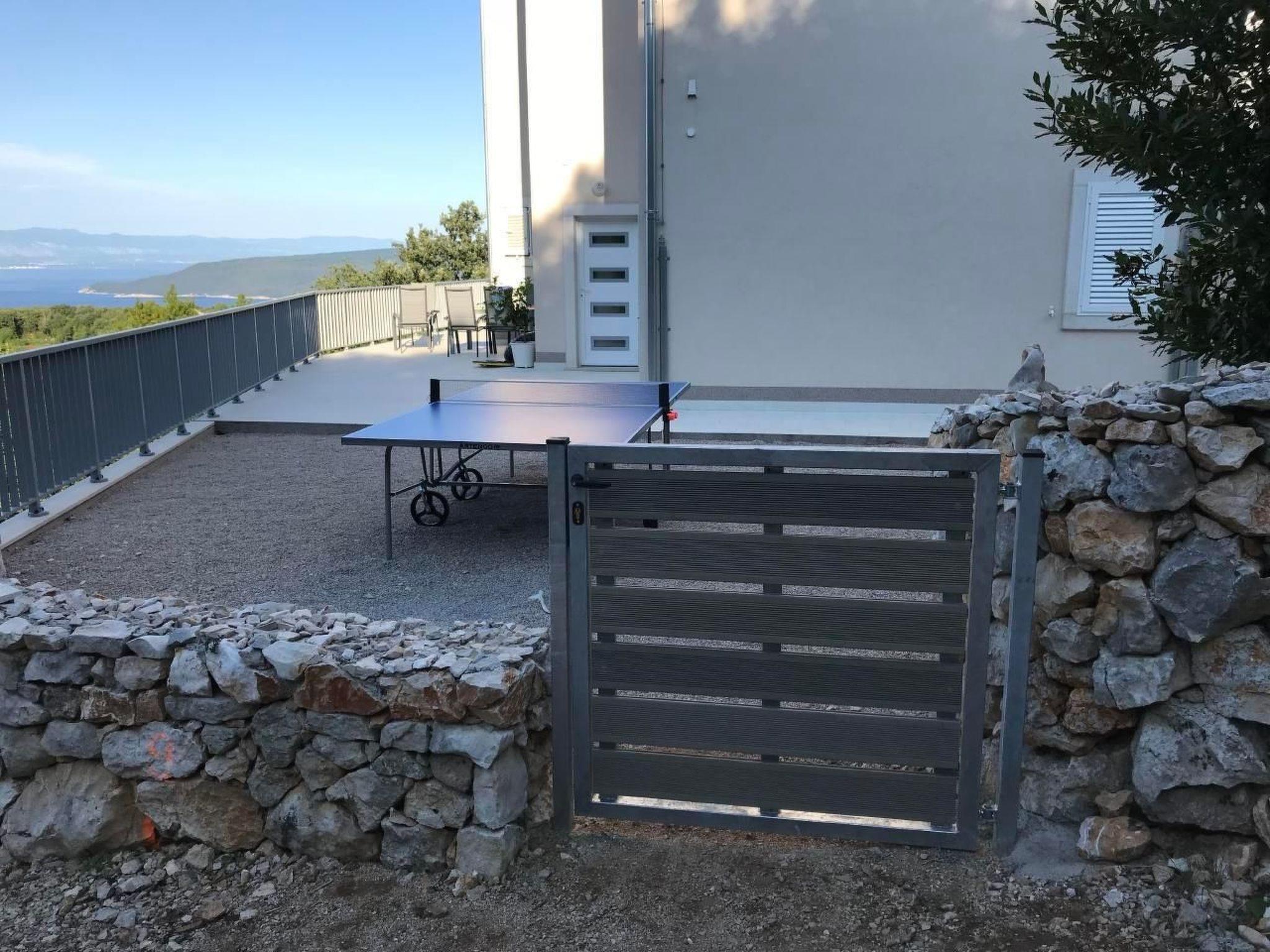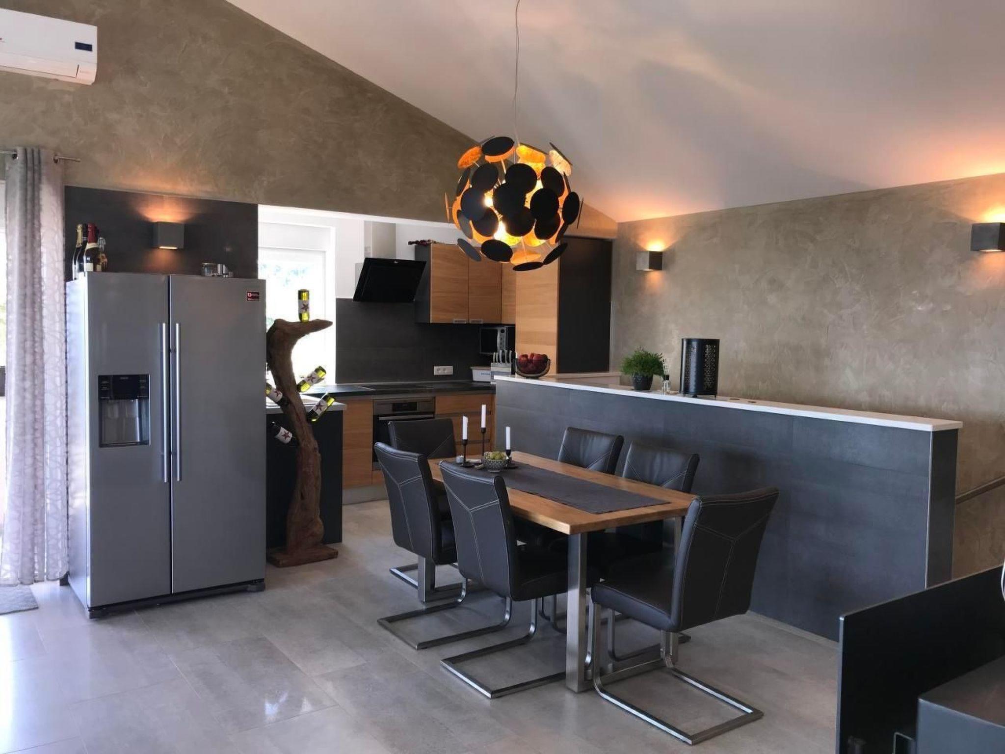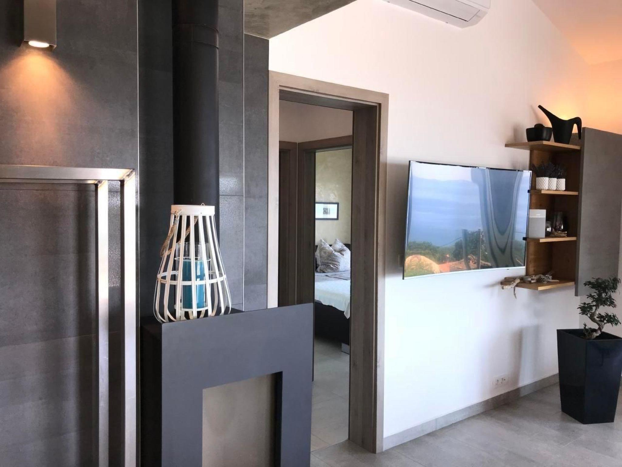 Das Appartement Losinj in der 2018 neu erbauten Villa Istra Panorama befindet sich in der oberen Etage. Von hier aus haben sie eine traumhafte Meeressicht auf die Inseln Raab , Cress und Losinj sowie die Kvarner Bucht. Durch das großzügige Wohnzimmer mit einer 3,5 meter hoher Decke und der großen L-Förmigen überdachten Terasse fühlen sie sich hier wie in einem Penthaus. Einen Aussengrillkamin mit einer angrenzenden Küchenzeile wird sie beim Zubereiten leckerer Grillgerichte begeistern. Der Side by Side Kühlschrank mit Ice Maker und Wasserspender ist nahe der Terasse plaziert und wird sie mit vorzüglichem Wasser aus dem angrenzenden Naturpark Ucka verwöhnen. Am 11 Meter Infinity Pool ,in einer Etage tiefer ,stehen ihre Liegen bereit zum relaxen und erfrischen. Dieses 103 m2 große Appartement mit zwei Schlafzimmer und zwei Bädern ist ideal für 4 Erwachsene . Zwei zusätzliche Schlafgelegenheiten auf der großen Wohnzimmercouch können bei Bedarf auch genutzt werden wie Kinderbetten/Babybetten im Schlaffzimmer. In der kühleren Urlaubszeit haben sie die Möglichkeit die Fussbodenheizung und ein Kaminofenfeuer mit Blick auf das Meer zu erleben. In der Vor und Nachsaison kann auf Wunsch der Pool mit einer Wärmepumpe umweltschonend und effizient beheizt werden. Entspannen, genießen und Energie auftanken ist hier gut möglich.