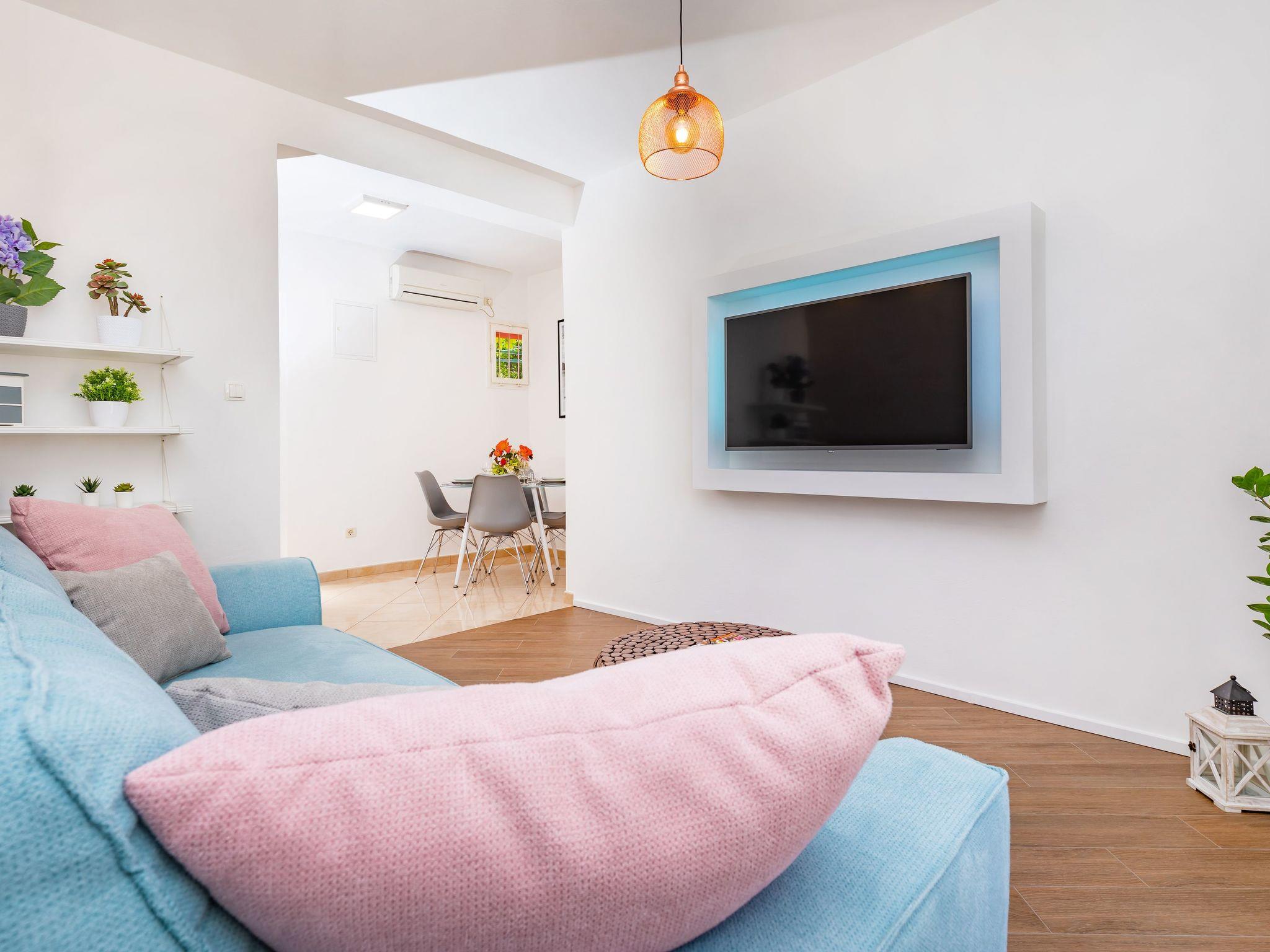Es besteht aus: 2 Schlafzimmer mit Doppelbett Wohnzimmer mit Schlafsofa und Flachbild-TV Küche mit Tisch und Stühlen Geschirrspüler, 2 Bäder mit Dusche und Waschmaschine große schattige Terrasse mit Grill und Holztisch und Stühlen Klimaanlage Babybett auf Anfrage Haustiere nicht erlaubt Parkplatz vor dem Haus Flughafentransfer-Service Geeignet für Menschen mit Auto Low Allergen Umwelt Kinder willkommen Wireless-Internet-Anschluss. Vorbereitung eines persönlichen Lebensmittel-Paket für die Ankunft auf Anfrage Broschüren/Stadtpläne Kapazität: Schlafplätze 4 + 2