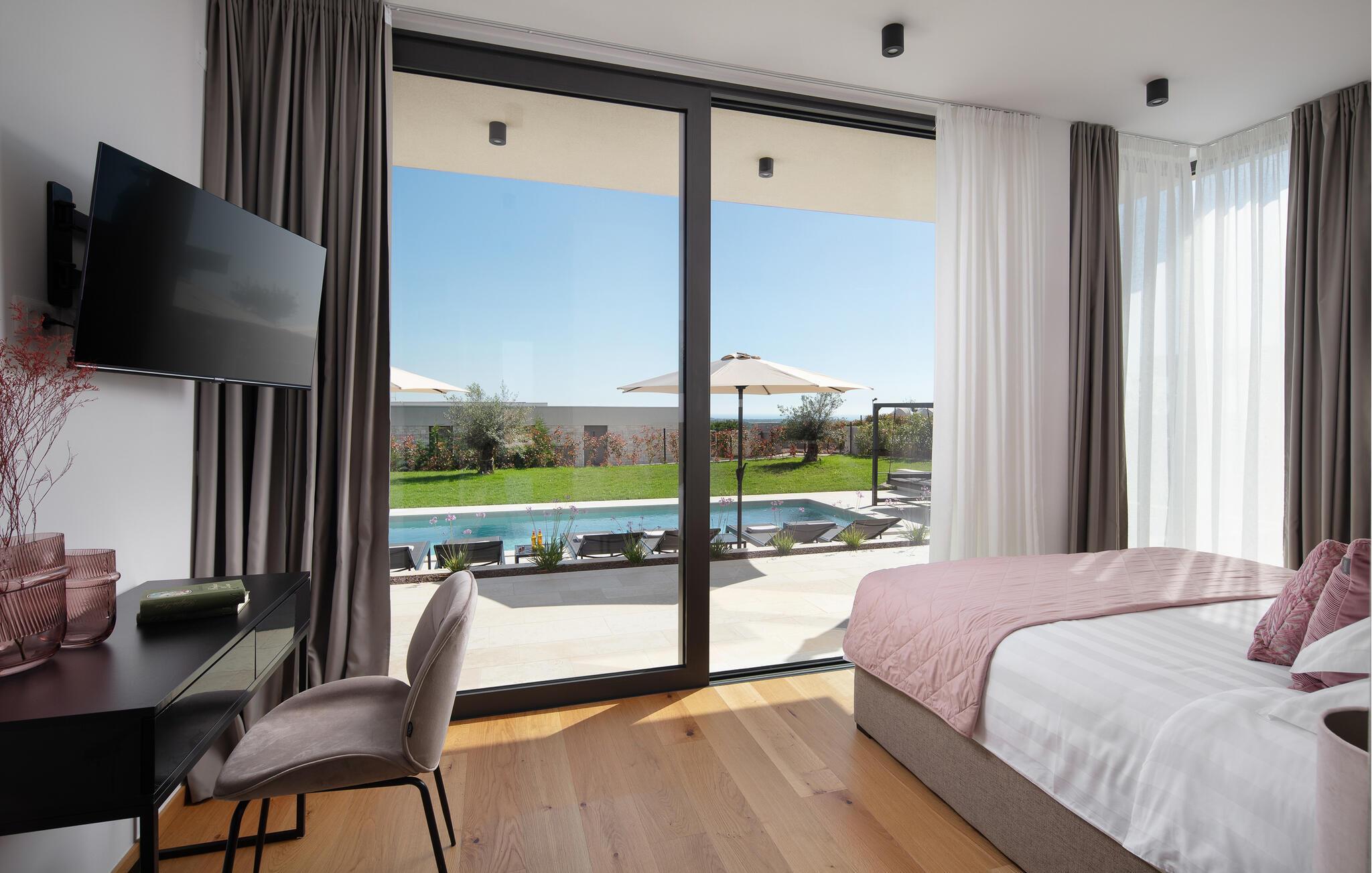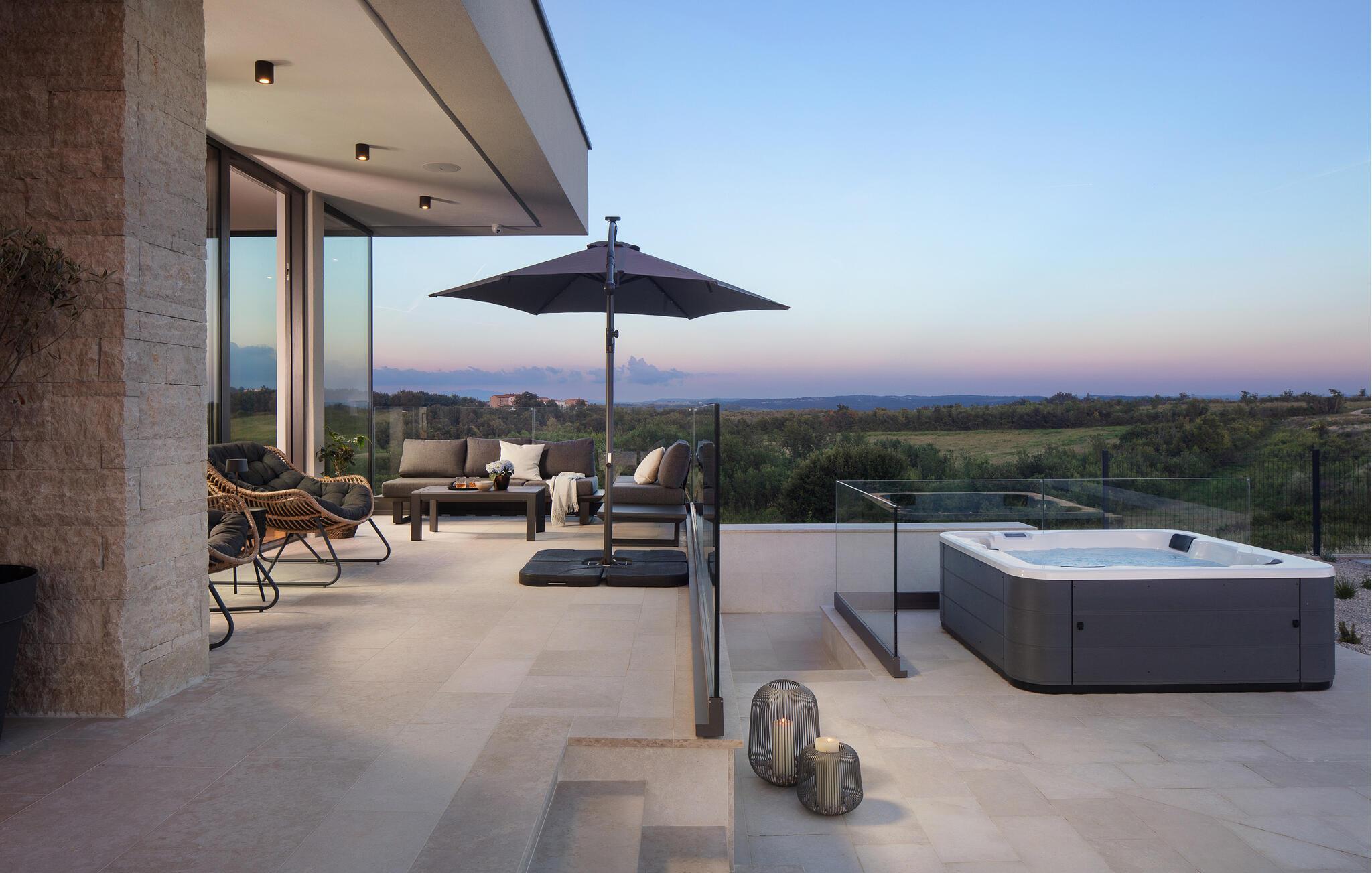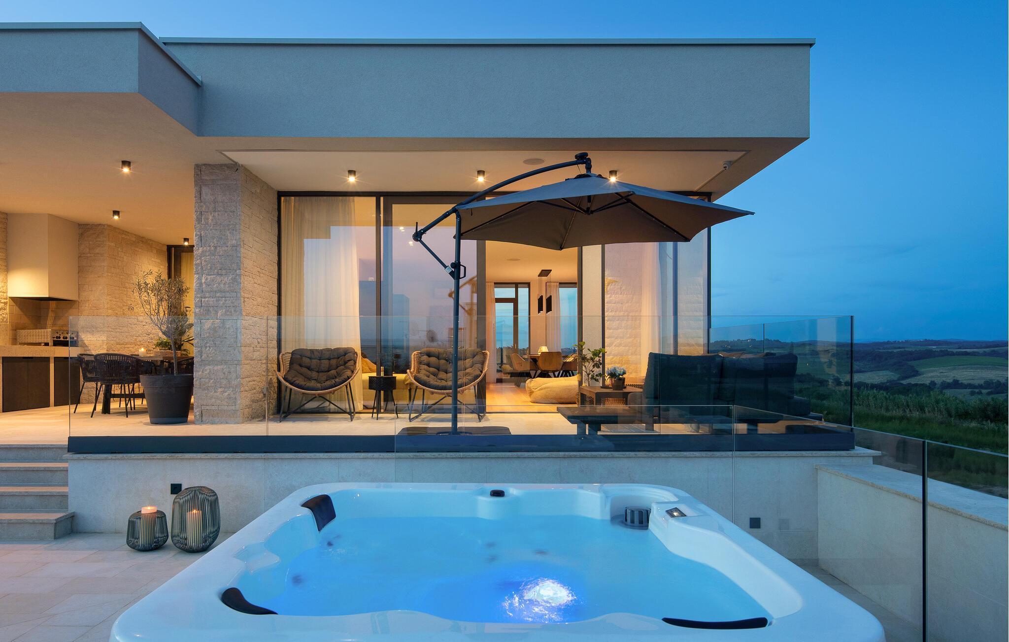 Auf der großen Terrasse und am Swimmingpool können Sie die Seele baumeln lassen, während das separate Fitnesshaus mit Panoramablick, Infrarotsauna und Whirlpool für Ihr persönliches Wellnesserlebnis sorgt.