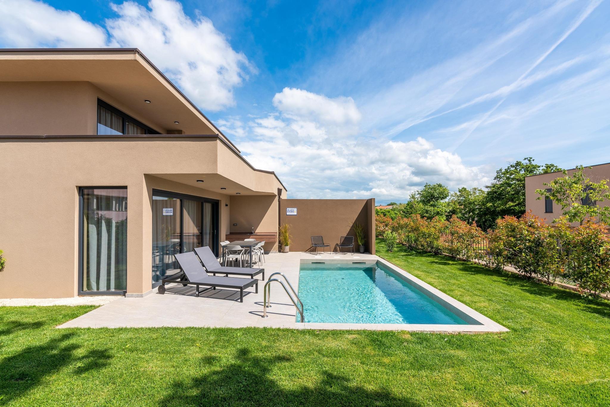 Parterre: (Wohnzimmer(Schlafcouch 1 Pers., TV(Flatscreen, Satellit), Sitzecke), Küche(Esstisch, Wasserkocher, Toaster, Kochherd, Kaffeemaschine, Backofen, Mikrowelle, Spülmaschine, Kühl-/Gefrierkombination, , Wine glasses), Schlafzimmer mit Badezimmer(Doppelbett, Dusche, Waschbecken, Toilette, Waschmaschine, Klimaanlage), Schlafzimmer mit Badezimmer(Doppelbett, Dusche, Waschbecken, Toilette, Klimaanlage), Terrasse(alleinige Nutzung)) Klimaanlage, Garten(alleinige Nutzung), Gartenmöbel, Liegen, Parkplatz, Pool(alleinige Nutzung), Gartenlounge