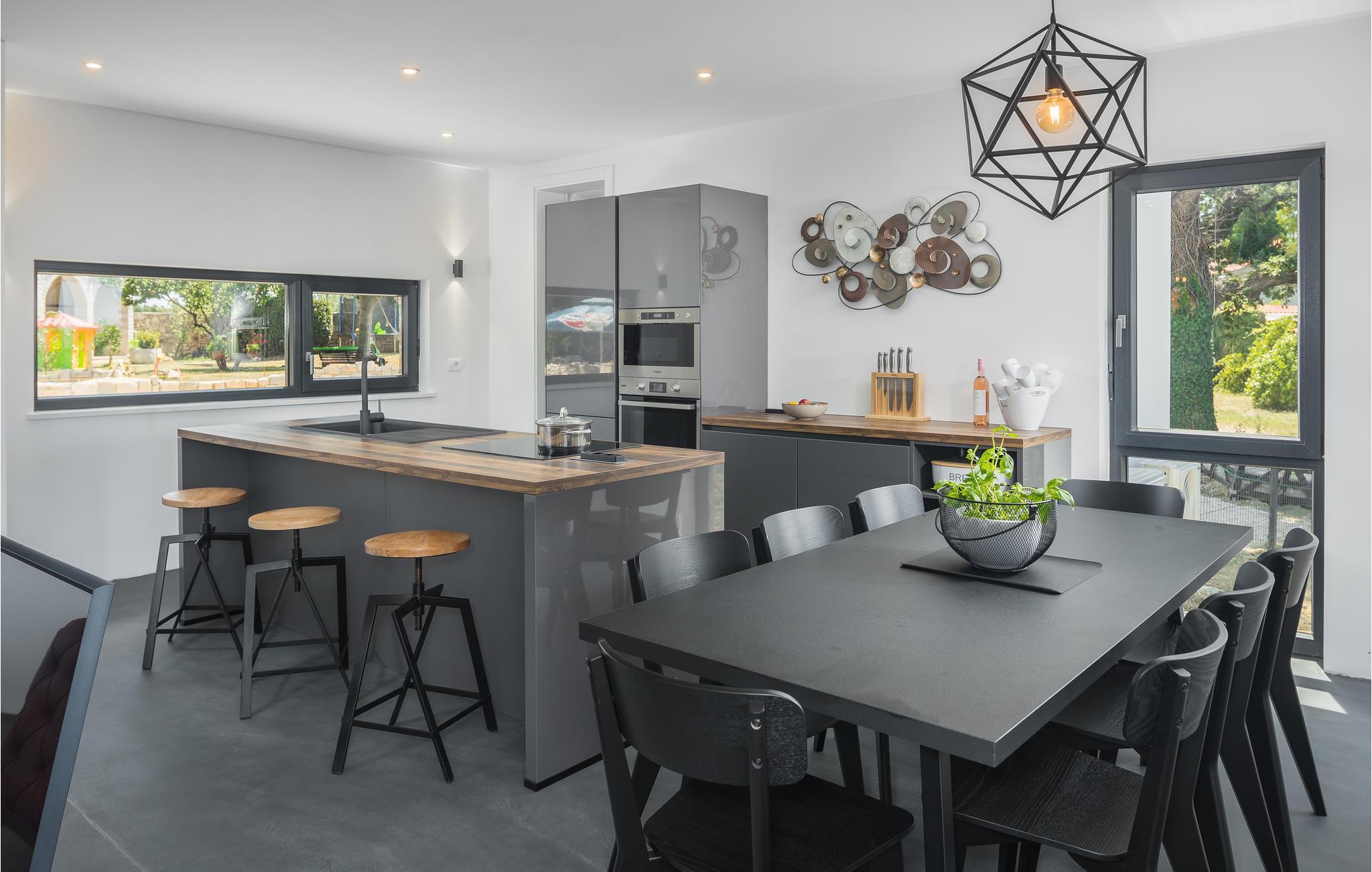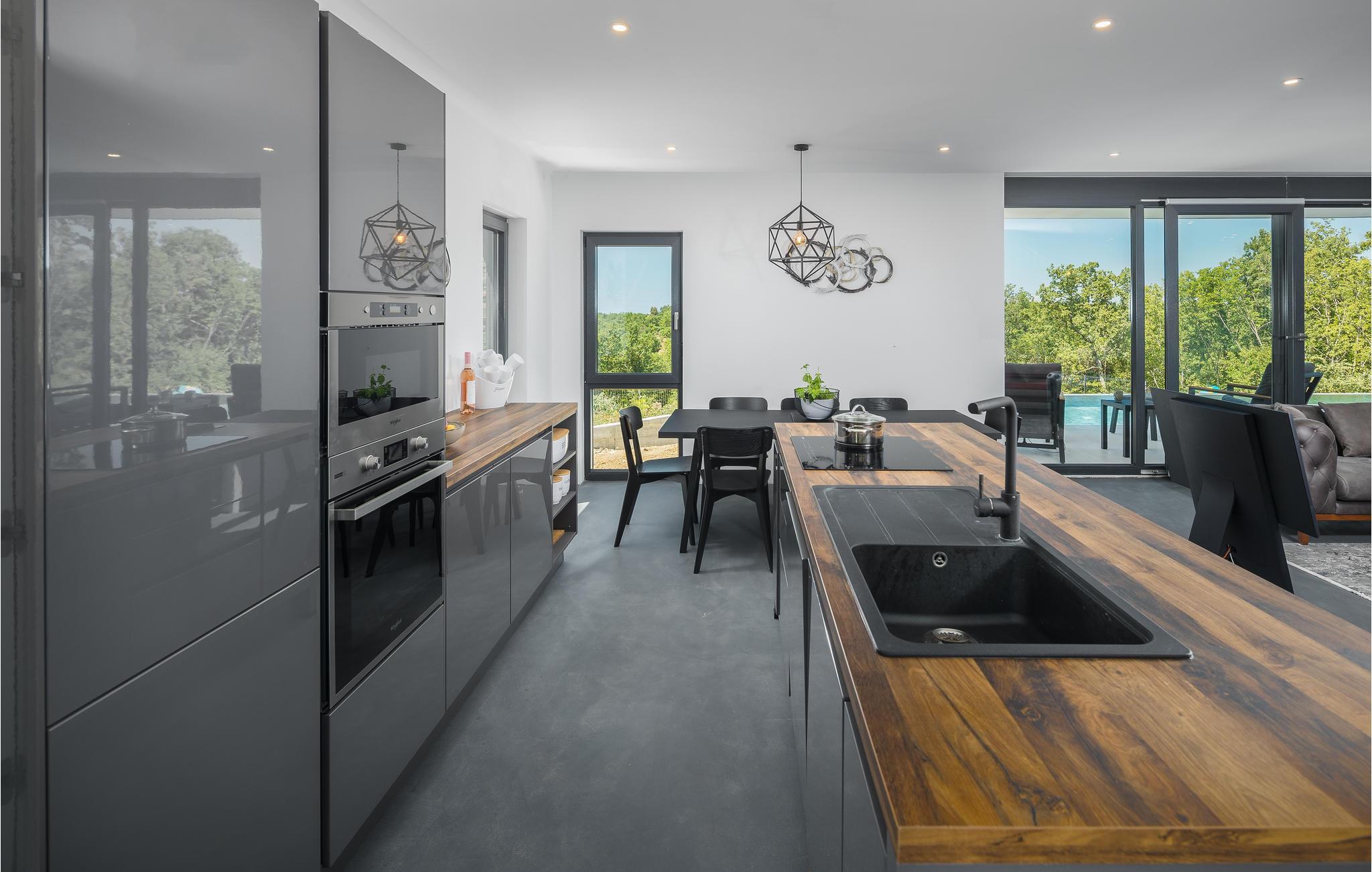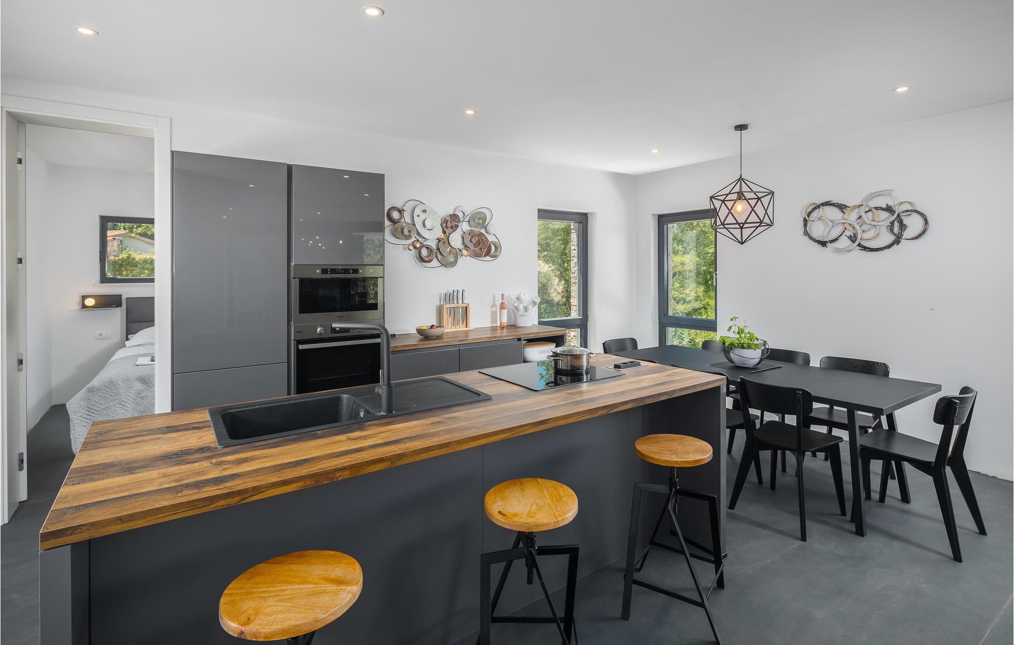 Der dunkle Einrichtungsstil des Hauses verleiht Eleganz und trotzdem können Sie es sich im Wohnraum gemütlich machen und die Beine hochlegen. Die tolle Küche gibt Ihnen den Raum gemeinsam Ihr Liebensessen zu kochen und auf der überdachten Terrasse zu essen.