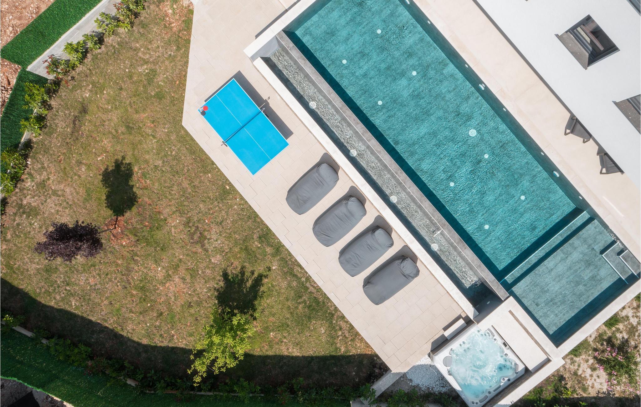 Der Infinity-Pool lädt Sie ein Ihre Bahnen zu ziehen und mit einem Glas Wein in die umliegende grüne Vegetation zu blicken.