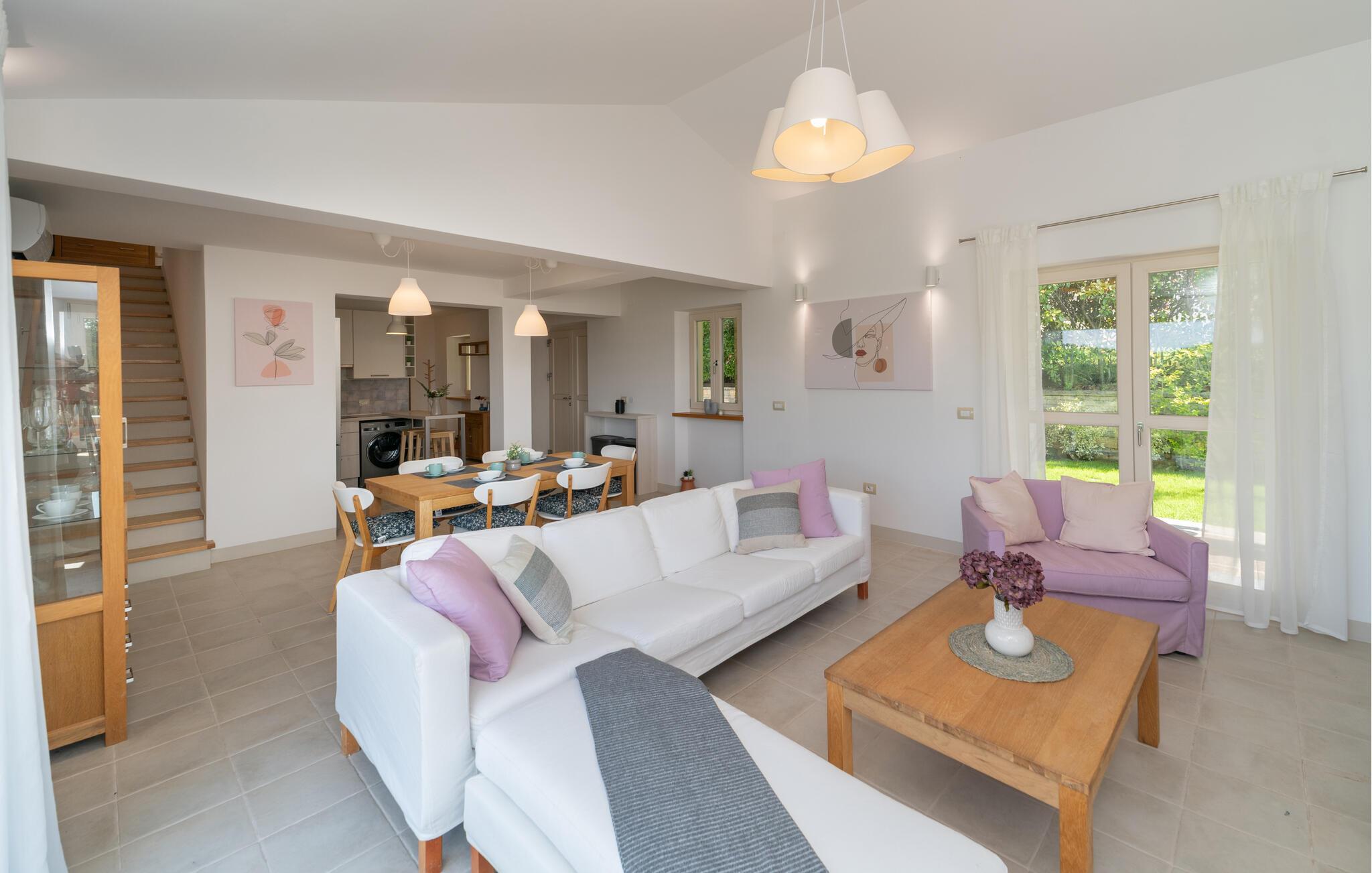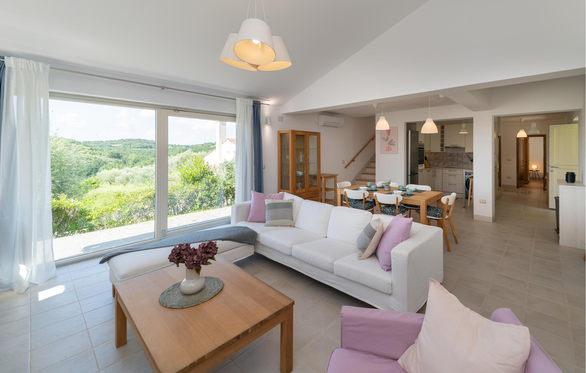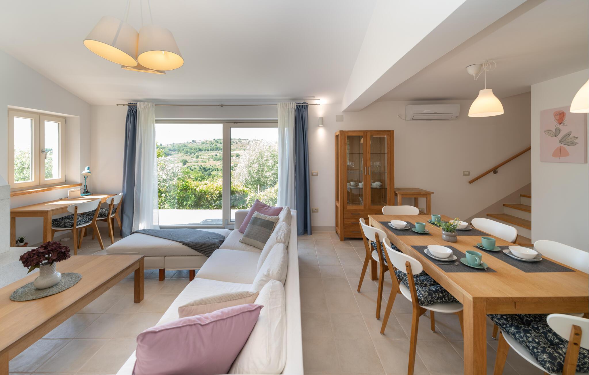 Verbringen Sie in diesem einladenden Haus eine unvergessliche Auszeit mit Ihren Lieben. In den wohnlich und mit ansprechenden Farben eingerichteten Innenräumen des Hauses haben Sie viel Platz für eine schöne gemeinsame Zeit. Versammeln Sie die ganze Familie zu einem leckeren Abendessen am langen Esstisch und machen Sie es sich später zusammen auf dem Sofa gemütlich, wo Sie den Blick weit über die Landschaft schweifen lassen können.