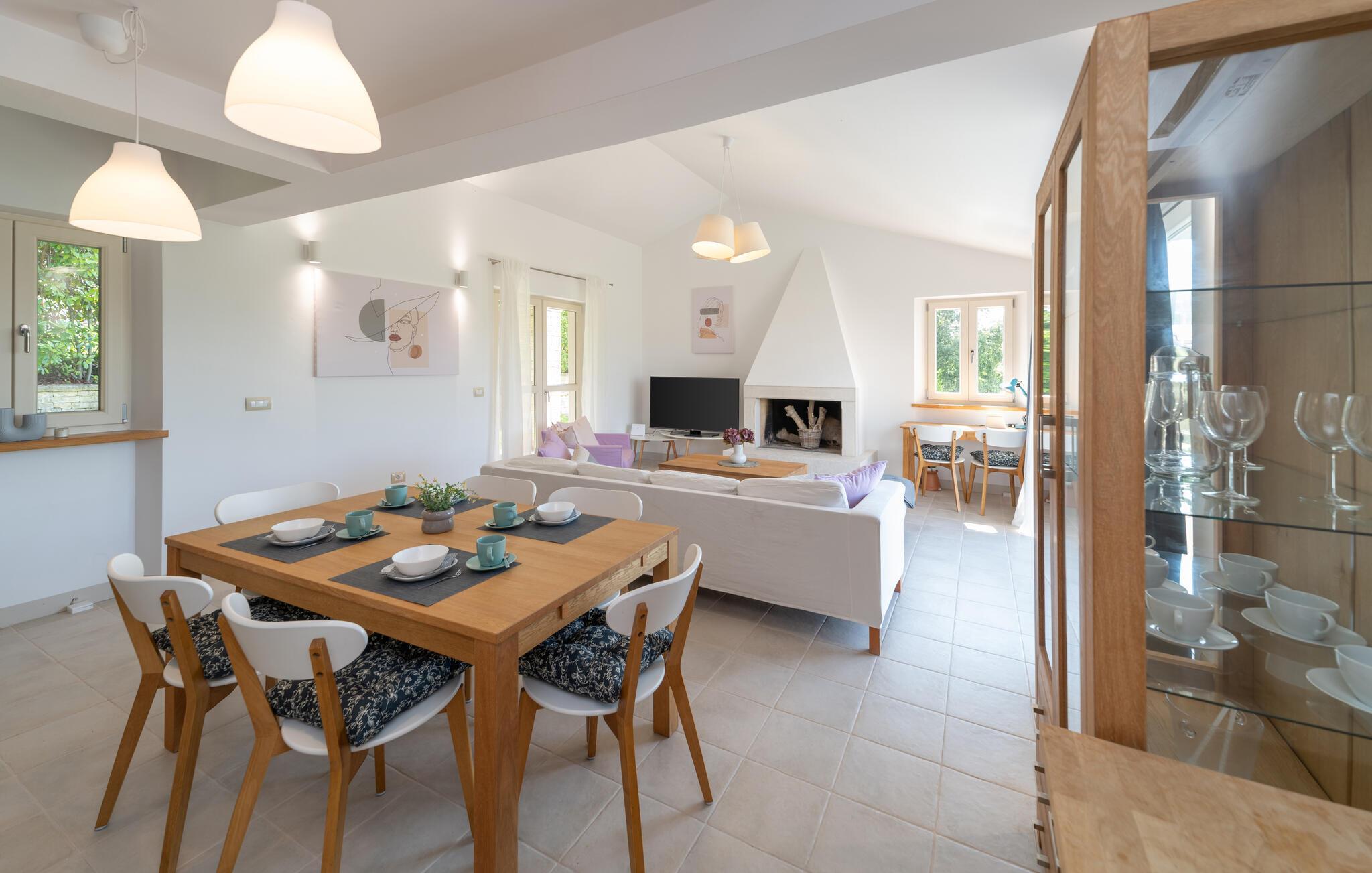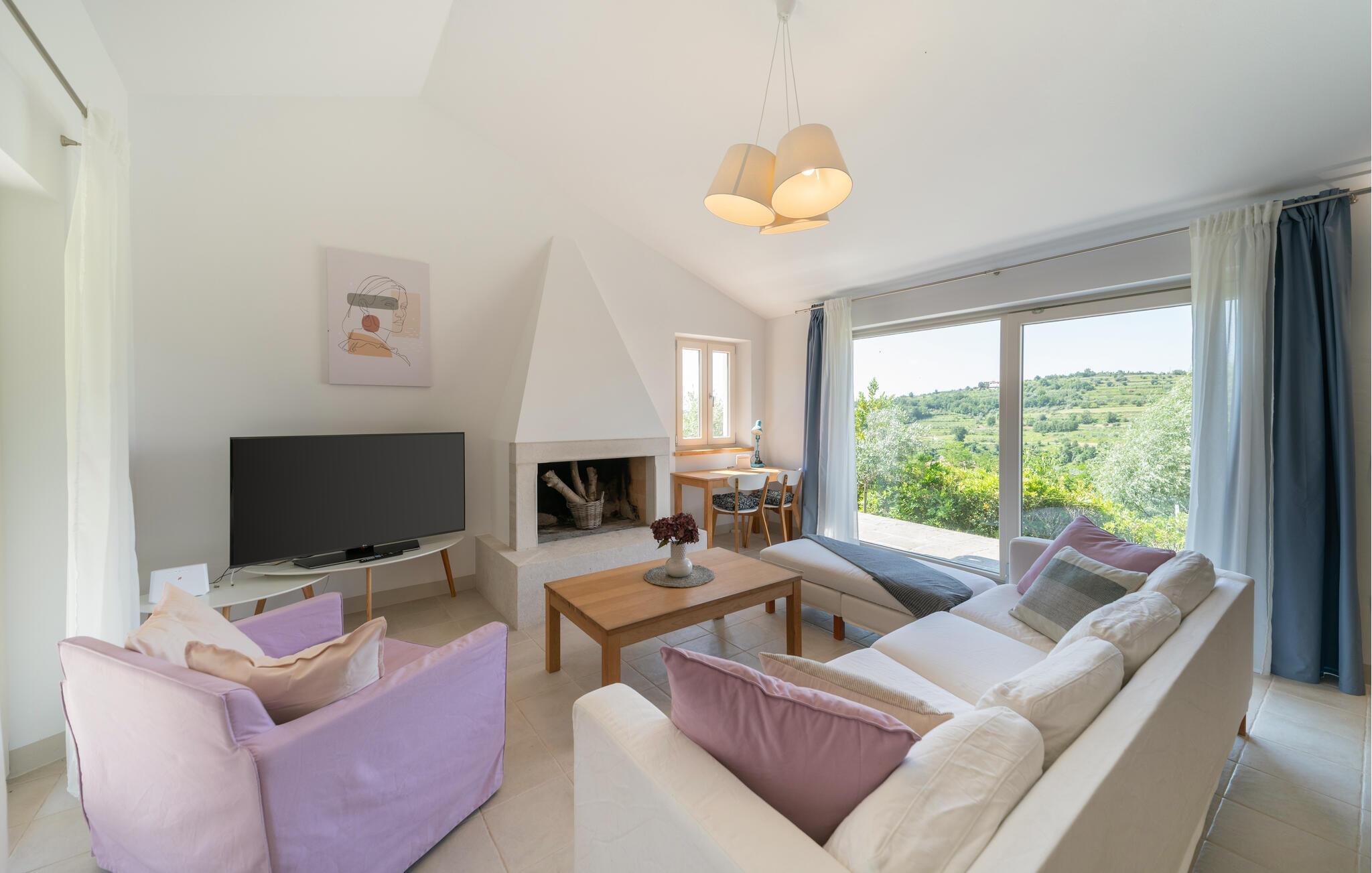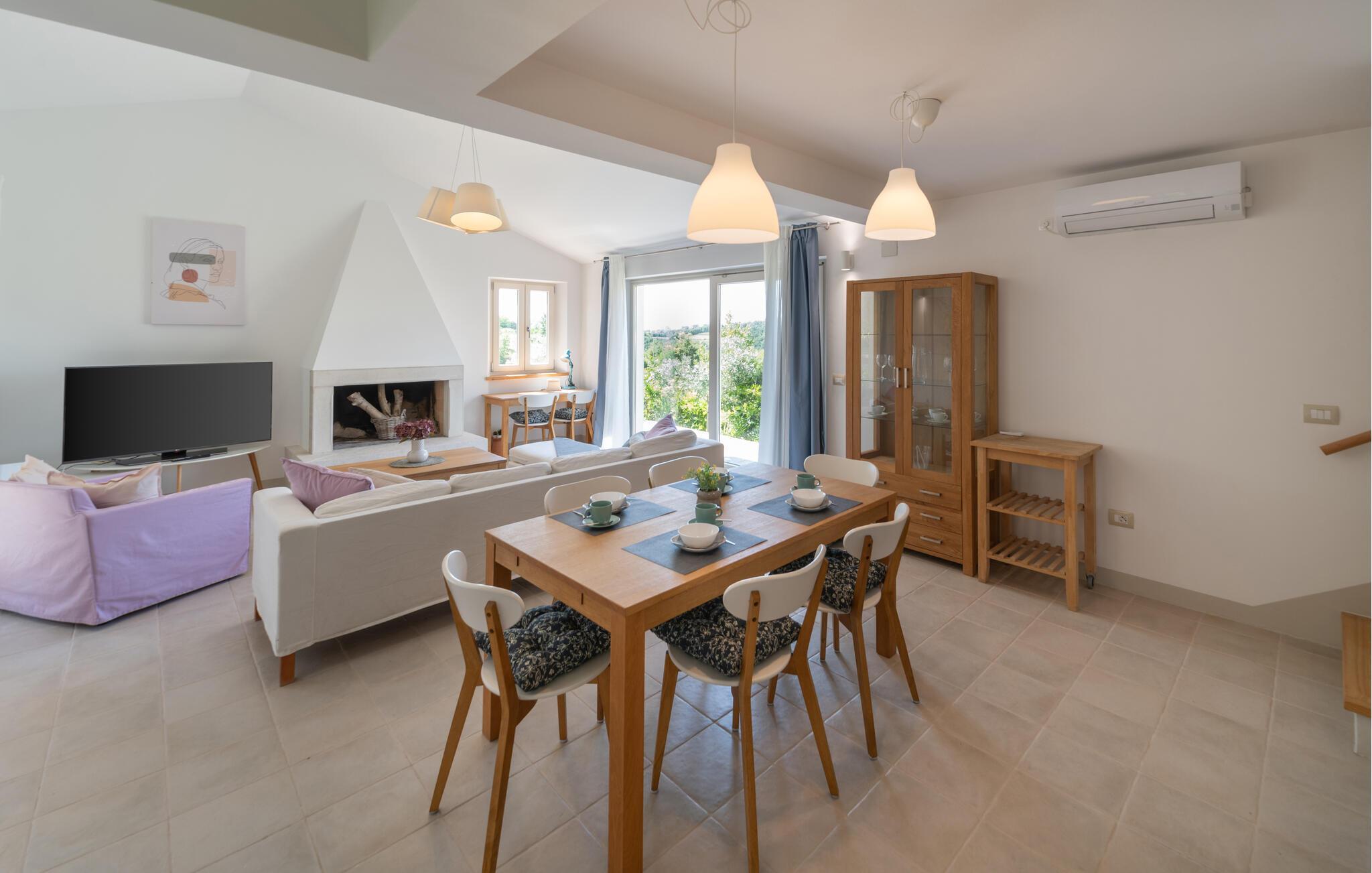 Verbringen Sie in diesem einladenden Haus eine unvergessliche Auszeit mit Ihren Lieben. In den wohnlich und mit ansprechenden Farben eingerichteten Innenräumen des Hauses haben Sie viel Platz für eine schöne gemeinsame Zeit. Versammeln Sie die ganze Familie zu einem leckeren Abendessen am langen Esstisch und machen Sie es sich später zusammen auf dem Sofa gemütlich, wo Sie den Blick weit über die Landschaft schweifen lassen können.