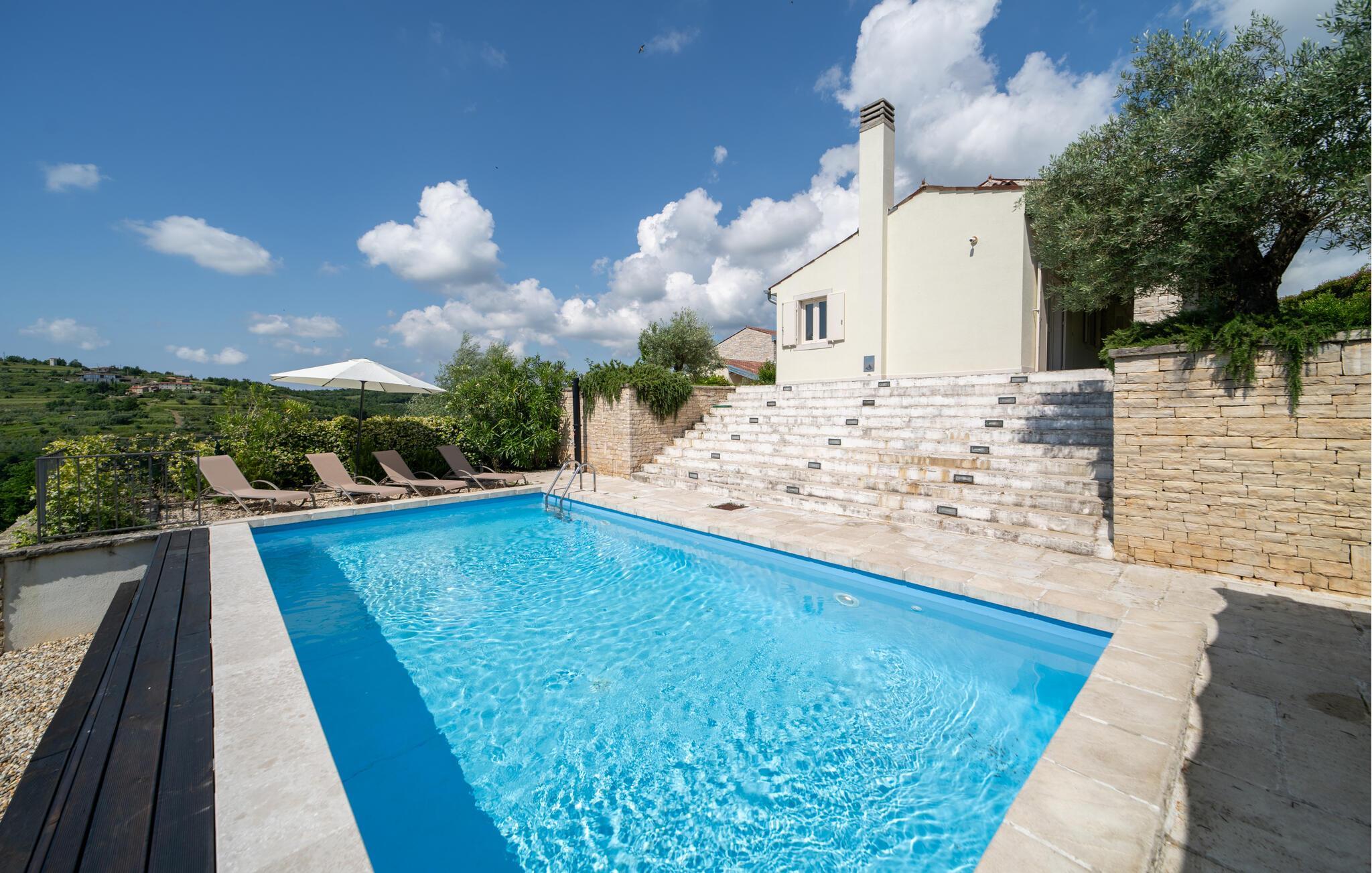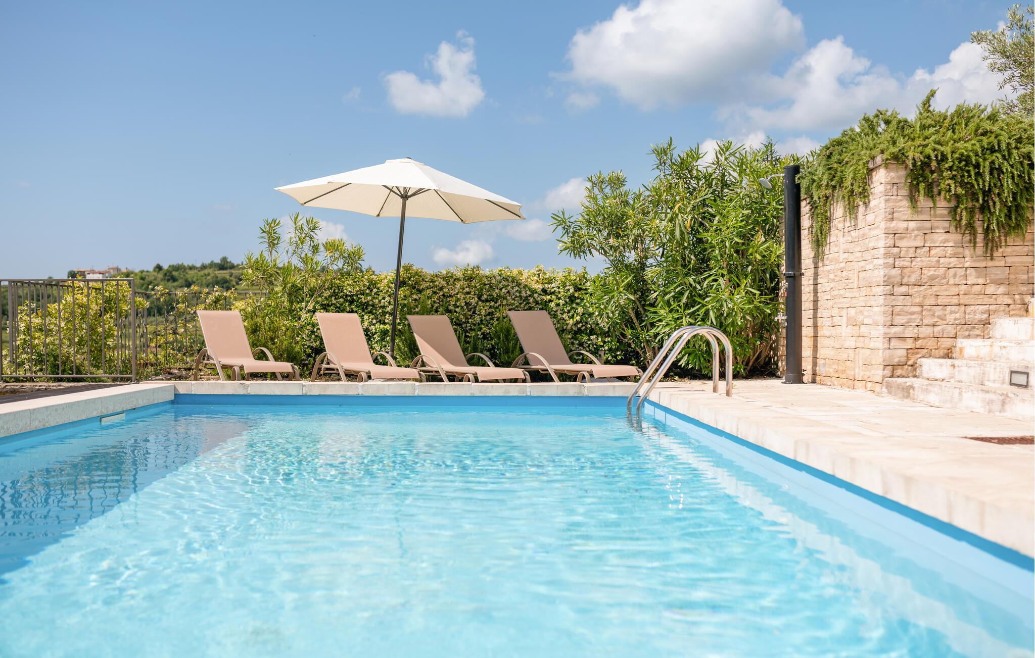 Treten Sie ins Freie, genießen Sie die Sonne und die wunderbare Aussicht auf den Terrassen in vollen Zügen und machen Sie es sich im Liegestuhl am Pool umgeben von Natur bequem.