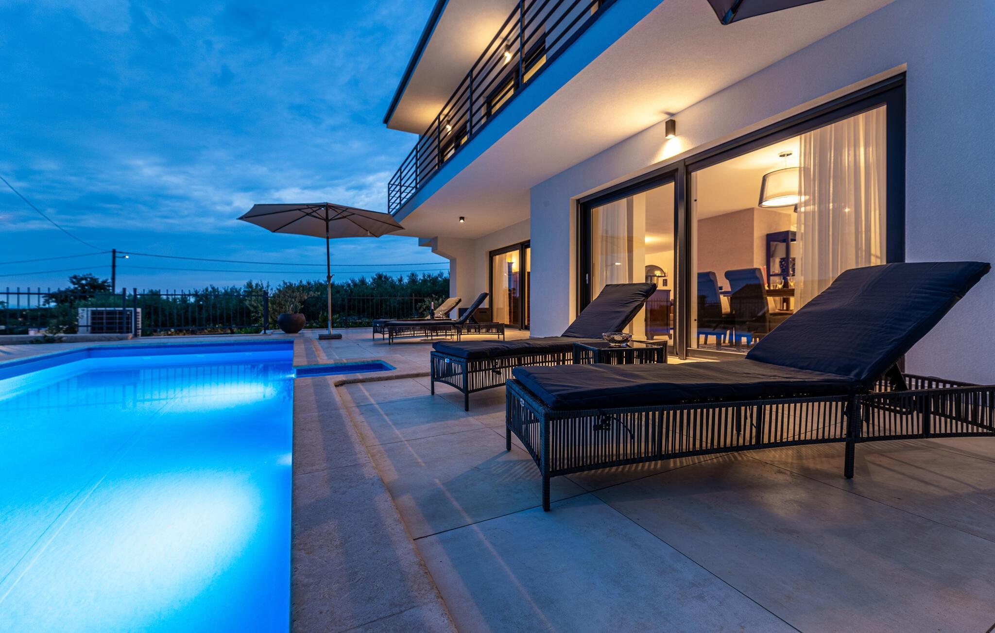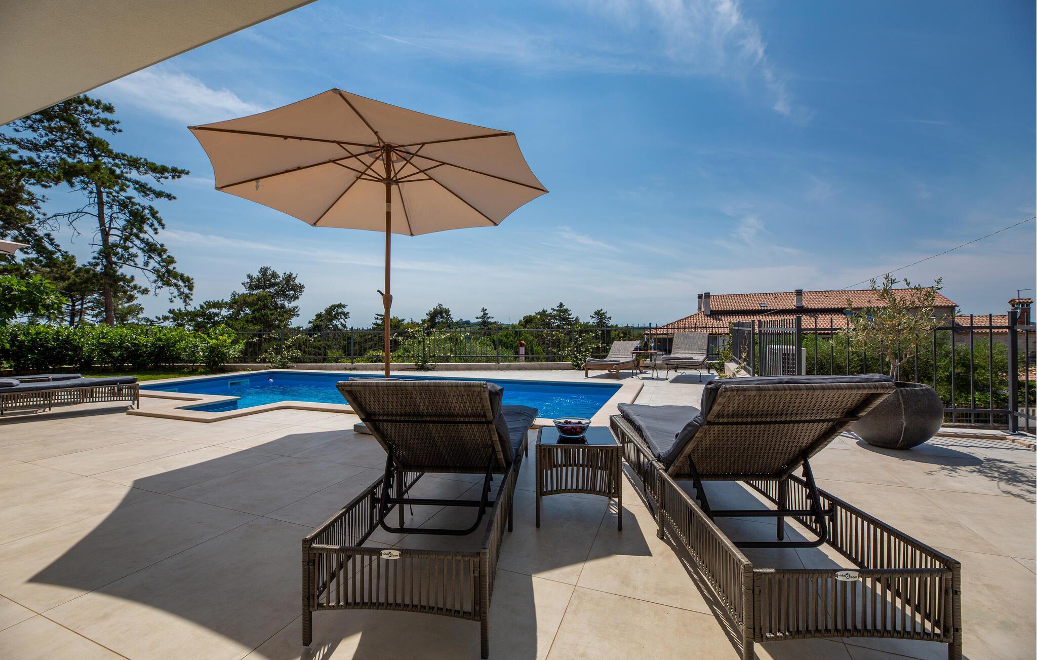 In einem ruhigen Ort heißt Sie dieses moderne und große Ferienhaus mit Pool und Meerblick willkommen.