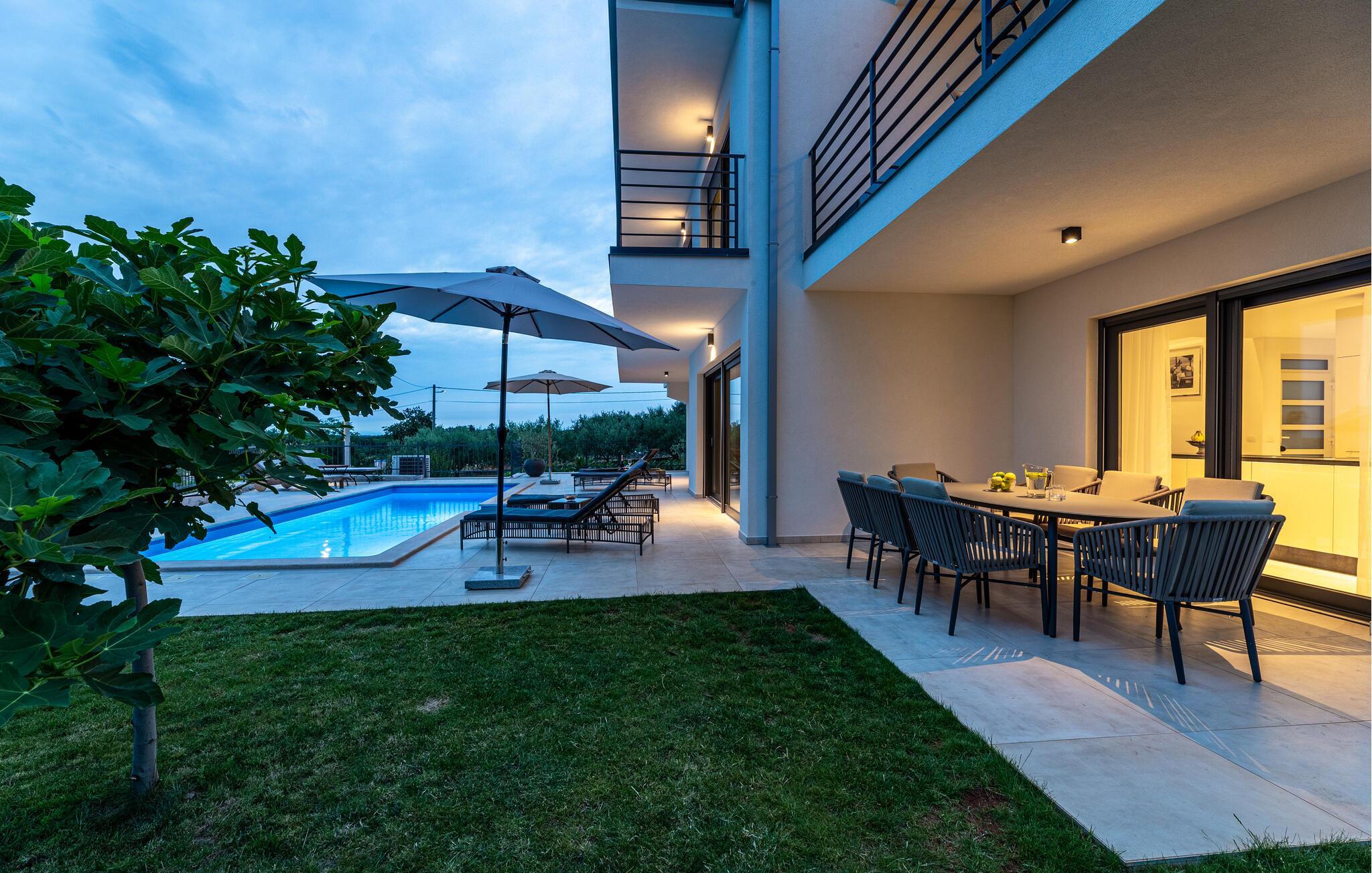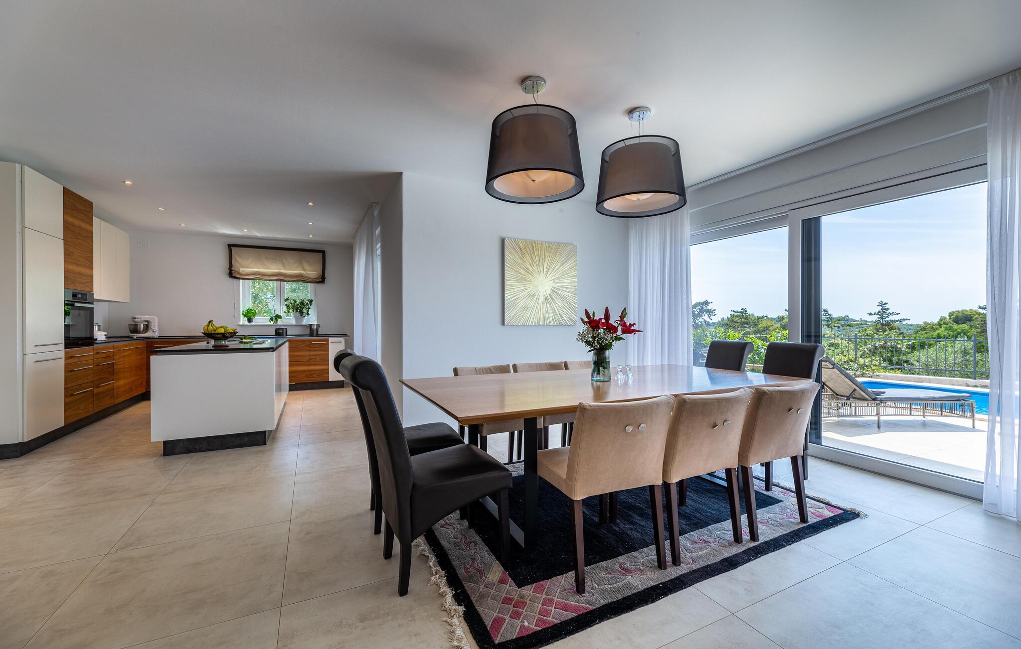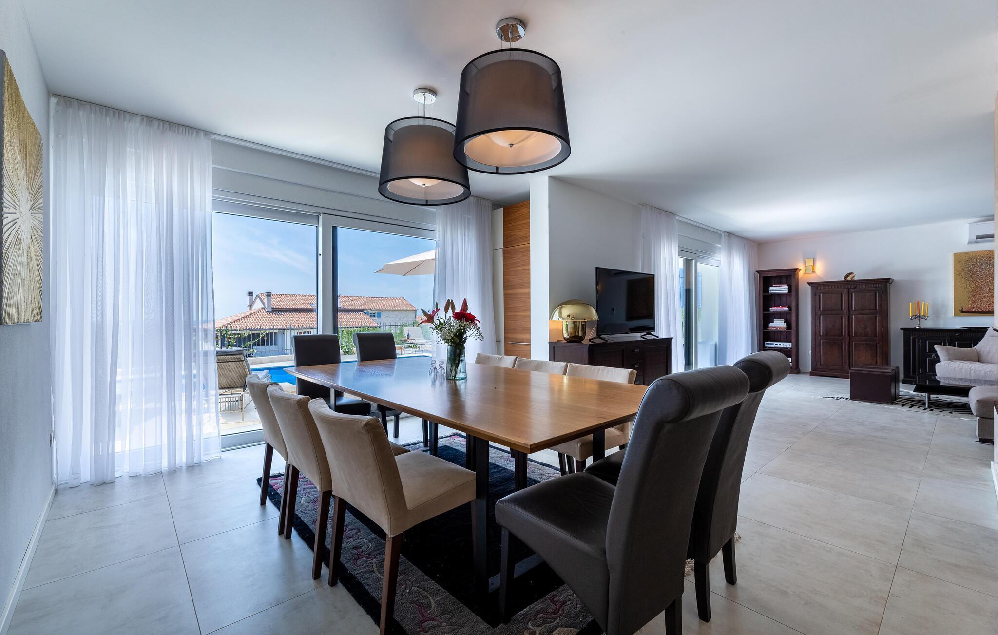 Freuen Sie sich auf Ihren Urlaub in diesem voll ausgestatteten Haus in moderner Bauweise. Das geräumige Ferienhaus bietet Ihnen auf zwei Etagen Komfort, Wohlbefinden und ansprechendes Design und somit eine wahre Wohlfühloase schafft. Das Zusammenspiel aus hellen und dunklen Farben sowie Holz strahlen Eleganz und ein großartiges Wohnambiente aus, in dem Sie zur Ruhe kommen können. Egal ob gemütliche Kaminabende bei einem unterhaltsamen Film oder vielen Sonnenstunden im Garten beim Sonnen und Baden, Sie können hier einfach die Seele baumeln lassen und vom Balkon die Weitsicht über die Landschaft Istriens, bis hin zum Meer.
