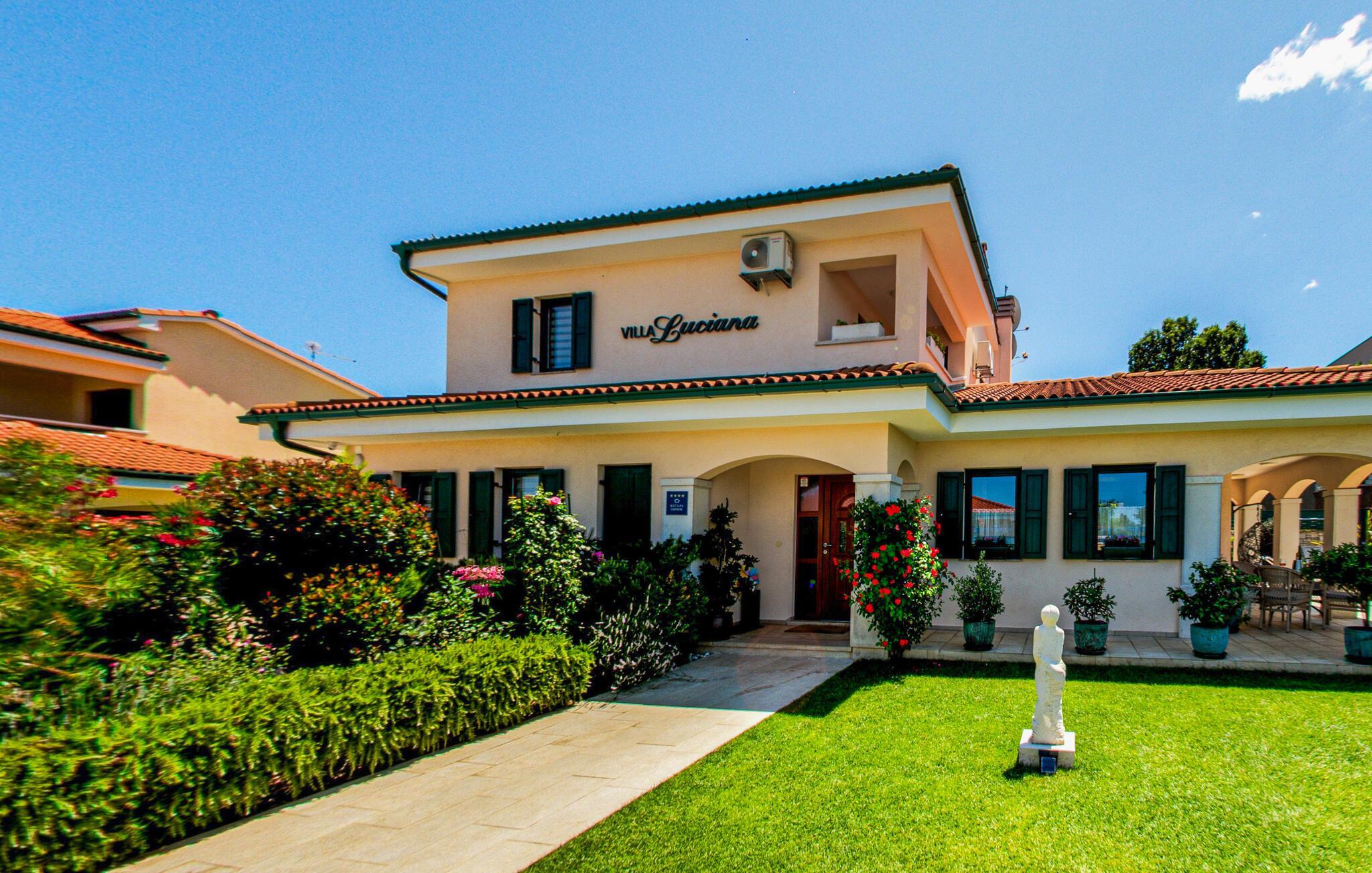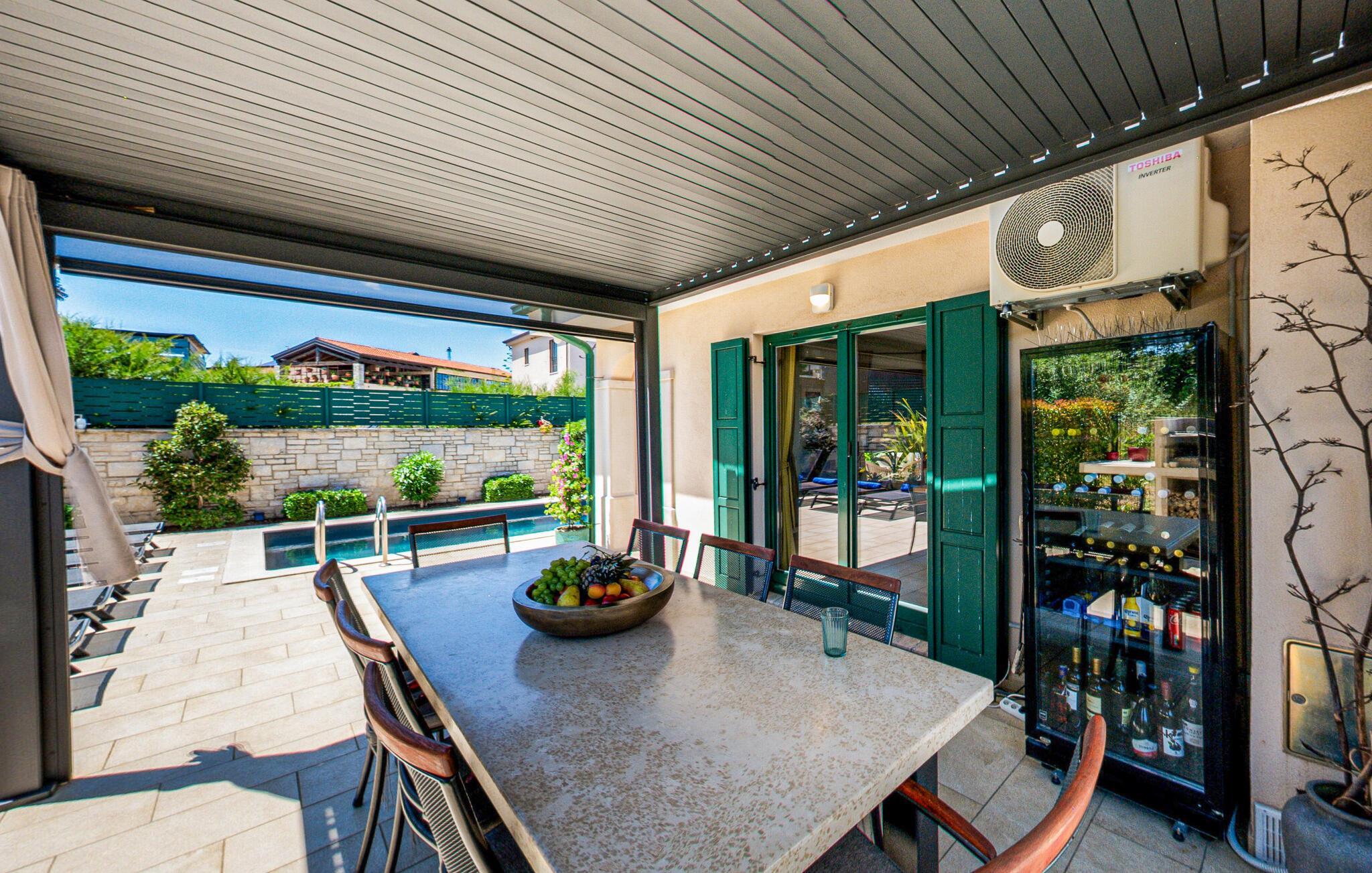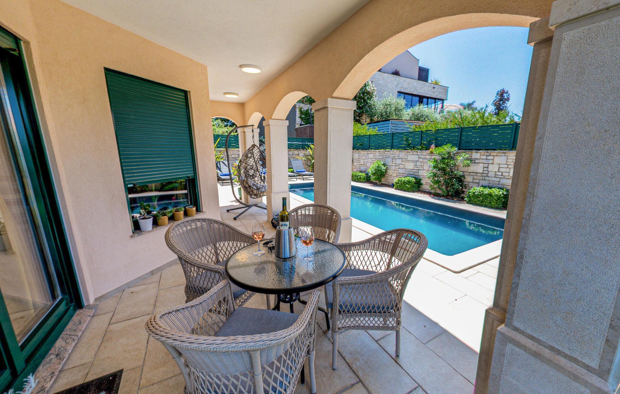 Treten Sie beim ersten Sonnenstrahl auf die großzügige Terrasse und genießen Sie die mediterrane Stimmung. Springen Sie in den Pool und nehmen Sie ein erfrischendes Bad, bevor Sie sich mit einem kühlen Getränk auf den Sonnenliegen entspannen.