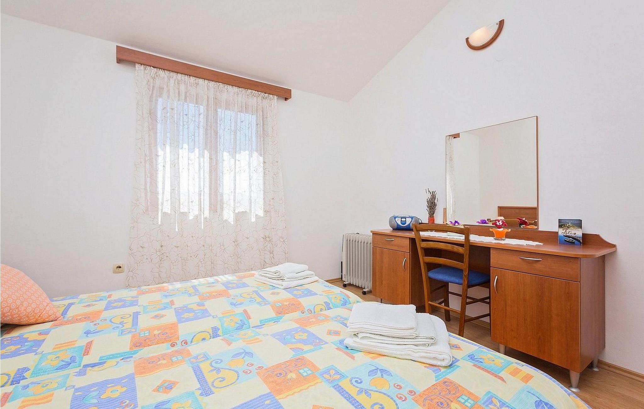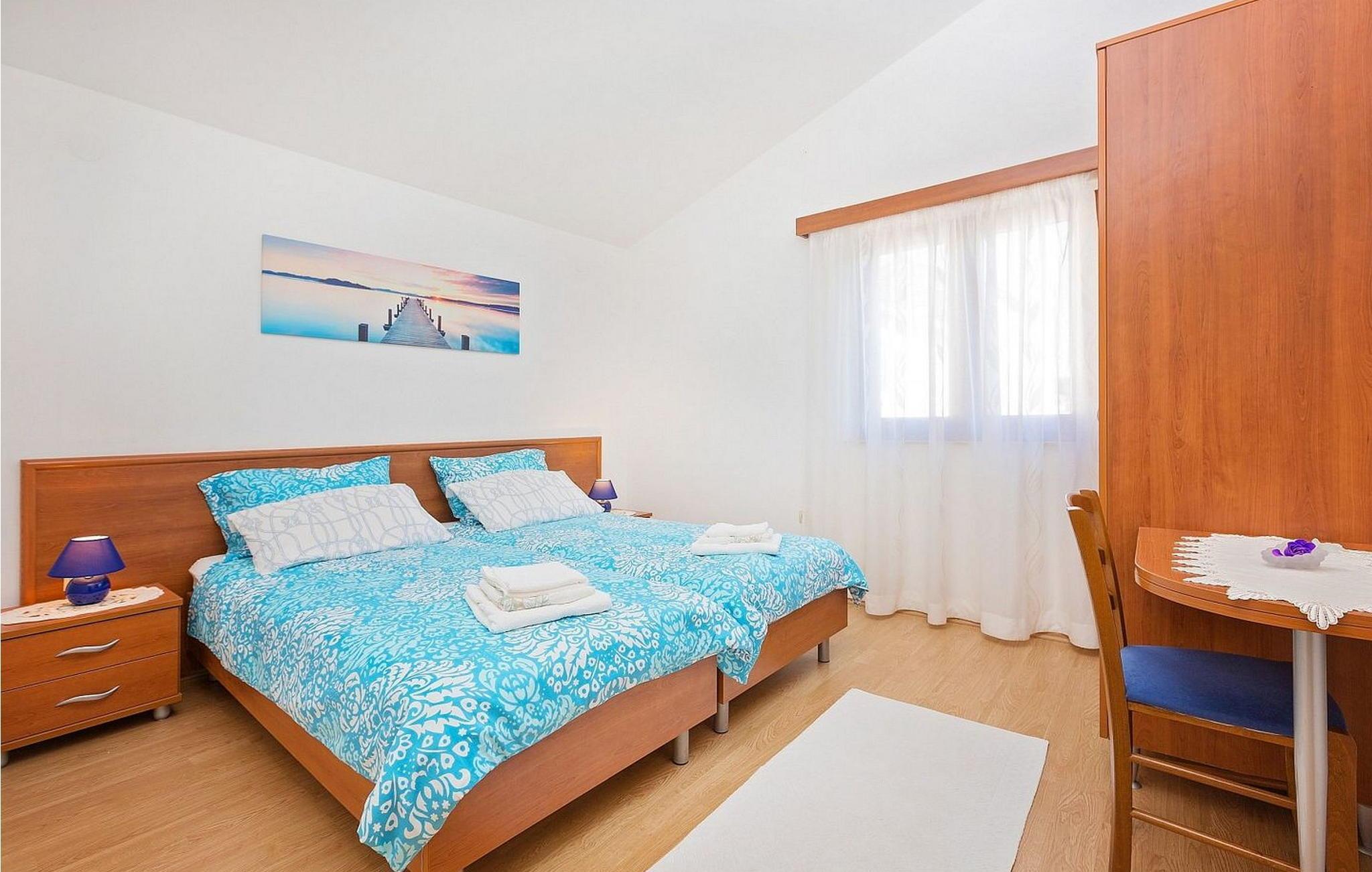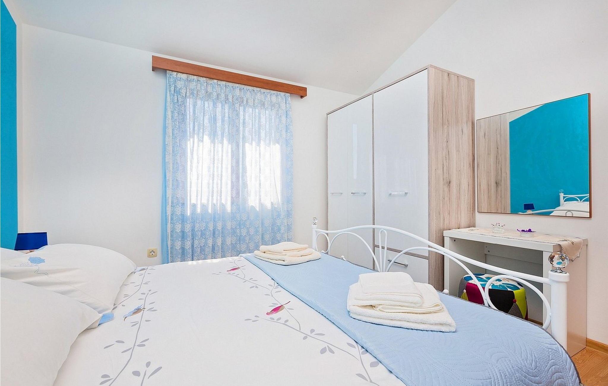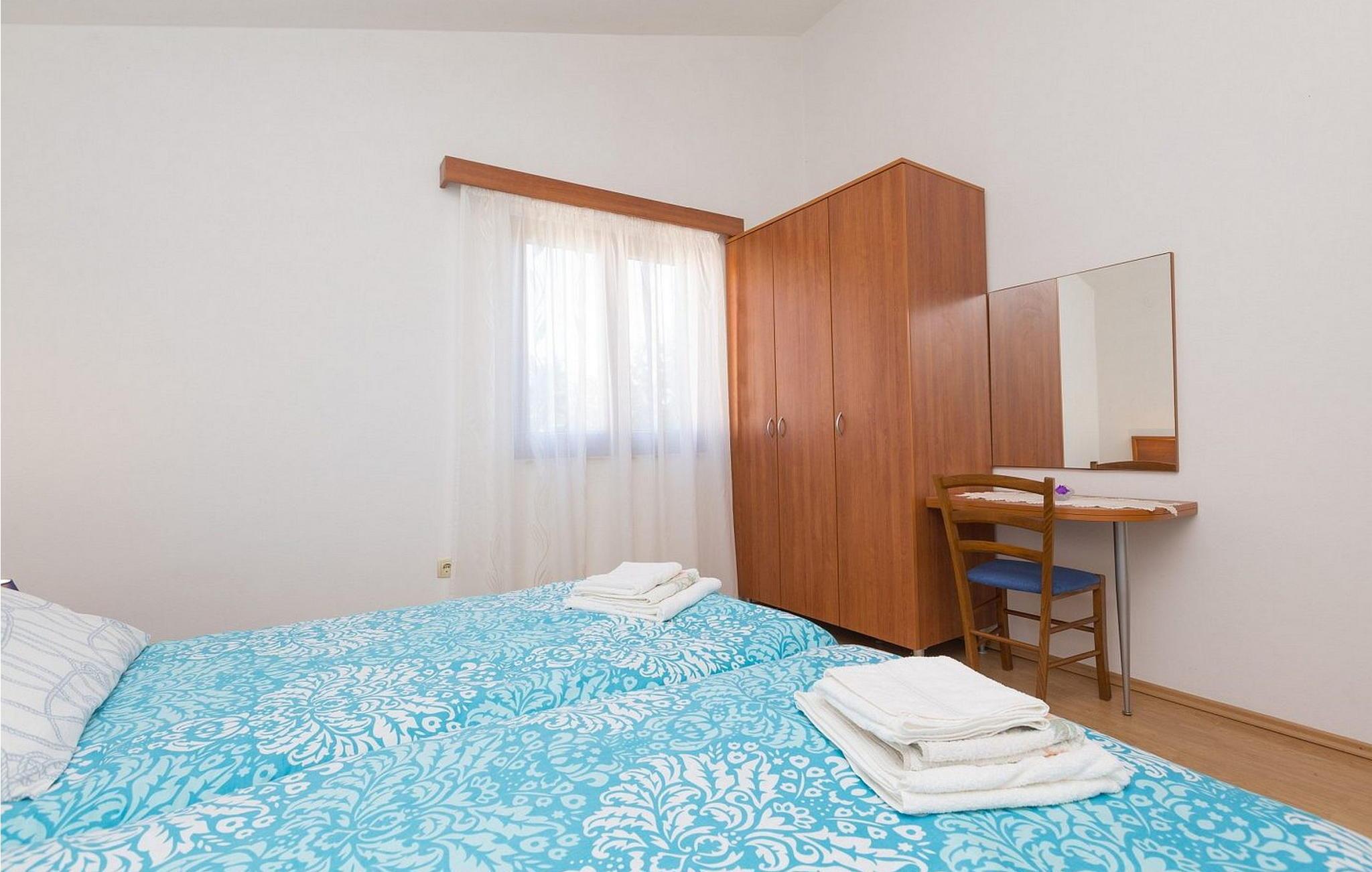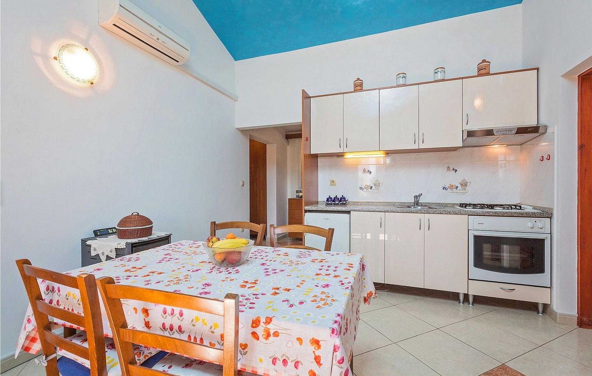 Ferienhaus für 6-8 Personen von 140 qm besteht aus Erdgeschoss mit voll ausgestatteter Konoba, Einzelzimmer mit Schlafsofa für eine Person und eigener Dusche/WC. Auf den ersten Stock, der mit Außentreppen verbunden ist, befindet sich ein kleiner Wohnbereich mit Küche und Esstisch, Schlafzimmer mit zwei Einzelbetten und eigener Dusche/WC, Doppelzimmer, Schlafzimmer mit zwei Einzelbetten, Dusche/WC.