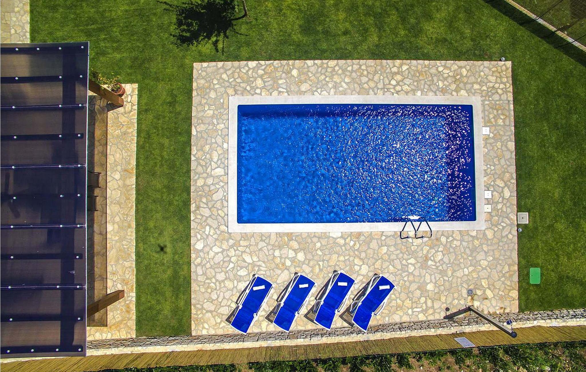 Das Ferienhaus liegt auf eigenen Grundstück mit gepflegten Rasen, Außenpool von 32 qm, überdachter Terrasse mit Esstisch und Grill, und Parkplatz für zwei Fahrzeuge.