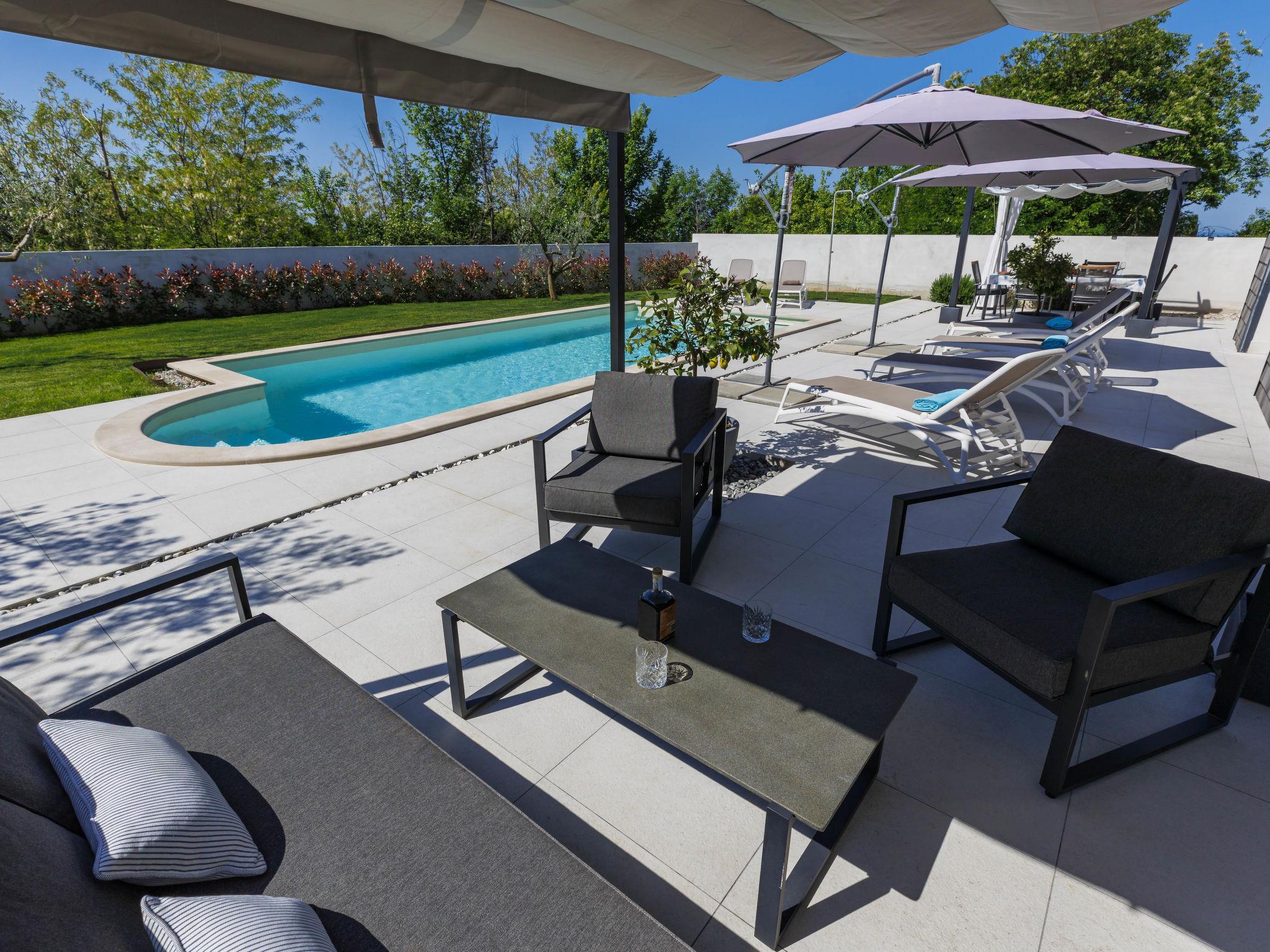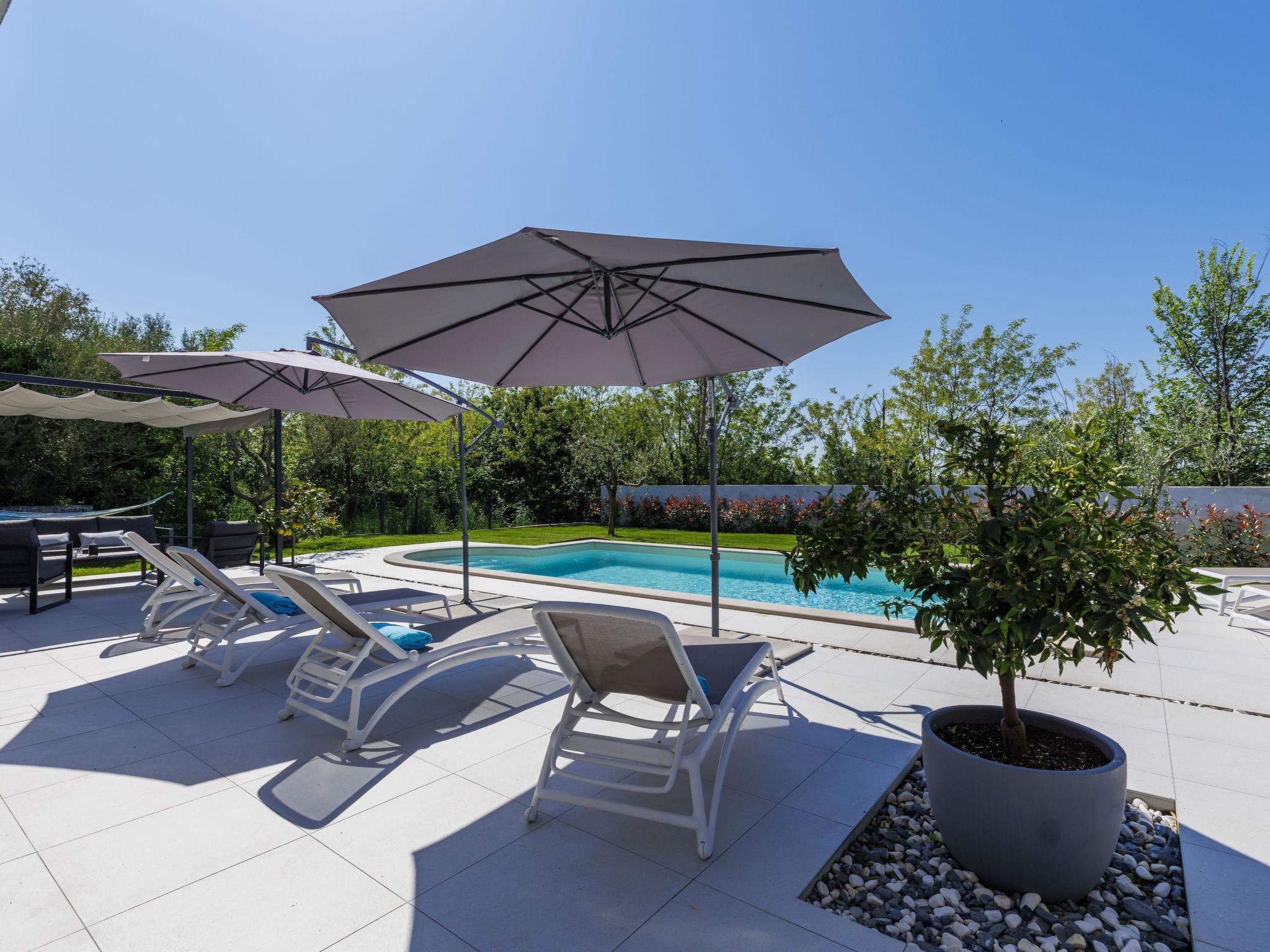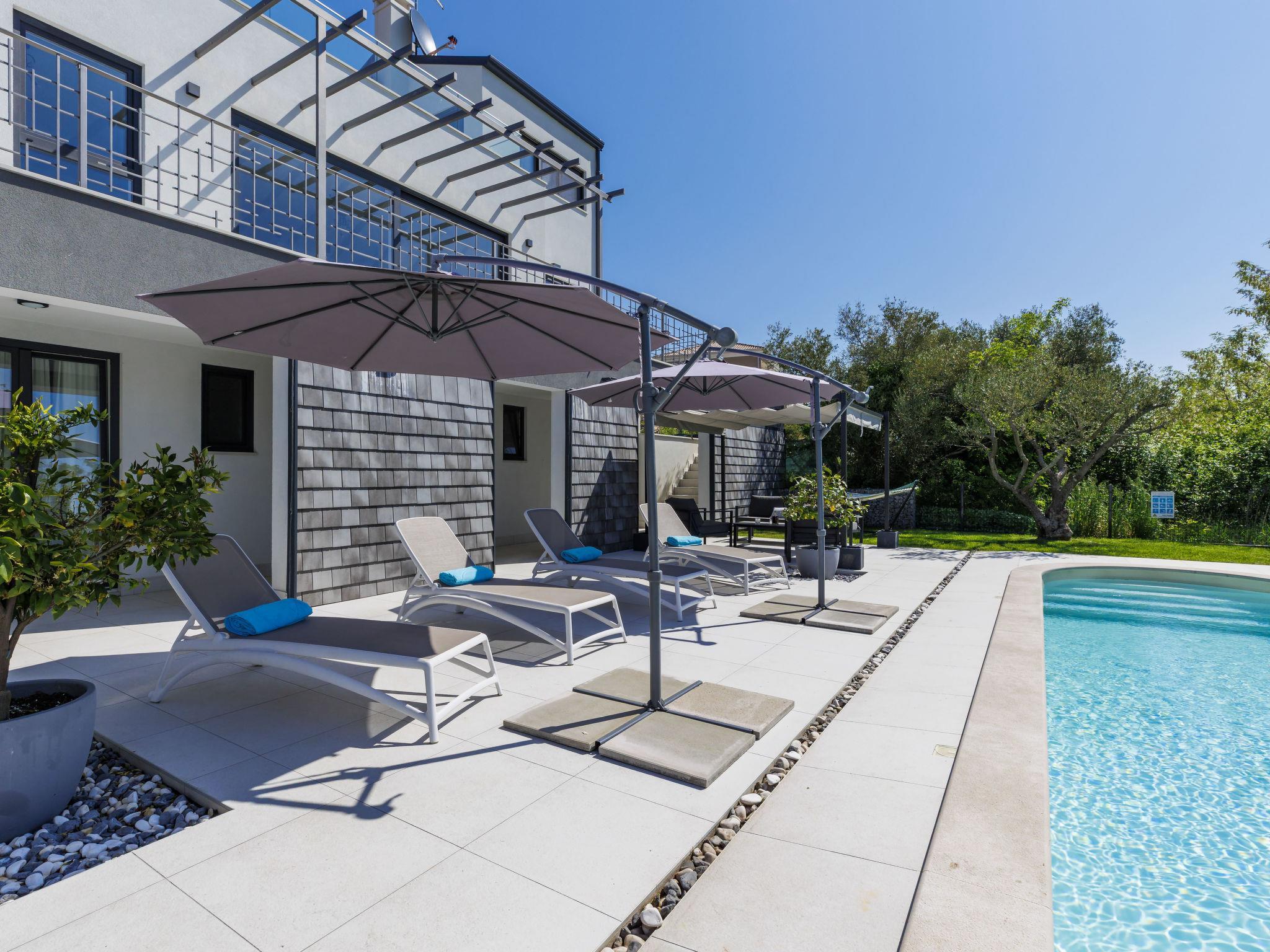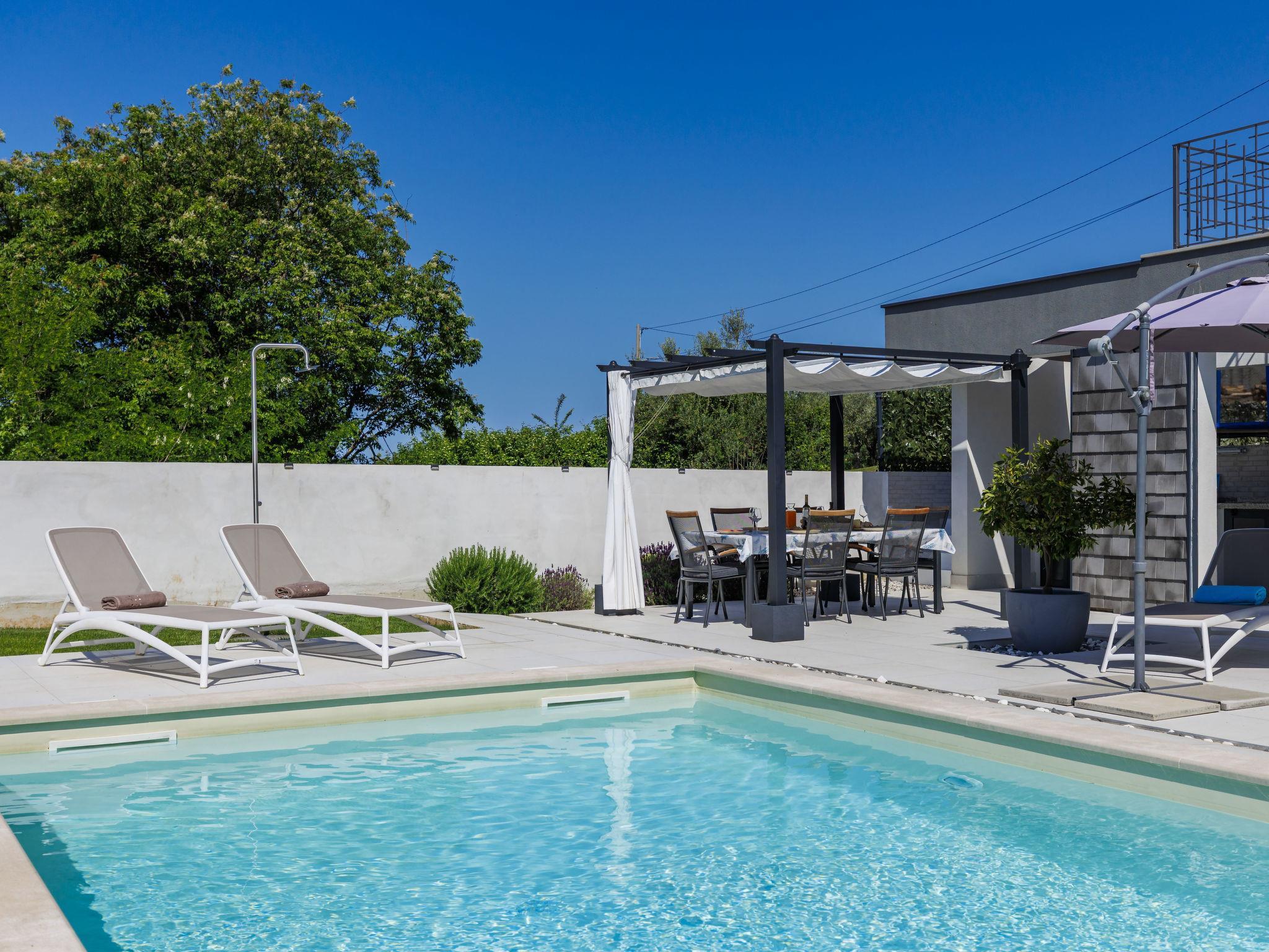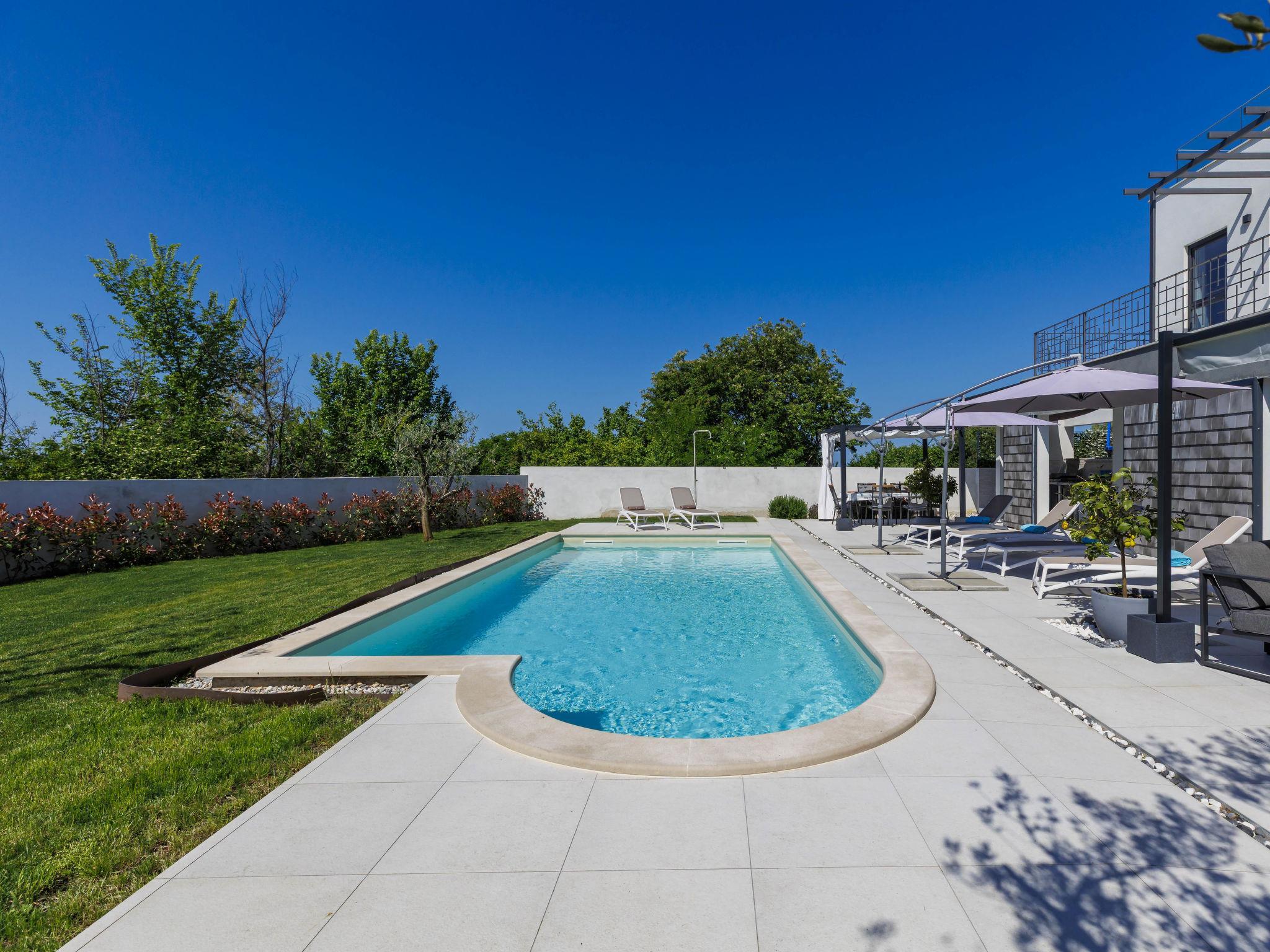 Schönes Einfamilienhaus "Villa Sonja". Ausserhalb des Ortes, 1 km vom Zentrum von Buje, sonnige Lage, 12 km vom Meer. Zur Alleinbenutzung: Grundstück 500 m2, Garten mit Rasen, Schwimmbad eckig (8 x 4 m, 150 cm tief, saisonale Verfügbarkeit: 01.Mai. - 31.Okt.) mit Innentreppe und Salzelektrolyse-Reinigungssystem. Aussendusche, Tischtennis, Grill, Kinderspielplatz (Rutschbahn, Schaukel), Poolpflege durch den Besitzer/Gärtner. Im Hause: Internetzugang, Trampolin, Waschmaschine, Wäschetrockner. Parkplatz (für 2 Autos) beim Haus auf dem Grundstück. Einkaufsgeschäft 1 km, Supermarkt 1 km, Restaurant 2 km, Bushaltestelle 800 m, Kieselstrand 12 km, Felsstrand 12 km. Golfplatz (18 Loch) 18 km, Wanderwege ab Haus 200 m, Radweg 250 m. Der Besitzer akzeptiert keine Jugendgruppen. Das veranstalten von Feiern ist nicht gestattet.