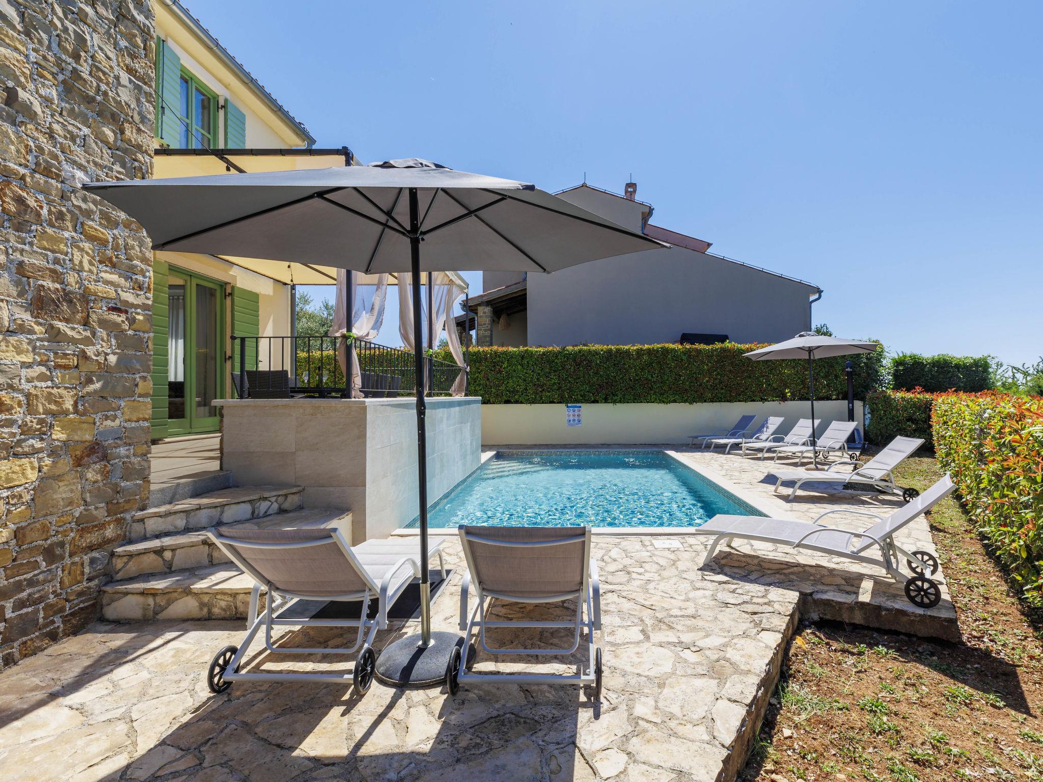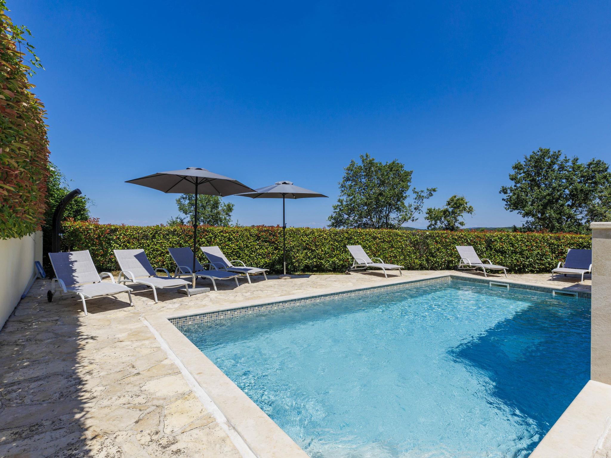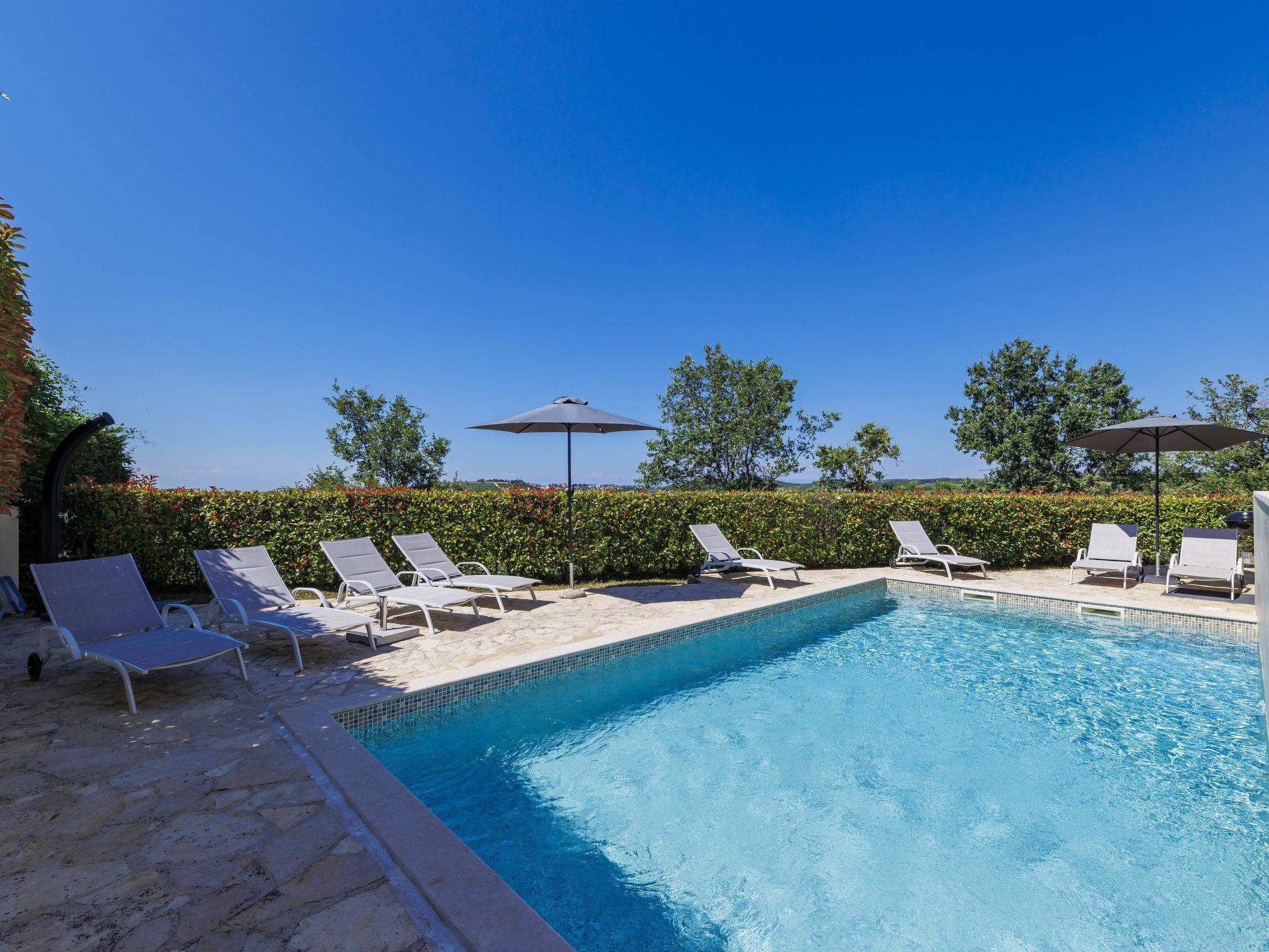 Schöne Villa "Morgan", auf 2 Stockwerken. Im Weiler Baredine, 4 km vom Zentrum von Buje, ruhige, sonnige, erhöhte Lage, 17 km vom Meer. Zur Alleinbenutzung: Grundstück 300 m2, kleiner Garten mit Rasen, Schwimmbad eckig, beheizt (8 x 4 m, 140 cm tief, saisonale Verfügbarkeit: 15.Apr. - 15.Okt.) mit Innentreppe. Aussendusche. Im Hause: Internetzugang, Waschmaschine, Wäschetrockner. Parkplatz beim Haus auf dem Grundstück. Einkaufsgeschäft 4 km, Restaurant 1 km, Bushaltestelle 4 km, Bahnstation 33 km, Kieselstrand 17 km. Tennis 16 km, Sportzentrum 16 km, Wanderwege ab Haus 1 km, Radweg 1 km. Nahe gelegene Sehenswürdigkeiten: Aquapark 19 km.