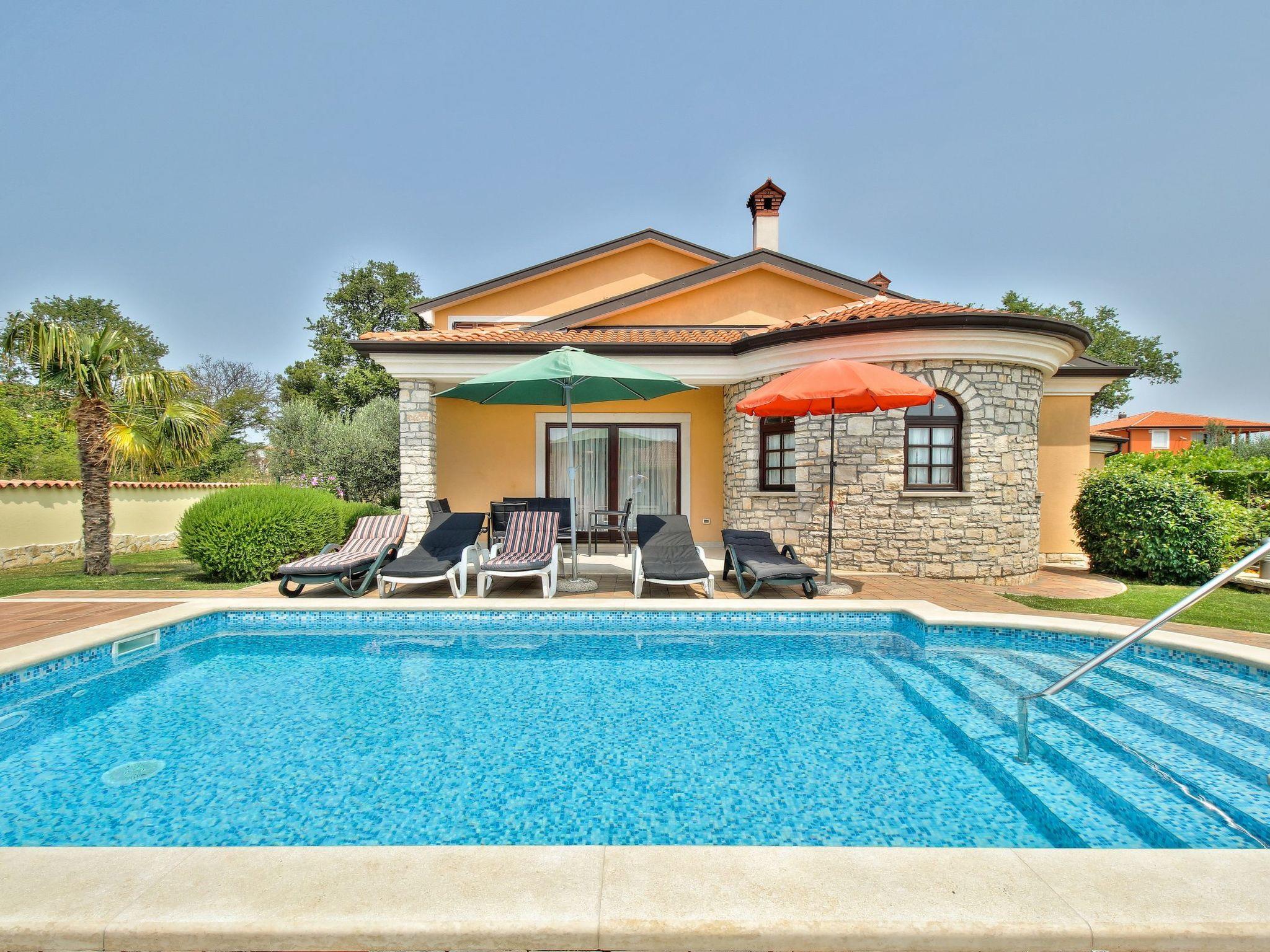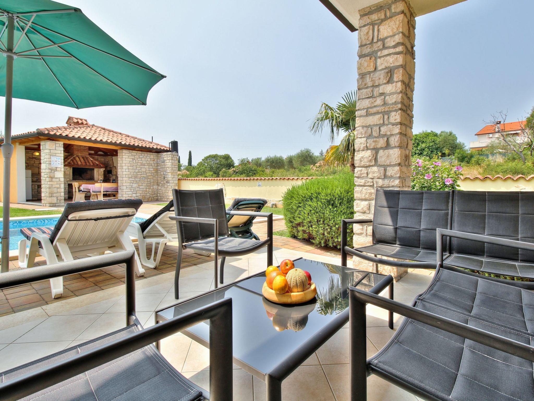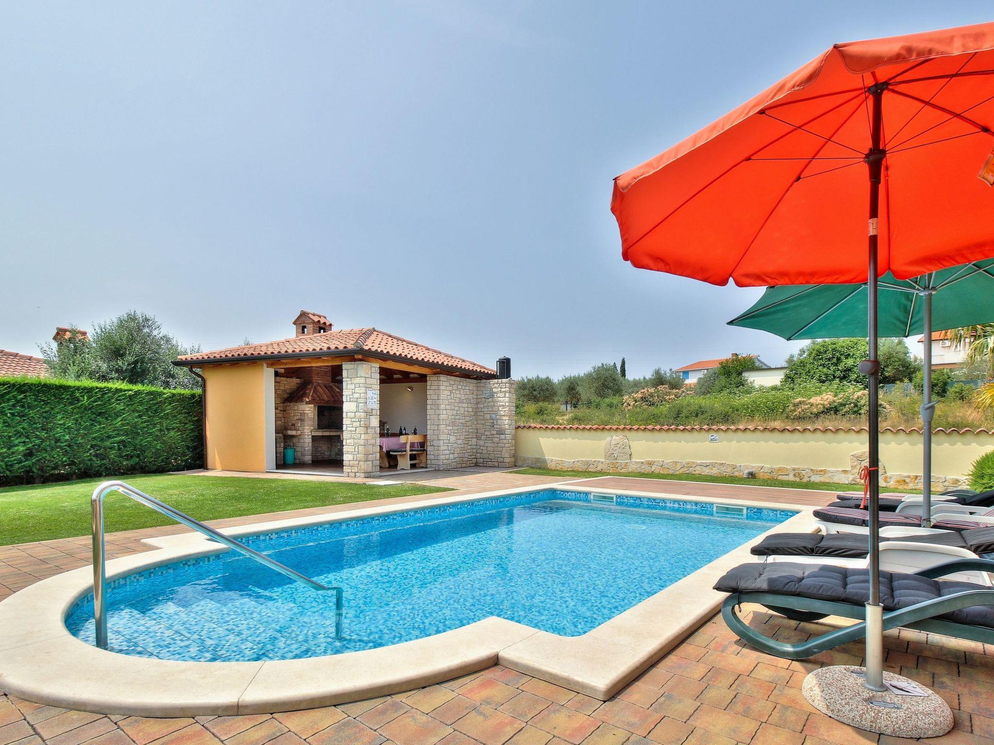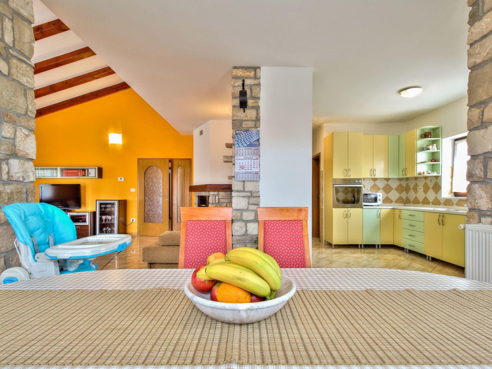 Im Erdgeschoss ist ein großer Wohnraum, eine Küche mit Esszimmer, zwei Schlafzimmer, ein Badezimmer und eine Toilette untergebracht. Im Obergeschoss befindet sich ein weiteres Schlafzimmer mit Bad und es ist durch einen separaten Eingang von außen zu betreten. Offene und mit Licht durchflutete Räume sind gemütlich und mit Liebe zum Detail eingerichtet.Ferienhaus mit Pool für 6+2 Personen (drei Schlafzimmer mit Doppelbetten, Schlafcouch für zwei Personen im Wohnzimmer). Modernes Ferienhaus in idyllischer Landschaft. Das Haus besitzt einen schönen Garten und ist mit bequemen Möbeln eingerichtet. Es ist auch gross genug für 2 - 3 Familien. Das Haus ist in Dorf Kastel 10 km von Umag