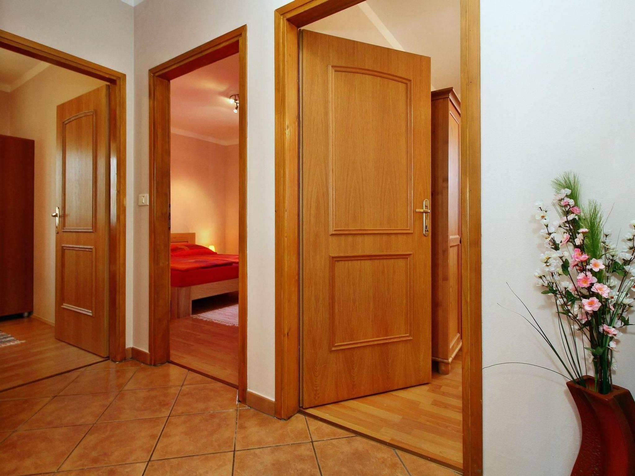 Das einstöckige Haus umfasst 120 m² Wohnfläche und teilt sich in drei behagliche Schlafzimmer mit Doppelbetten, zwei Badezimmer . Jedes Schlafzimmer ist für Ihren Komfort mit einem Kleiderschrank und Nachttischkommoden mit Leselampen ausgestattet. Der offene Wohn-, Ess-, und Kochbereich lädt zu gemeinsamen Mahlzeiten und entspannten Stunden ein. Der großzügige Esstisch, eine Eckcouch im Wohnbereich und die halboffene Küche mit modernen Geräten versprechen ein Wohlfühlerlebnis der besonderen Art. Die Badezimmer, der Flur, der Essbereich und die Küche sind gefliest, während die Schlafzimmer und der Wohnbereich mit Parkettboden ausgestattet sind, was die harmonische Atmosphäre unterstreicht.