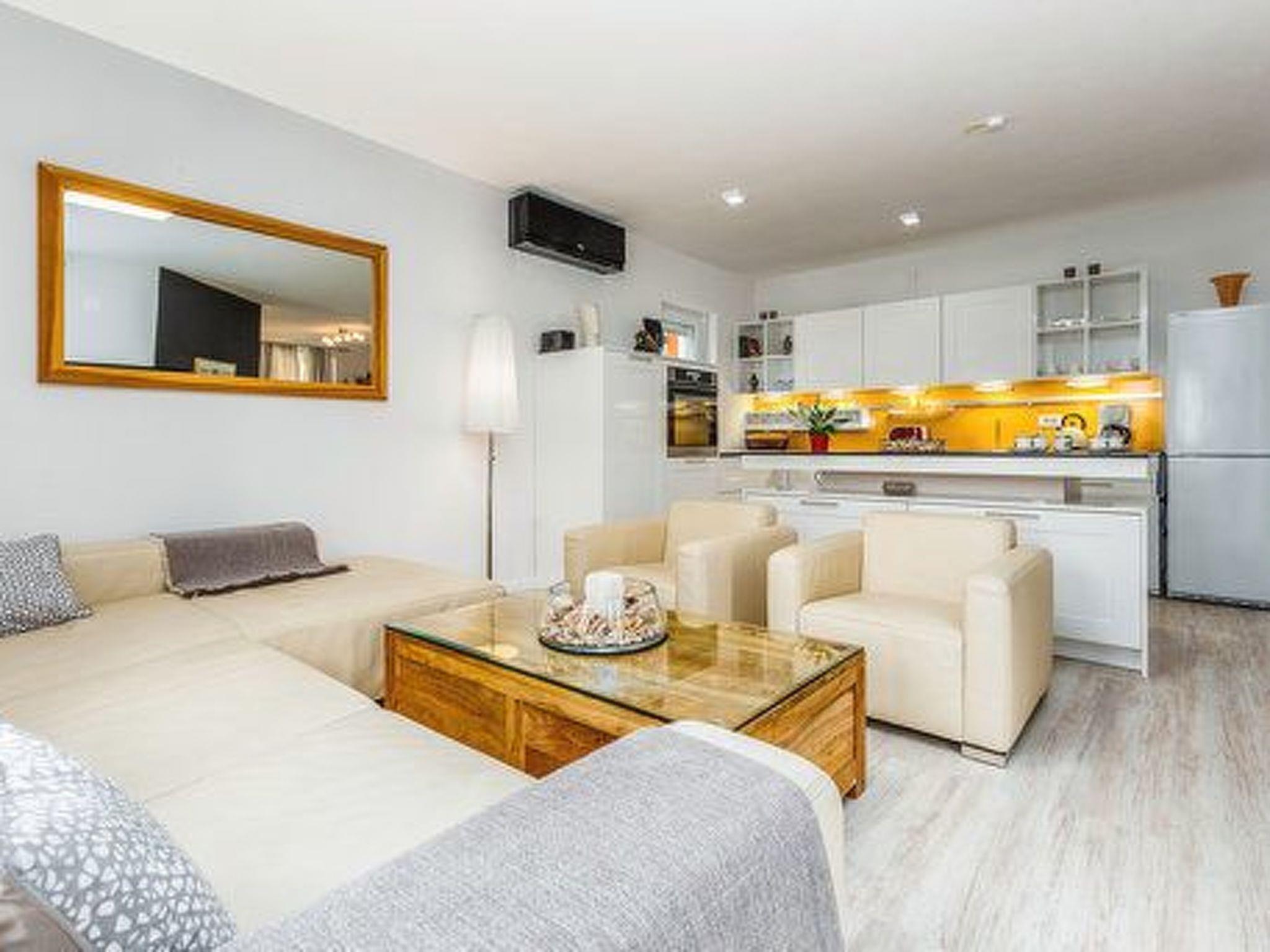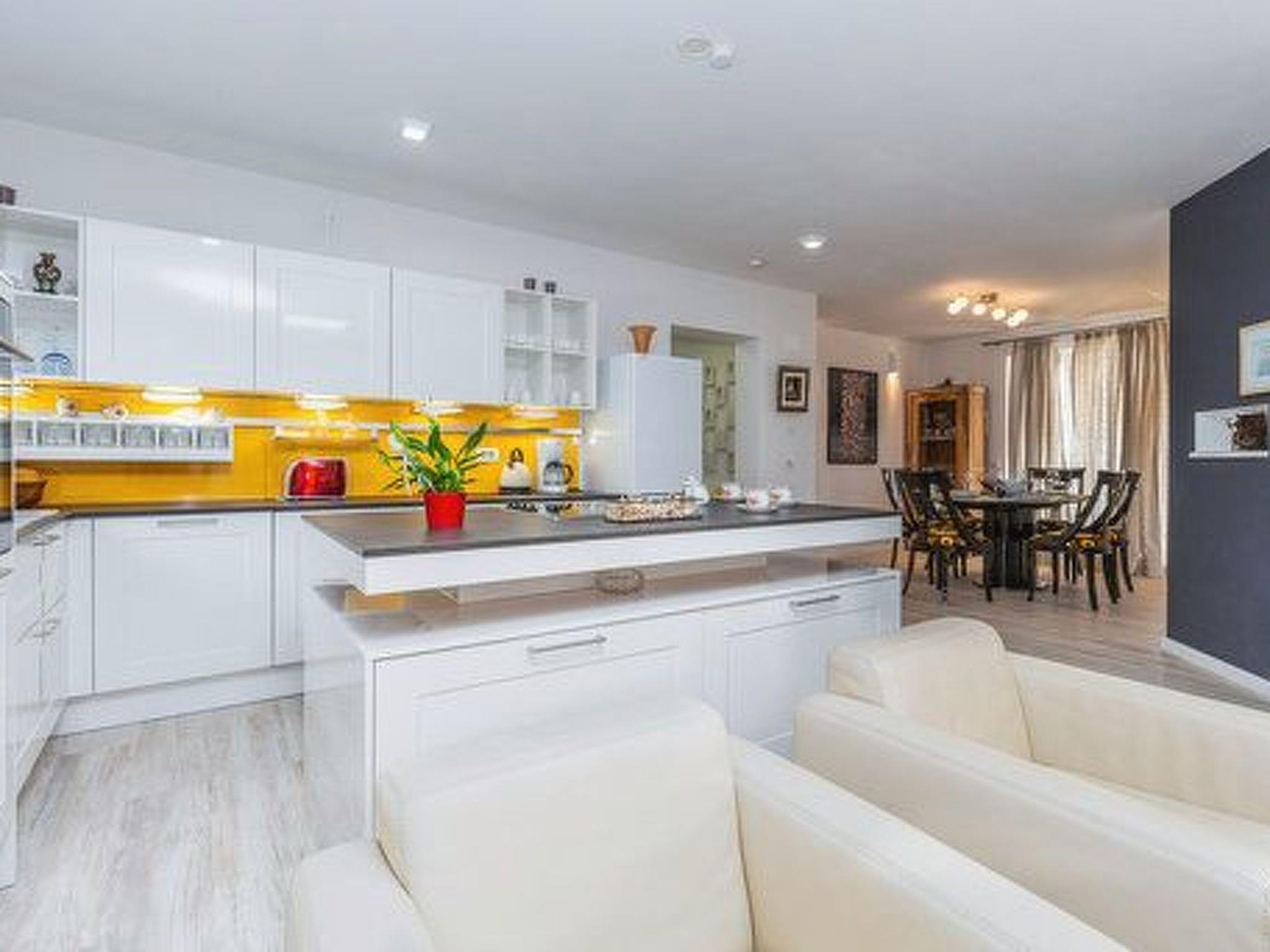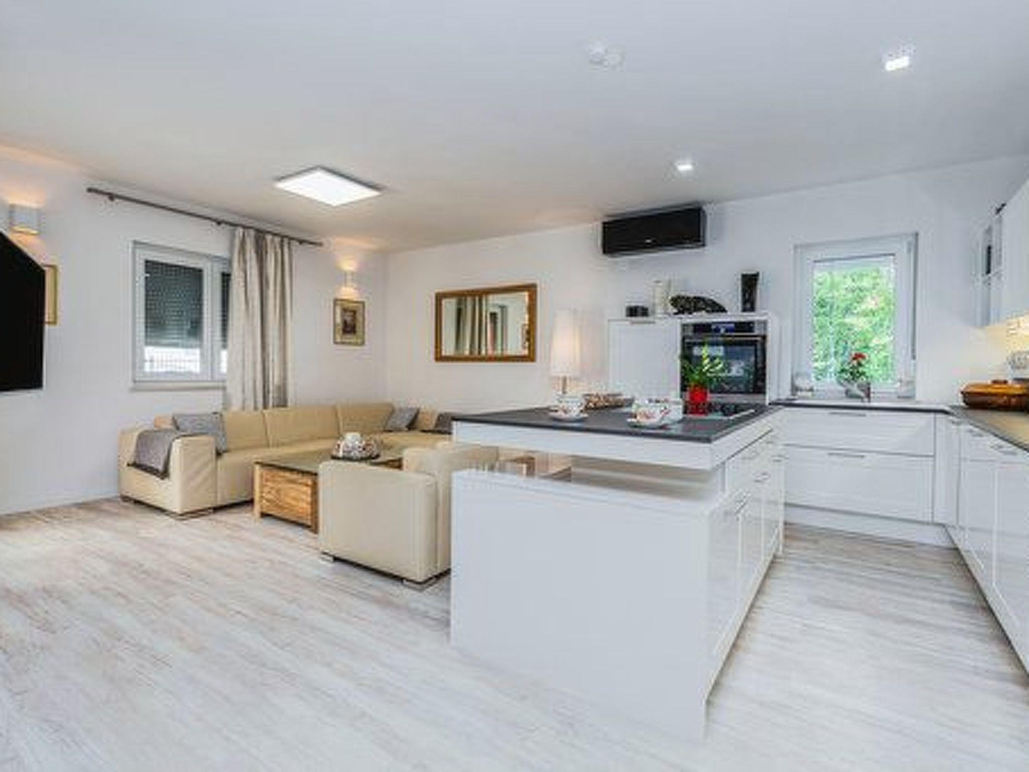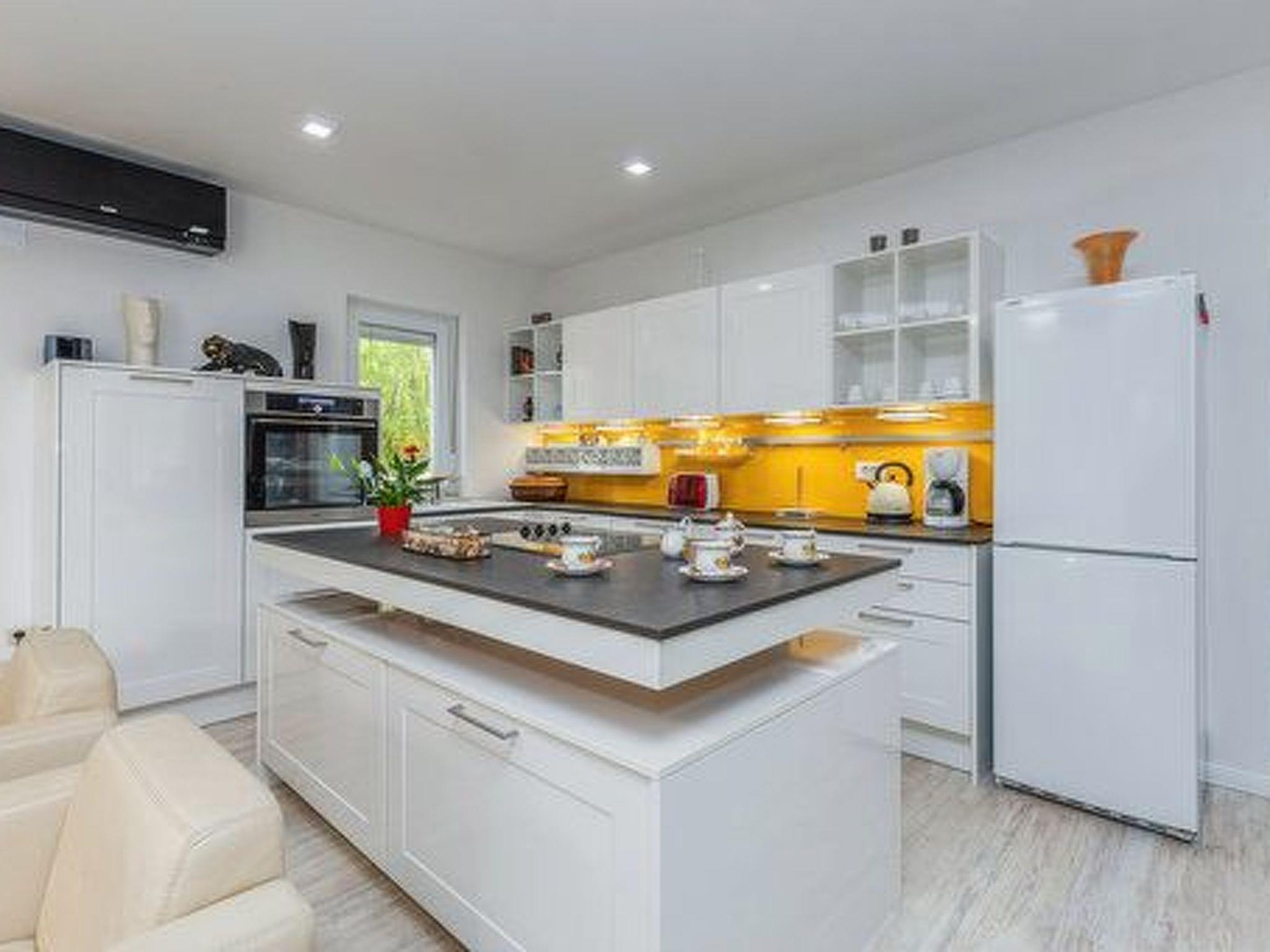 Innen beeindruckt die Villa Deni mit einer großzügigen Aufteilung über zwei Etagen, die vier Doppelzimmer mit komfortablen Betten der Größe 180 x 200 cm umfasst. Drei voll ausgestattete Badezimmer mit Dusche, davon zwei mit Doppelwaschbecken, gewährleisten Komfort und Privatsphäre für alle Gäste. Im Erdgeschoss lädt eine voll ausgestattete Küche ein, kulinarische Fähigkeiten zu entfalten, ergänzt durch einen Essbereich mit Tisch für sechs Personen und einer gemütlichen Sitzecke mit Flachbild-Sat-TV. Für die Bequemlichkeit ist die Küche mit modernen Gerätschaften wie Geschirrspüler, Backofen, Herd, Kaffeemaschine, Wasserkocher, Mikrowelle und einem Kühlschrank mit Gefrierfach ausgestattet.