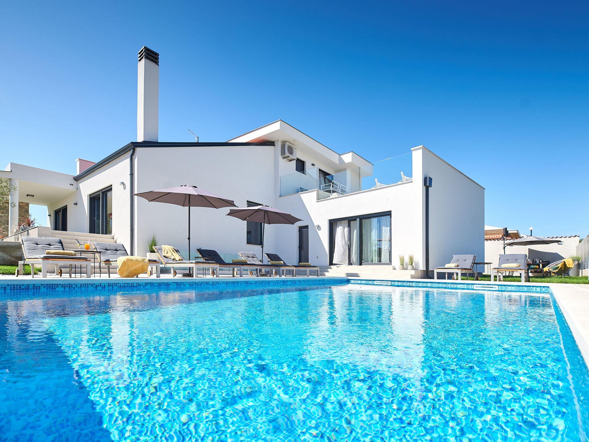Der Außenbereich ist ebenso beeindruckend, mit einem privaten Pool, der an sonnigen Tagen zur Abkühlung einlädt. Die Terrasse und die Dachterrasse der Villa bieten reichlich Platz zum Entspannen und für geselliges Beisammensein mit Blick auf den gepflegten Garten, der das Anwesen umgibt. Ob Sie sich am Pool entspannen oder einen ruhigen Moment auf dem Balkon genießen, der Außenbereich ist für ultimative Entspannung und Genuss konzipiert.