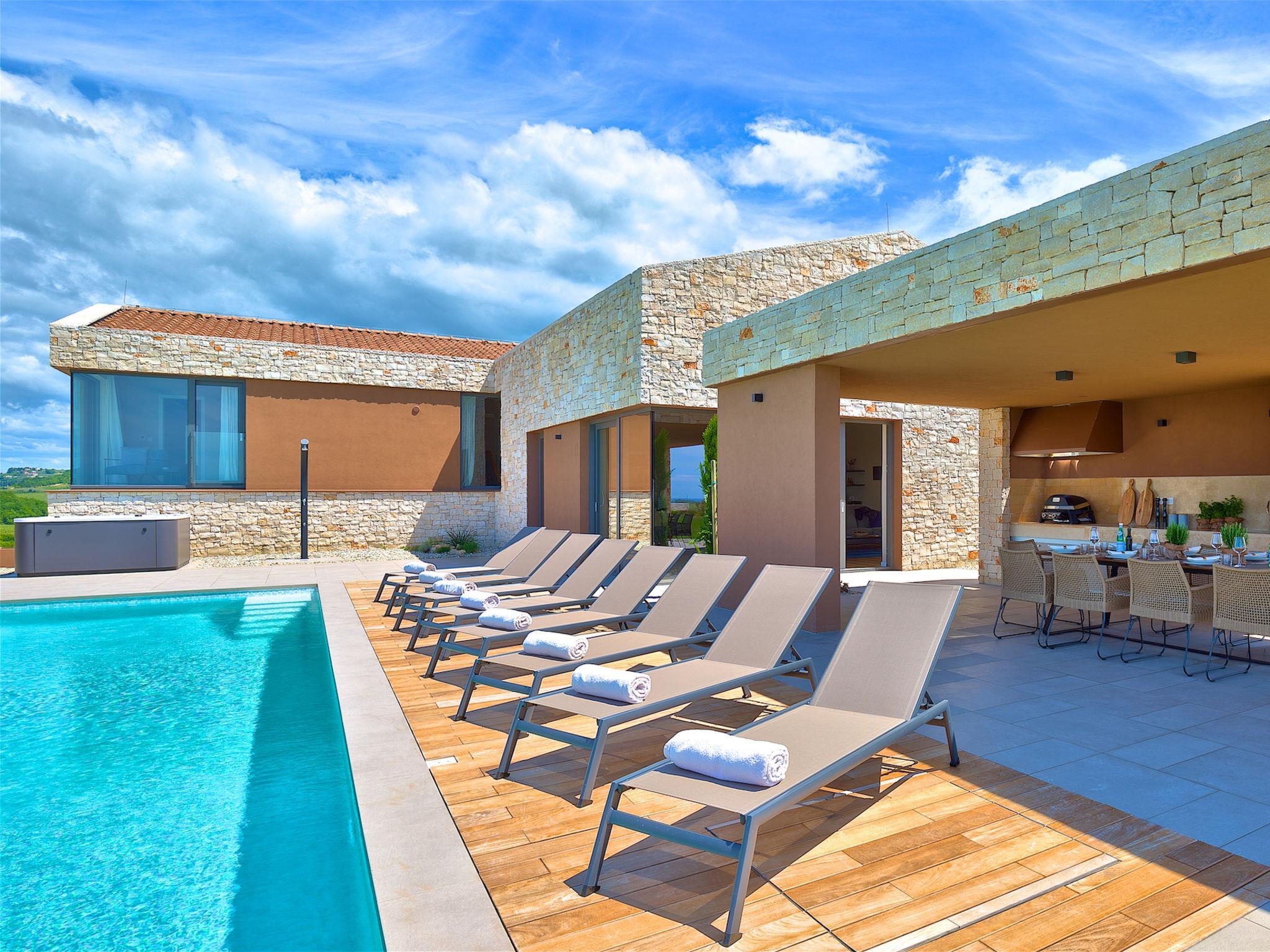 Brtonigla 6 km von Buje: Moderne, schöne Villa "Vigneto", auf 3 Stockwerken. Im Weiler Monte Marzari, 1.2 km vom Zentrum von Brtonigla, 10 km vom Zentrum von Novigrad, 13 km vom Zentrum von Umag, sonnige Lage, 8 km vom Meer. Zur Alleinbenutzung: Grundstück 2'000 m2 (eingezäunt), Garten mit Rasen 1'600 m2, Schwimmbad eckig, beheizt (41 m2, 150 cm tief, saisonale Verfügbarkeit: 01.Jan. - 31.Dez.) mit Innentreppe. Aussendusche, Sprudelbad, Tischtennis, Kinderspielplatz (Rutschbahn, Schaukel). Im Hause: Internetzugang, Tischfussball, Klimaanlage, Alarmanlage, Waschmaschine, Wäschetrockner. Zur Verfügung: Fahrräder (4). Parkplatz (für 4 Autos) beim Haus auf dem Grundstück. Einkaufsgeschäft 1.2 km, Supermarkt 6.4 km, Restaurant 1 km, Bushaltestelle 1.4 km, Kieselstrand 8 km, Tauchzentrum 8 km. Minigolf 11 km. Nahe gelegene Sehenswürdigkeiten: Aquapark 5.2 km. Schwimmbad beheizt (extra). Bitte teilen Sie uns mindestens 7 Tage vor Anreise mit, ob eine Poolheizung erforderlich ist.