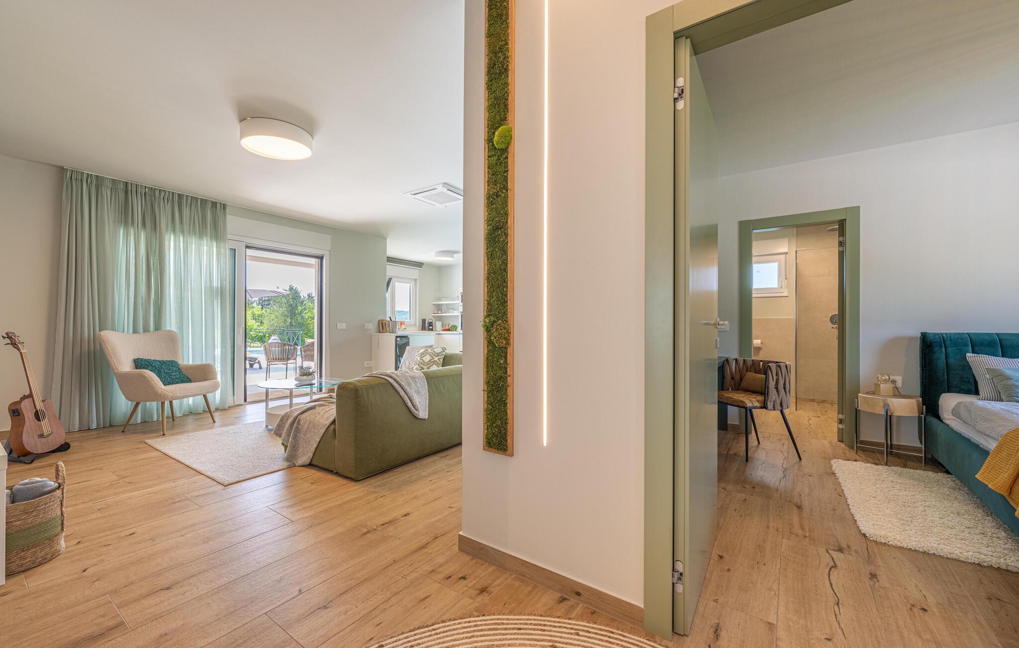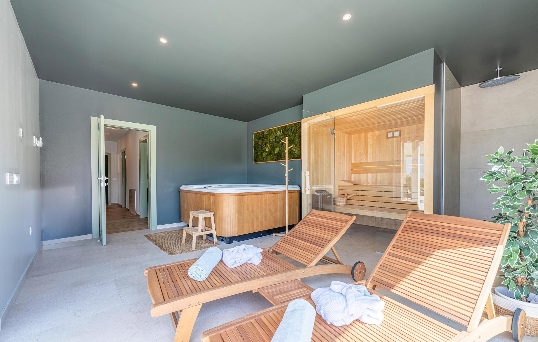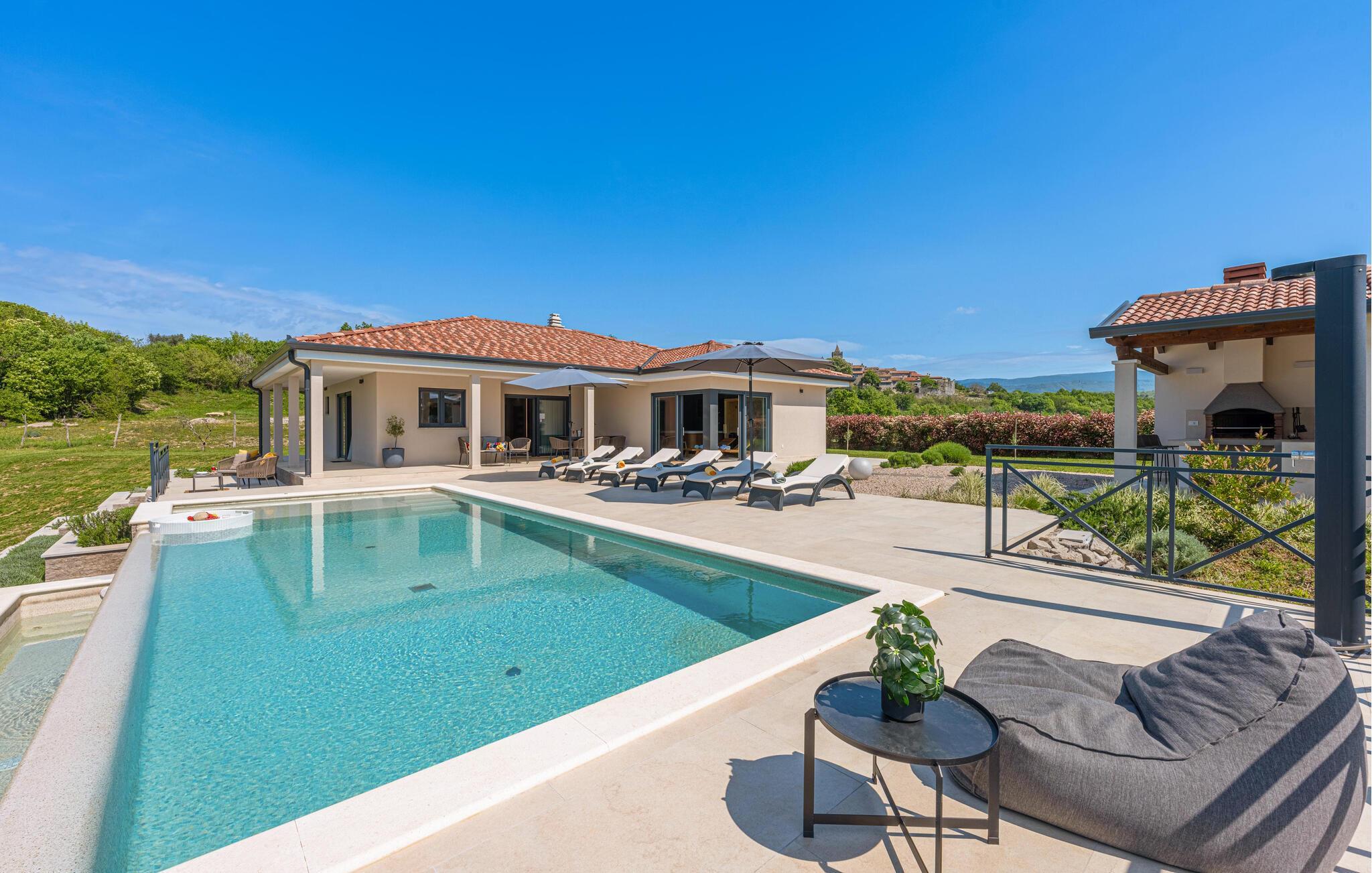 Gönnen Sie sich mit Freunden oder Ihrer Familie einen erholsamen Urlaub in diesem schönen Haus, das Sie in einer herrlichen Lage mit Landschaftspanorama begrüßt. Fühlen Sie sich hier wie zuhause und genießen das geschmackvolle Ambiente, das Sie mit weichen Farben und hochwertiger Einrichtung die perfekte Umgebung zum Ausruhen bietet. Wellness wird hier großgeschrieben und bietet Ihnen im Inneren des Hauses eine Sauna sowie Whirlpool. Kommen Sie später auch im offen gestalteten Wohnzimmer zusammen, faulenzen auf dem Sofa oder bereiten einen Snack in der Küche zu. Treten Sie hinaus auf die Terrasse und verbringen den Nachmittag auf den Sonnenliegen und im Pool und lassen das grüne Panorama auf sich wirken.