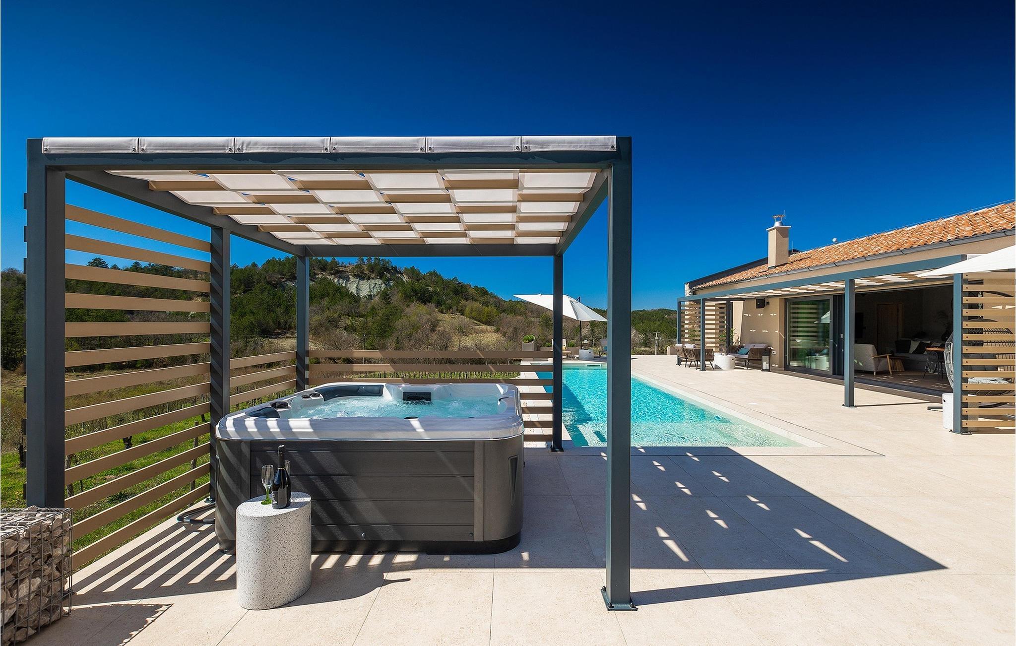 Das weitläufige Grundstück der Villa erstreckt sich über 1750 m² und lädt Sie ein, die friedliche Umgebung zu erkunden und in sie einzutauchen. Durch die vollständige Umzäunung ist Ihre Privatsphäre gewährleistet, sodass Sie sich vollkommen entspannen können. Für zusätzliche Entspannung können Sie in der Sauna entspannen oder im Whirlpool direkt am Pool auf der Terrasse baden. Rund um den Pool finden Sie bequeme Liegestühle – perfekt zum Sonnenbaden oder zum Genießen eines guten Buches bei Ihrem Lieblingsgetränk.