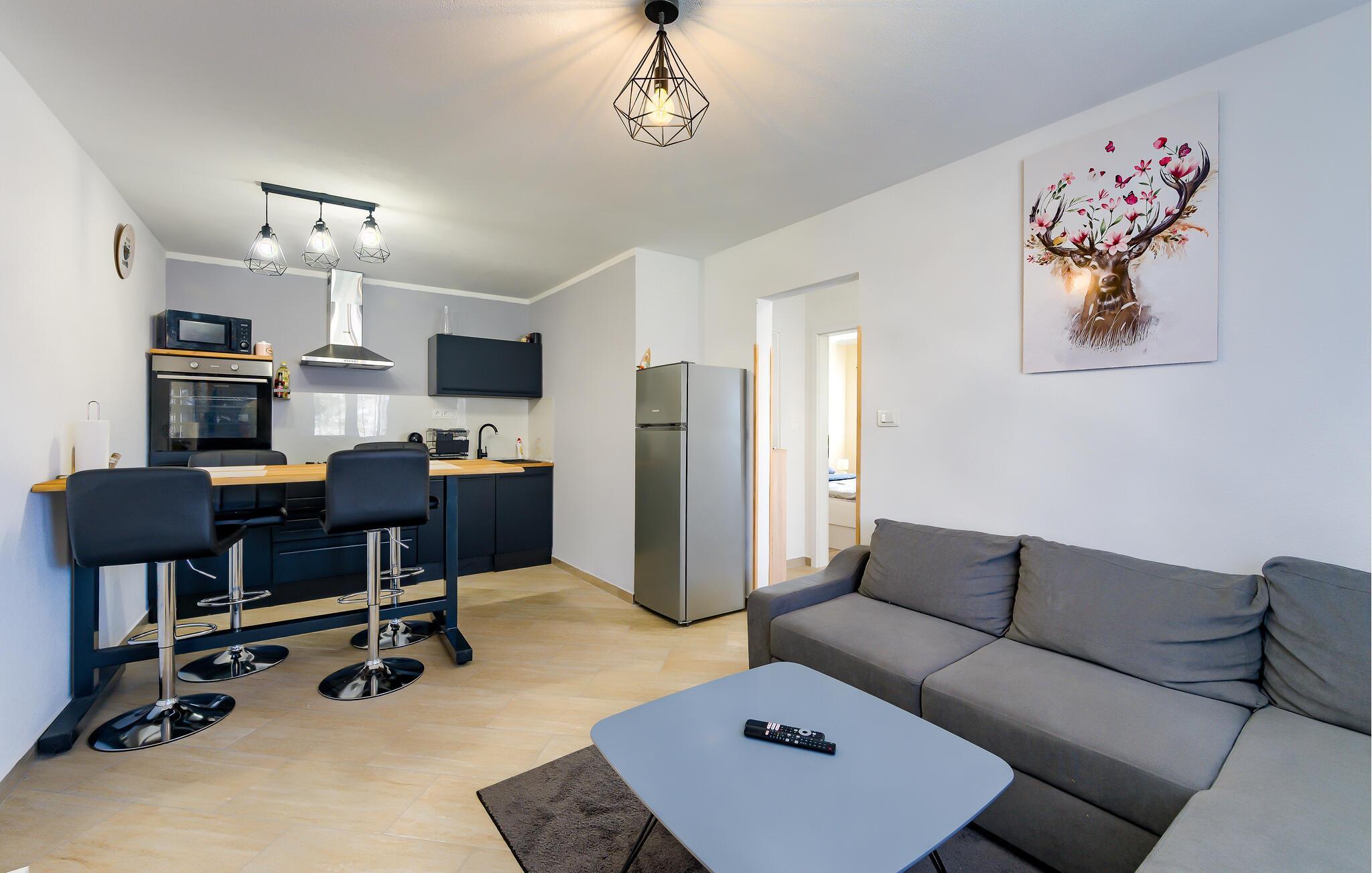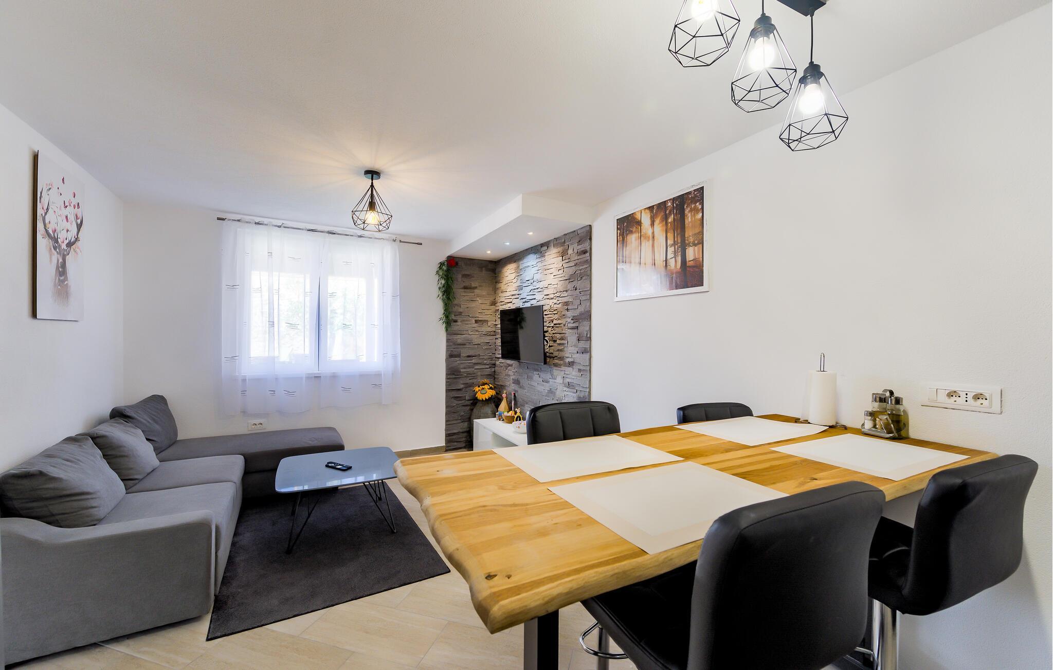 Eingebettet in das idyllische Dorf Semic lädt Sie dieses modern und komfortabel eingerichtete Ferienhaus zu einer erholsamen Auszeit mit Ihren Liebsten ein. Zaubern Sie Ihre Lieblingsgerichte in der offenen Küche und planen Sie Ihre Unternehmungen am einladenden Esstisch. Nutzen Sie das großzügige Sofa für gemütliche Spieleabende oder entspannte Lesestunden.