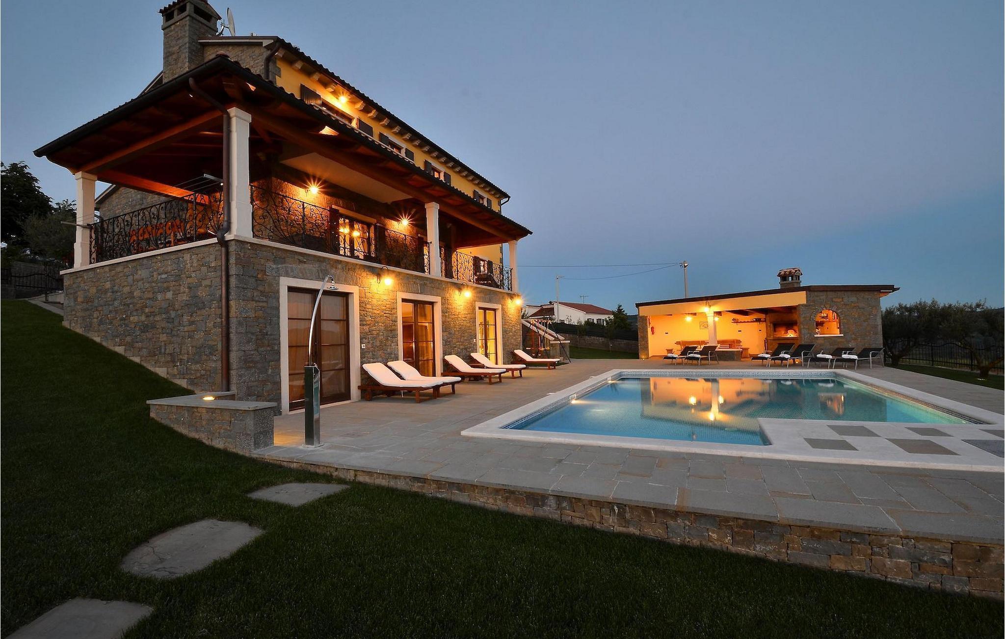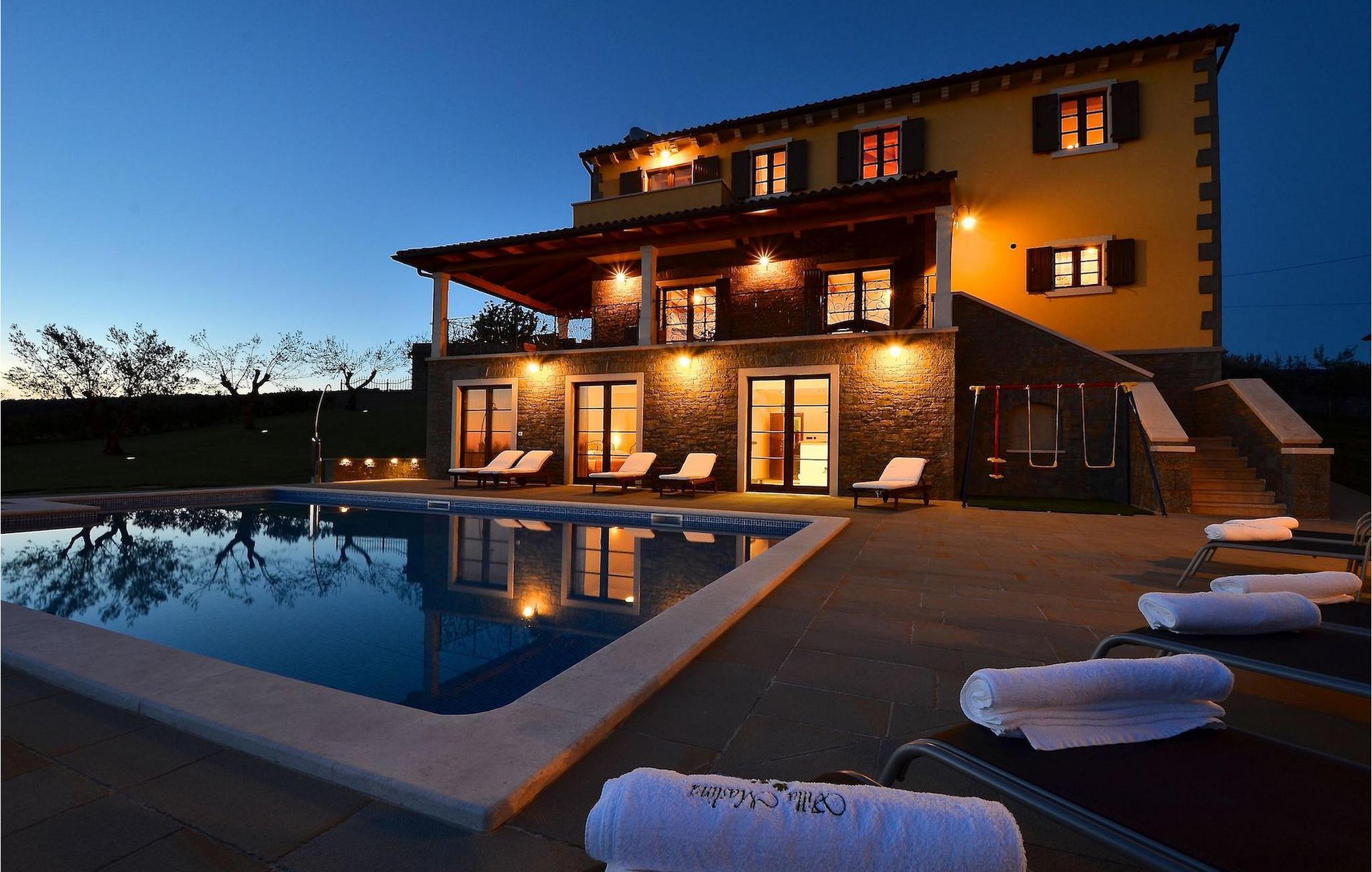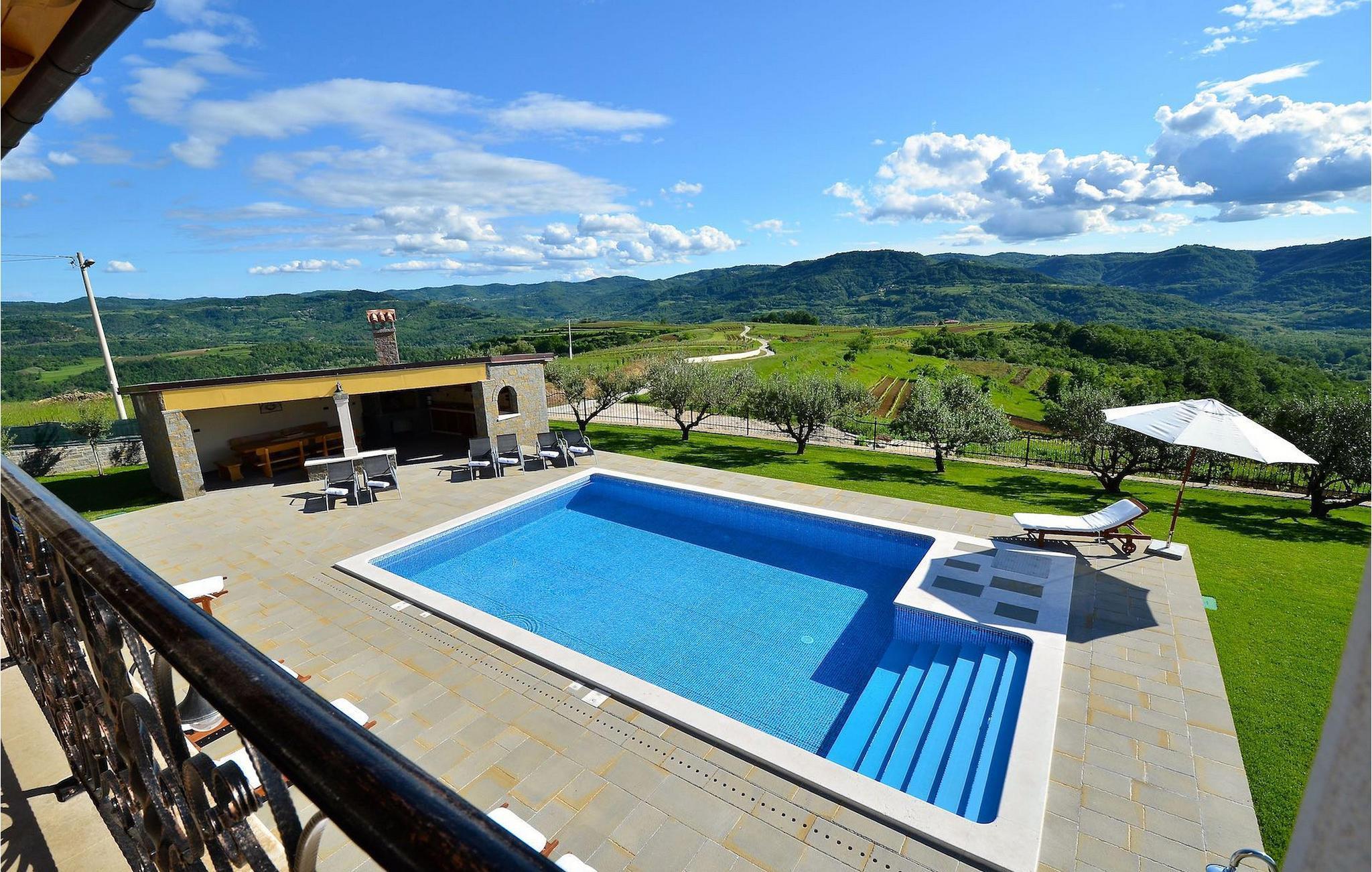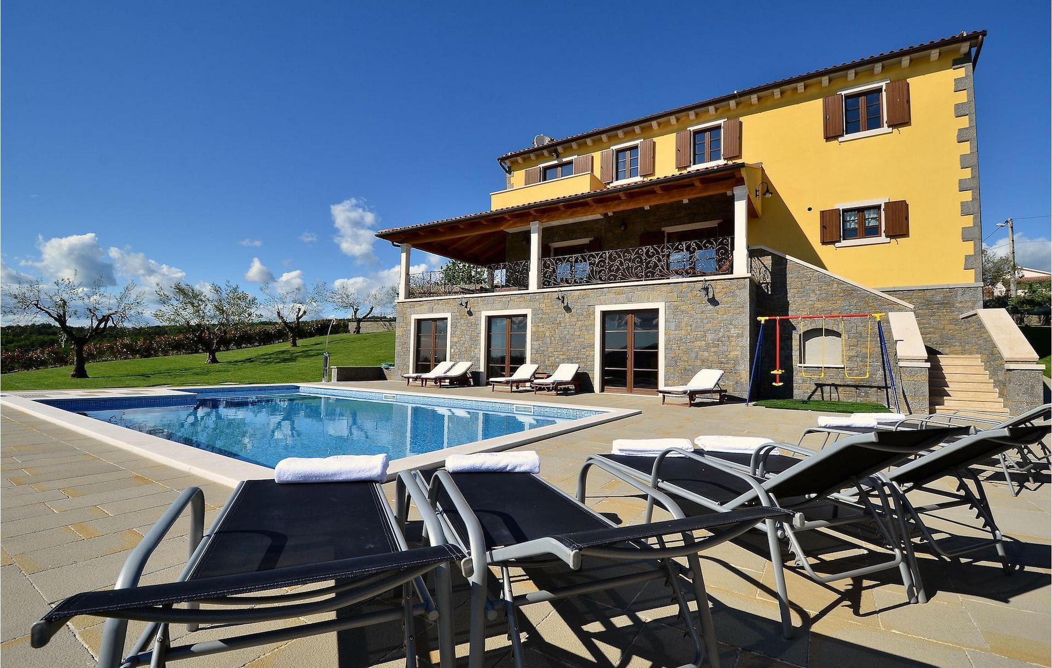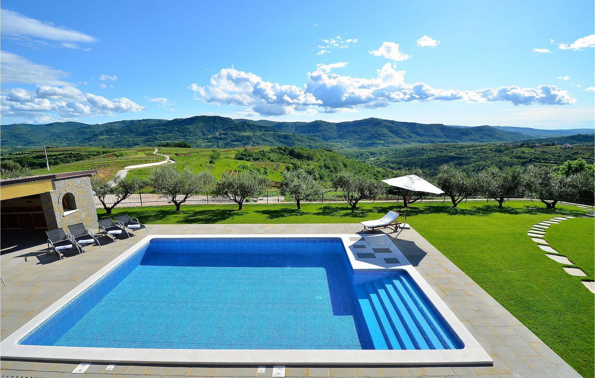Wenn Sie sich nach einer Erfrischung in den heißen Sommermonaten sehnen, gibt es einen 50 m2 großen Pool Hydro-Massagepumpen. Sie können etwas Sonne tanken auf einem der zwölf Liegestühle und wenn Sie einen weniger isolierten Ort wünschen, nehmen Sie sich einen der Olivenbäume, die Ihnen etwas Schatten spenden können. Während Sie sorglos den Blick auf den See und die umgebenden hundert Jahre alten Bäume genießen, können Ihre jüngsten sich im Sandkasten, auf der Wippe oder den Schaukeln vergnügen. Im Garten befindet sich auch eine überdachte Außenküche mit einem Grill, einem Gasherd, 1 Waschbecken, 1 Kühlschrank und einem Tisch für zwölf Personen. Hier können Sie selbst eine istrische Spezialität zubereiten oder auf professionelle Hilfe vertrauen.
