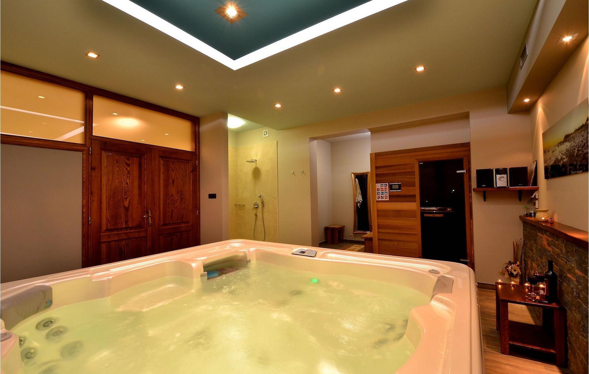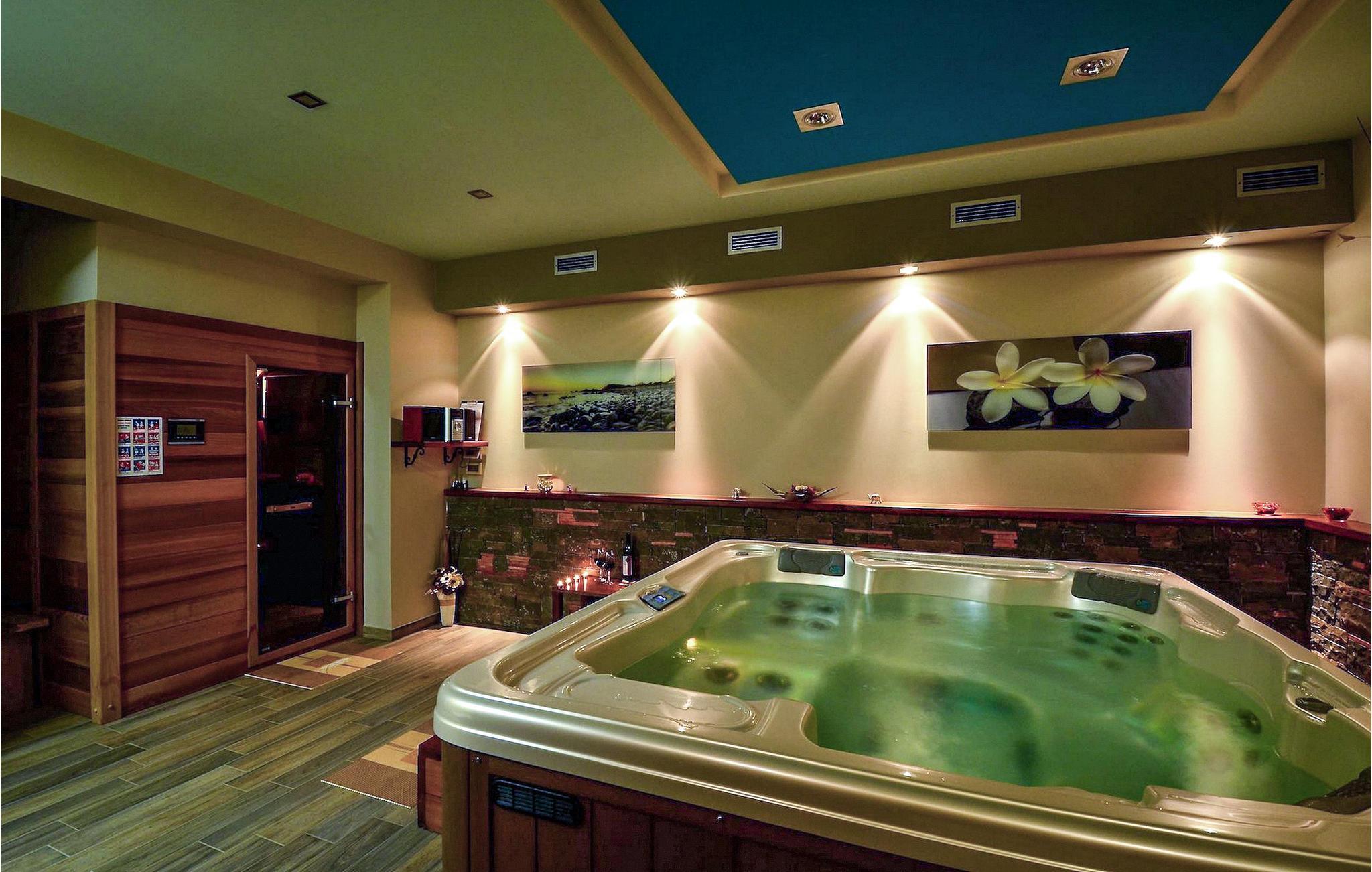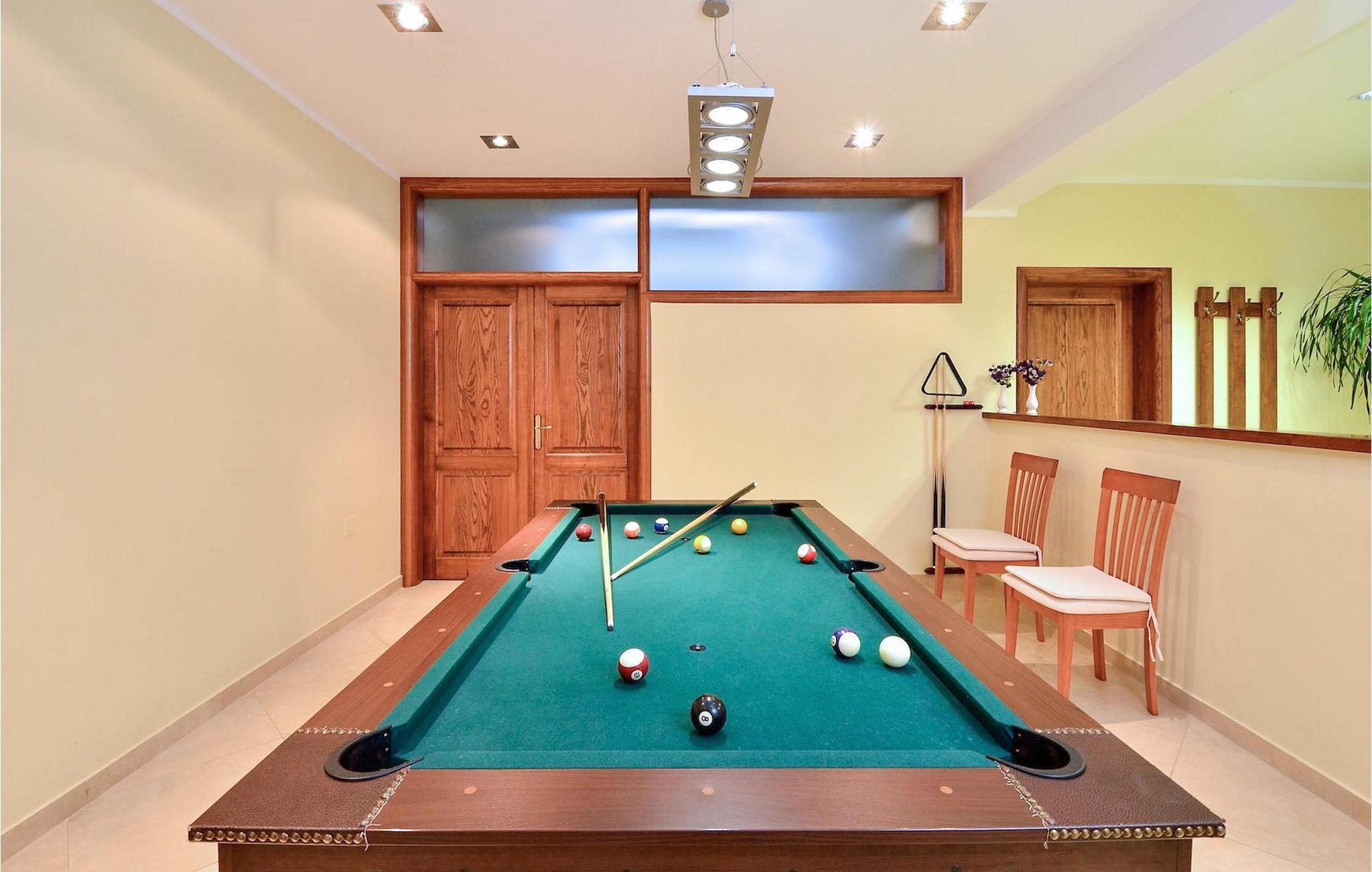 Das Erdgeschoss ist zur Erholung, zum Zeitvertreib und zur Entspannung reserviert. Nichts wird dem Zufall überlassen. Hier wird sich um alle Generationen gekümmert. Für die jüngsten gibt es eine Kinderecke während es für die Älteren ein Zimmer zur Entspannung gibt - einen Wellnessbereich mit einem Whirlpool für vier Personen und einer finnischen Sauna. Auf diesem Stock befindet sich auch ein Billardtisch und eine Dartscheibe sowie ein Übungsbereich mit einem direkten Zugang zum Pool. Ihnen steht auch eine Waschküche zur Verfügung.