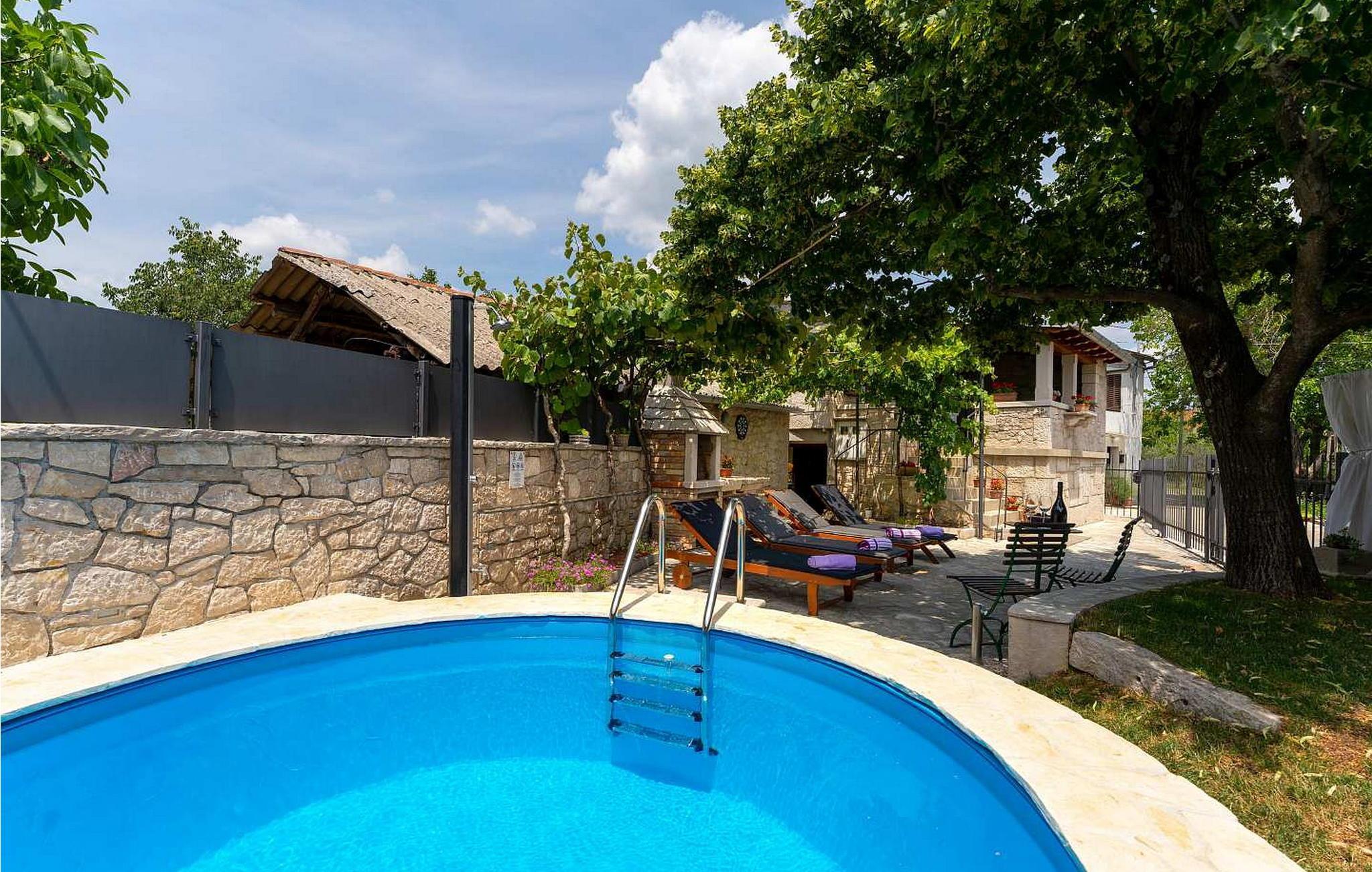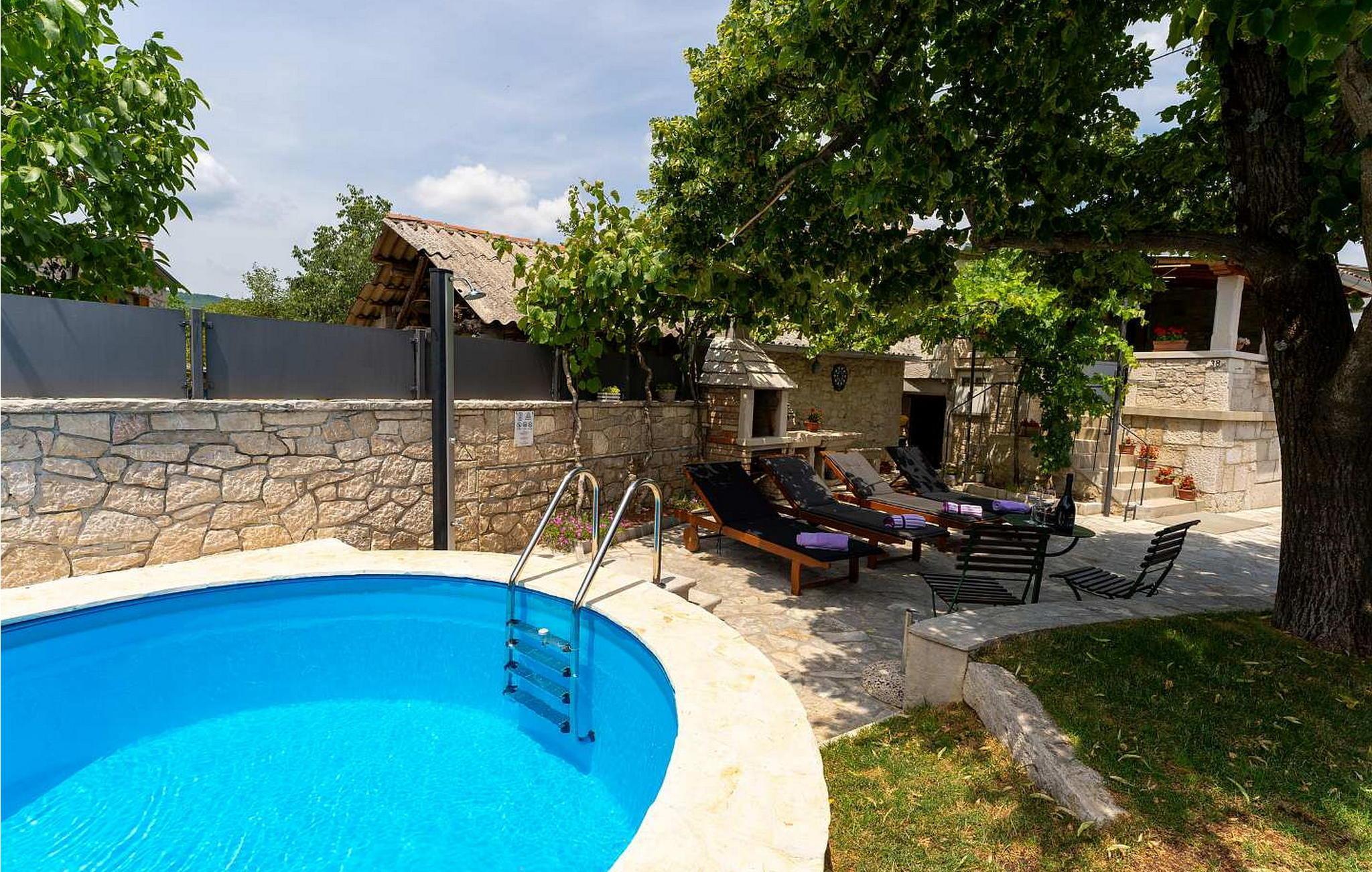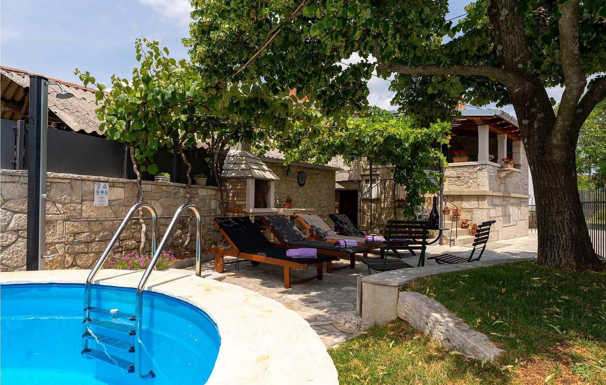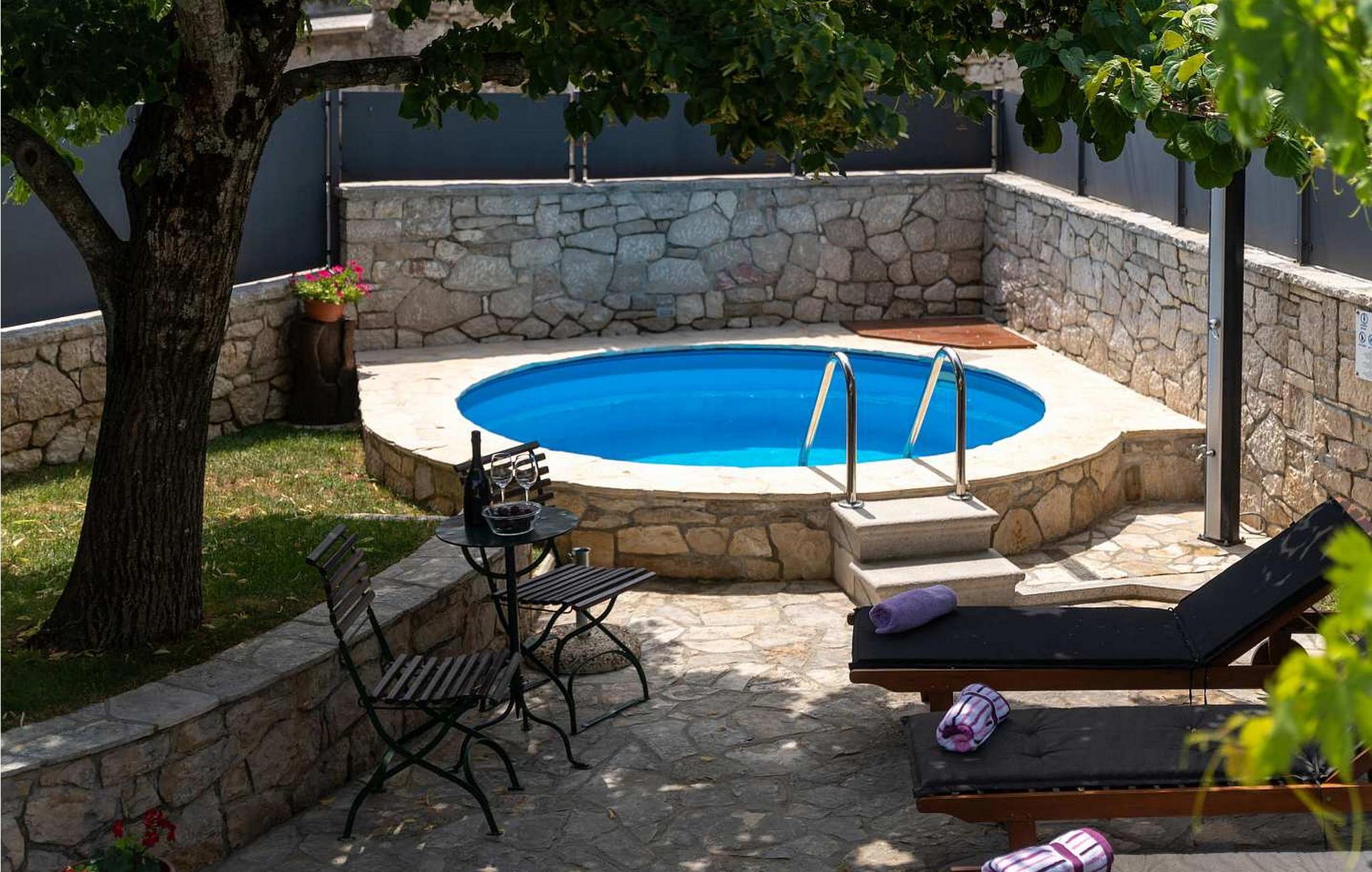 Auf eigenem umzäuntem Grundstück befindet sich ein Pool, Liegestühle, Grill, Außendusche und die Gäste genießen den natürlichen Schatten unter den Lindenbaum und der Weinrebe. Von der Außenseite ist der Eingang in die Wascherei mit Waschmaschine, Bügeleisen und -brett und einer Dusche/WC.